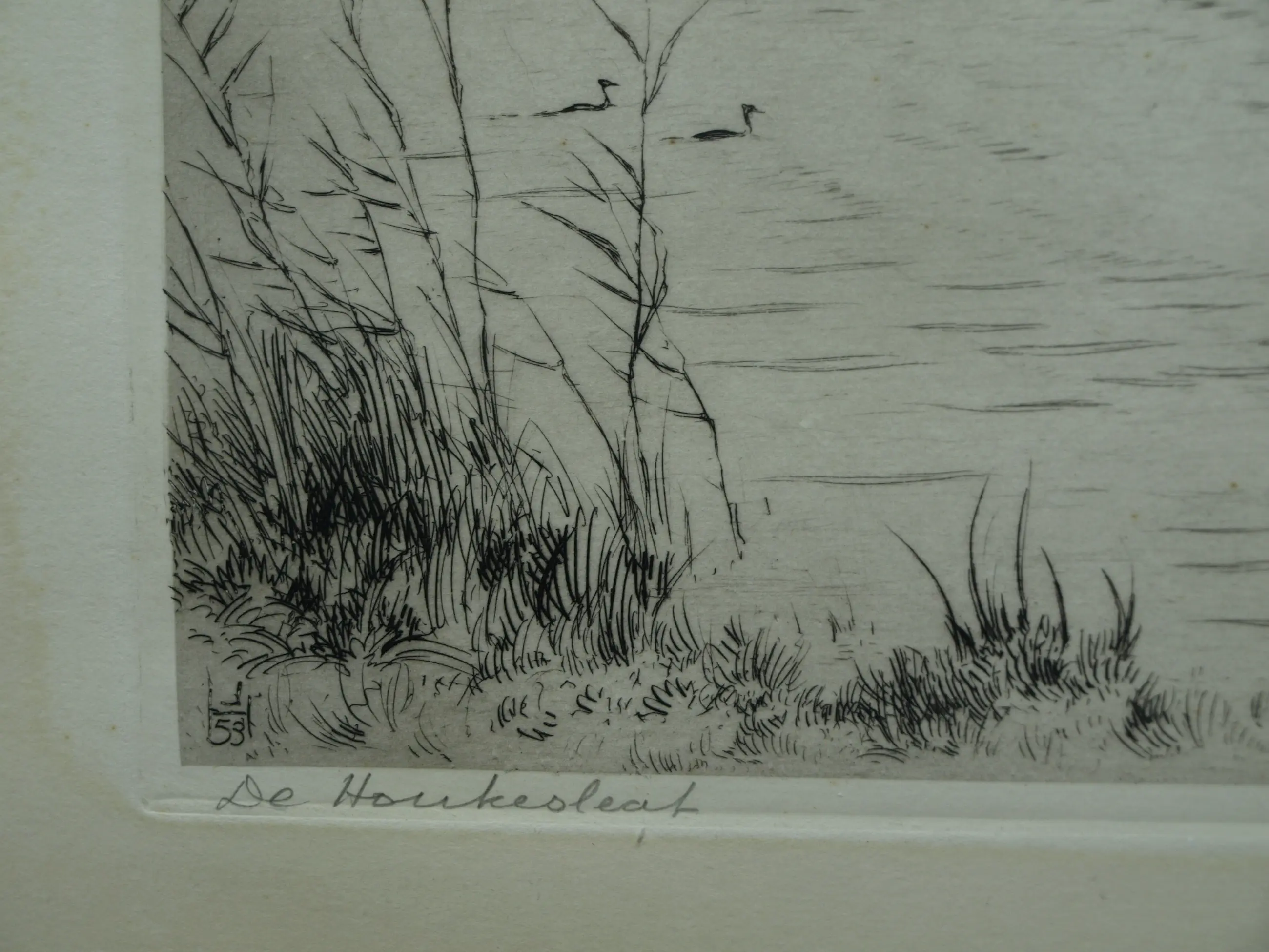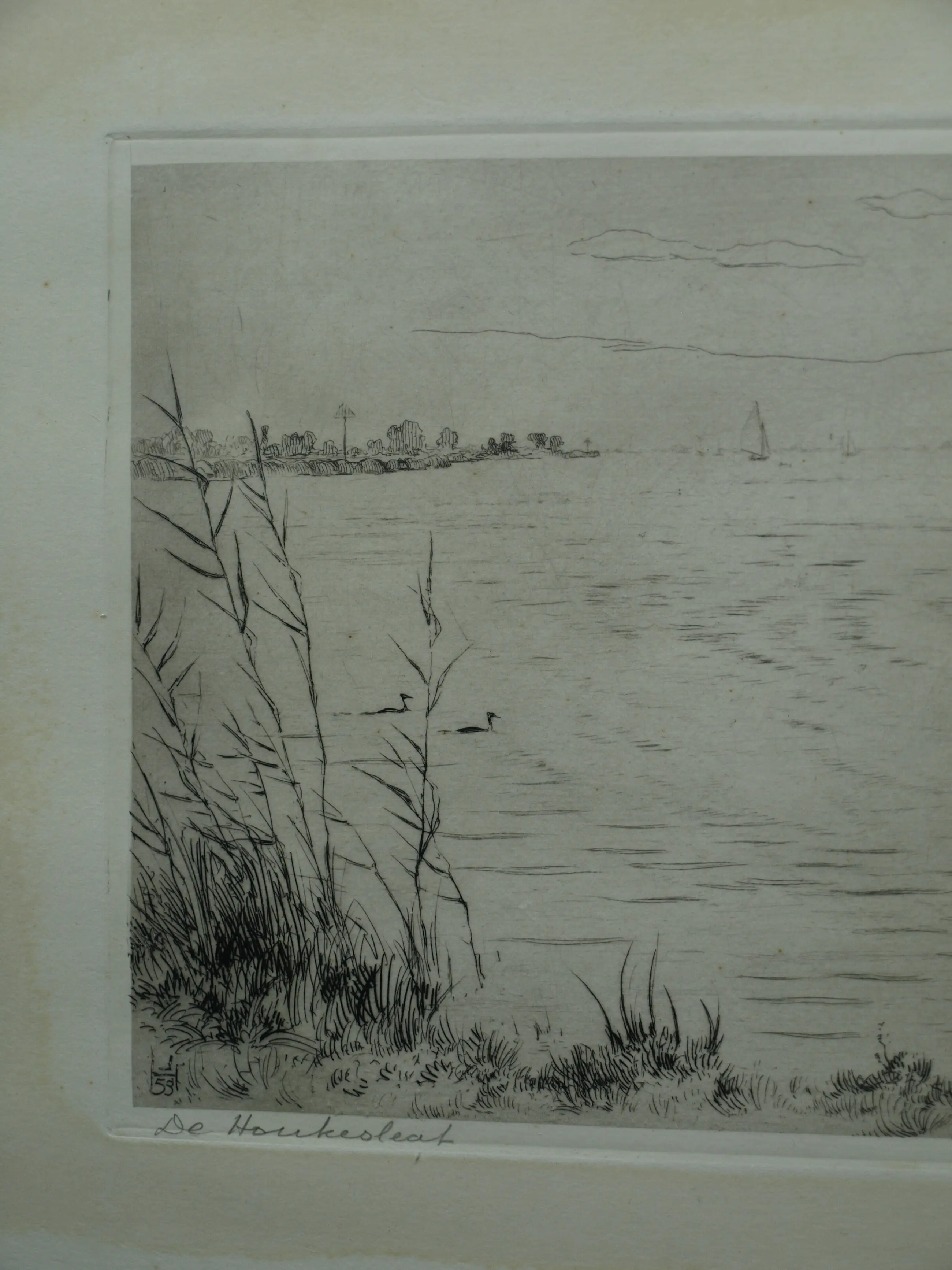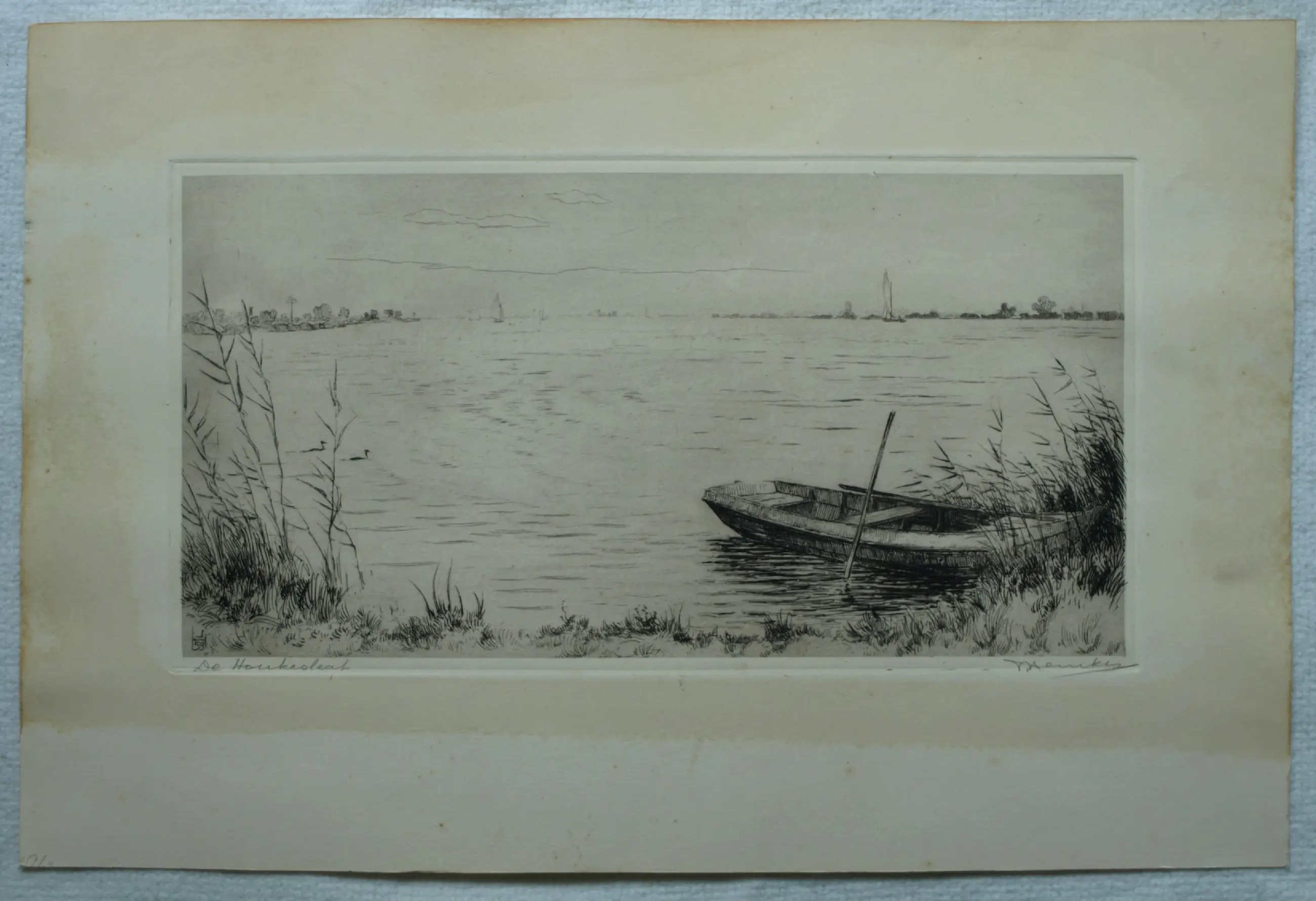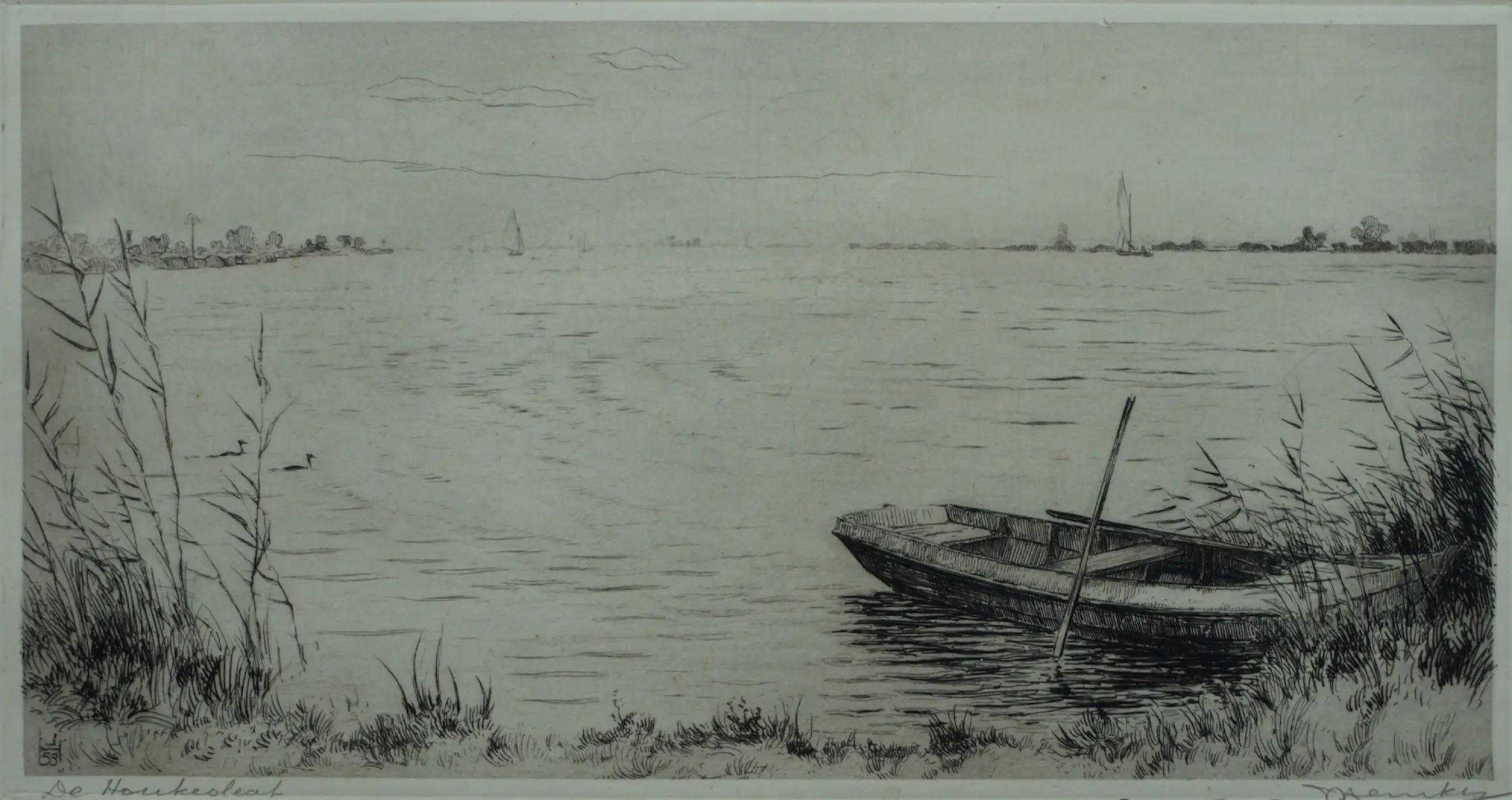 Een ets uit 1959 van de Friese kunstenaar Johan Hemkes (1894-1988), getiteld “De Houkesleat”. -Handgesigneerd en -getiteld met potlood. Linksonder in de plaat gedateerd (’59) en met het monogram van de kunstenaar (‘J H’). -Afmetingen: Blad, 30 x 45 cm. Beeld / ets, 18 x 34 cm. -Herkomst: Uit een inboedel. -Conditie: De ets is in goede staat. Het blad is (buiten beeld) licht vergeeld. Zie ook alle foto’s voor een eigen indruk.