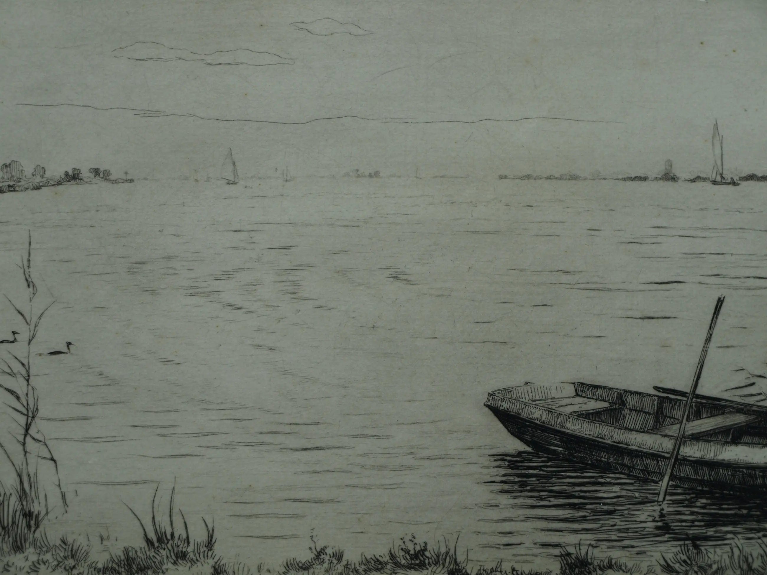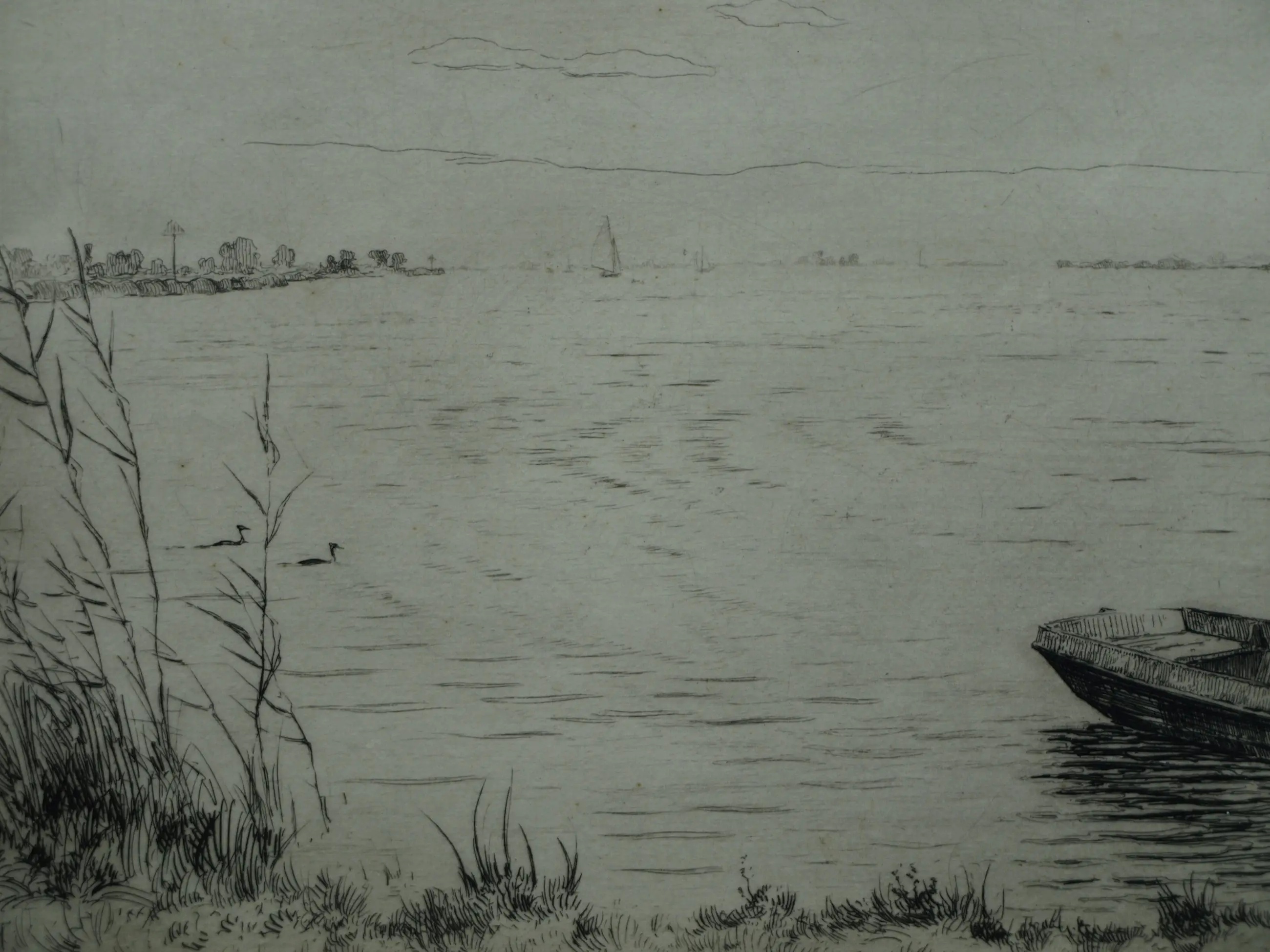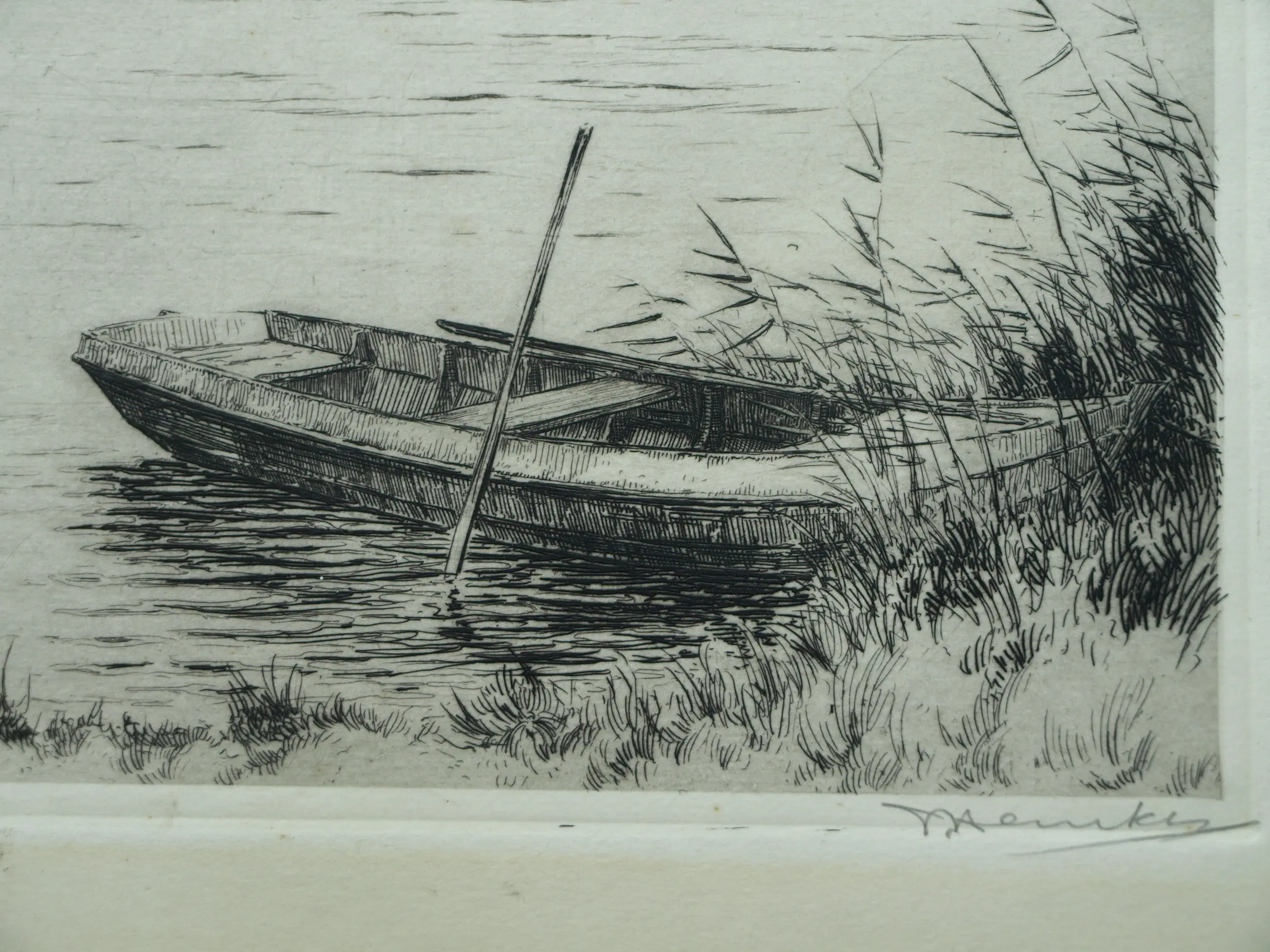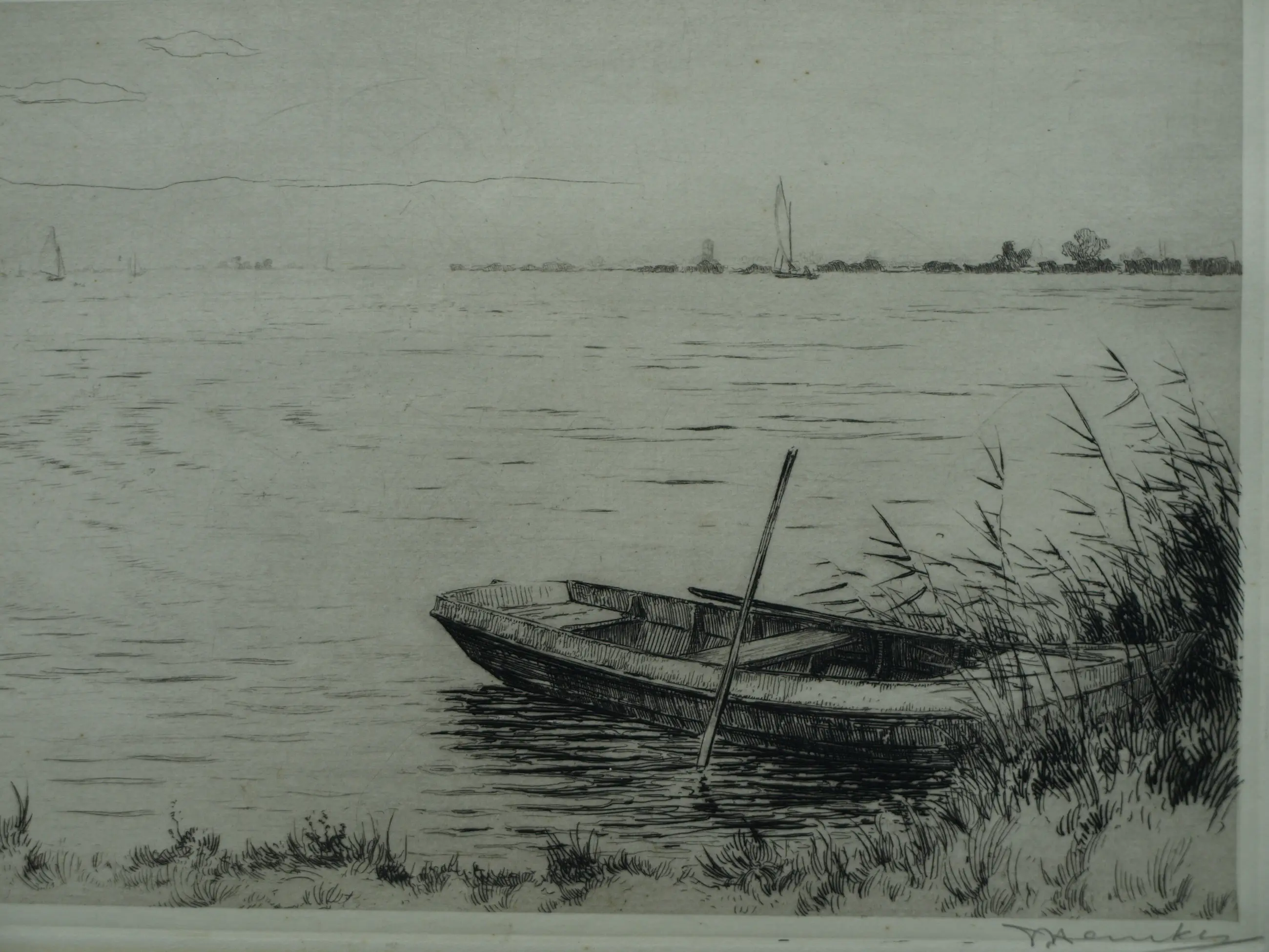 Een ets uit 1959 van de Friese kunstenaar Johan Hemkes (1894-1988), getiteld “De Houkesleat”. -Handgesigneerd en -getiteld met potlood. Linksonder in de plaat gedateerd (’59) en met het monogram van de kunstenaar (‘J H’). -Afmetingen: Blad, 30 x 45 cm. Beeld / ets, 18 x 34 cm. -Herkomst: Uit een inboedel. -Conditie: De ets is in goede staat. Het blad is (buiten beeld) licht vergeeld. Zie ook alle foto’s voor een eigen indruk.