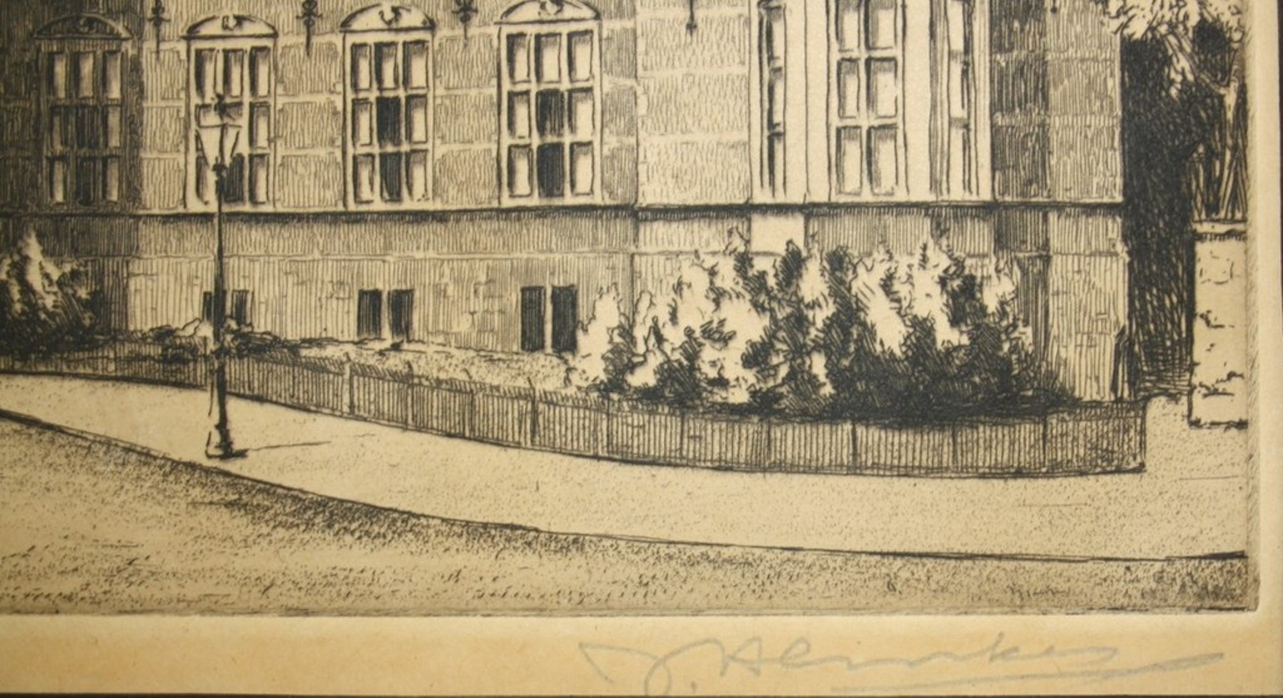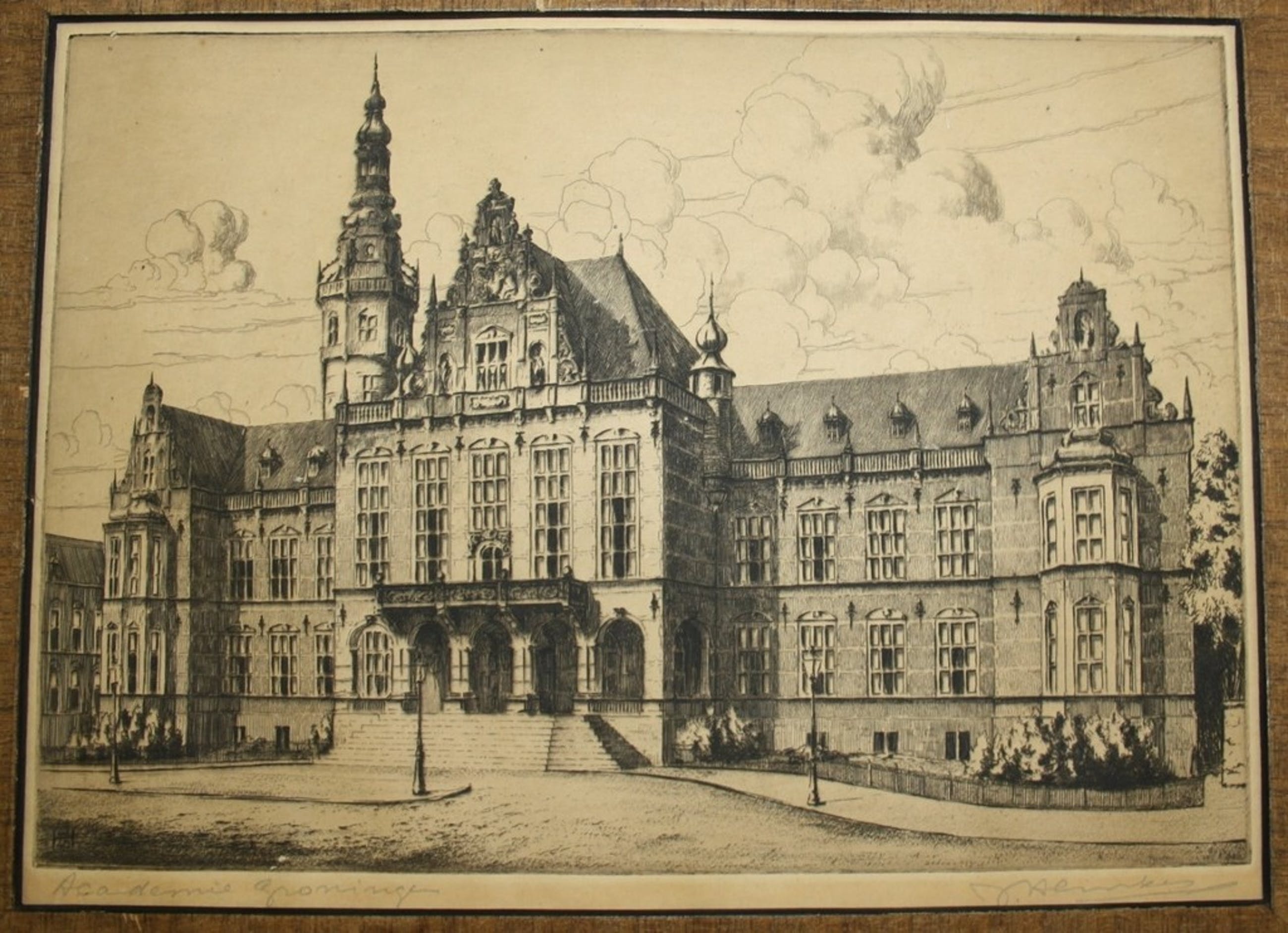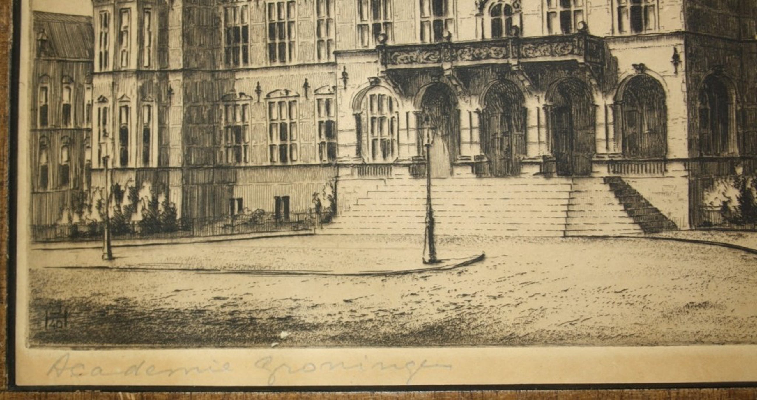 Leuke ets van de Academie in Groningen. Ets uit 1940. Beeldmaat 26,5 cm x 19 cm. Ets heeft een paar plekjes. Wanneer ik de ets tegen het licht houd dan zie ik een paar miniscule gaatjes (speldenprikjes). Schoonmaken en lijsten dan ziet de ets er weer als nieuw uit.
