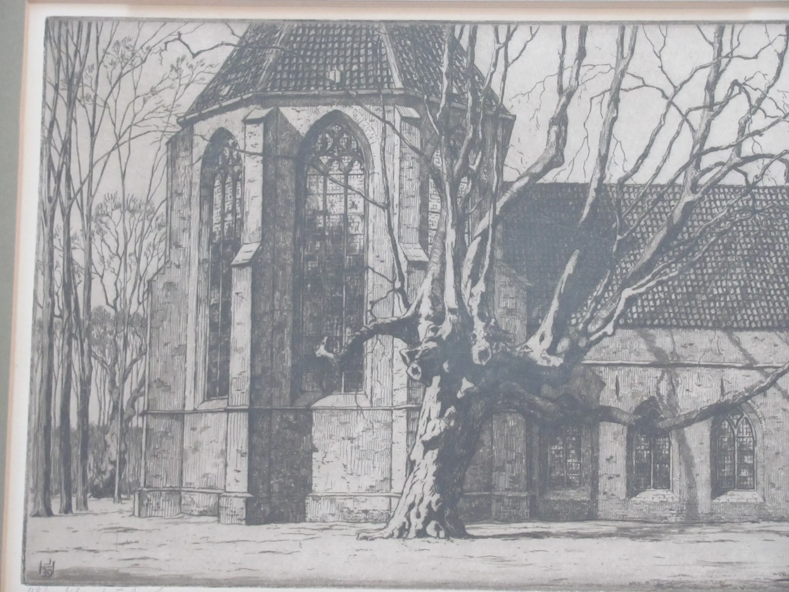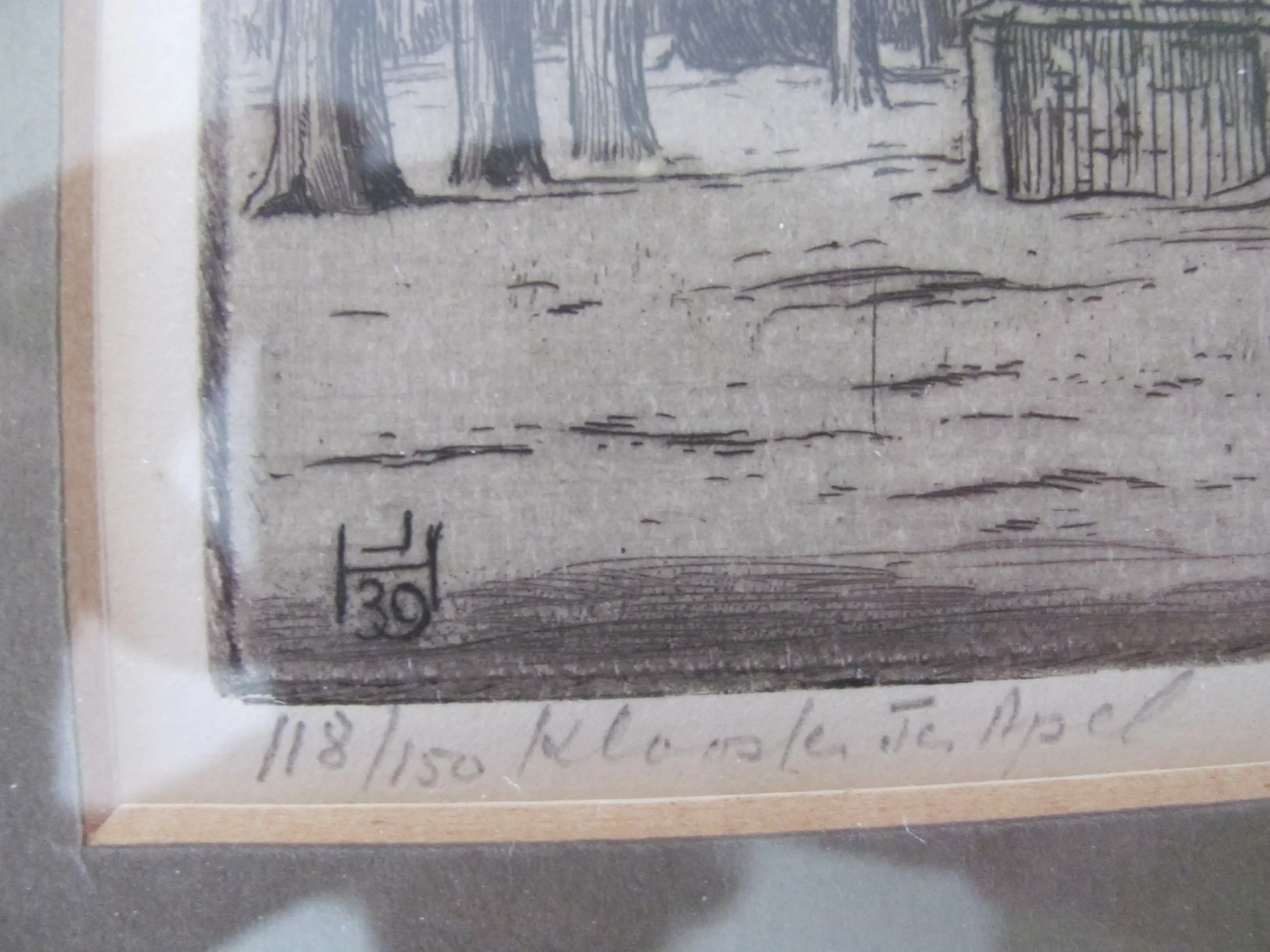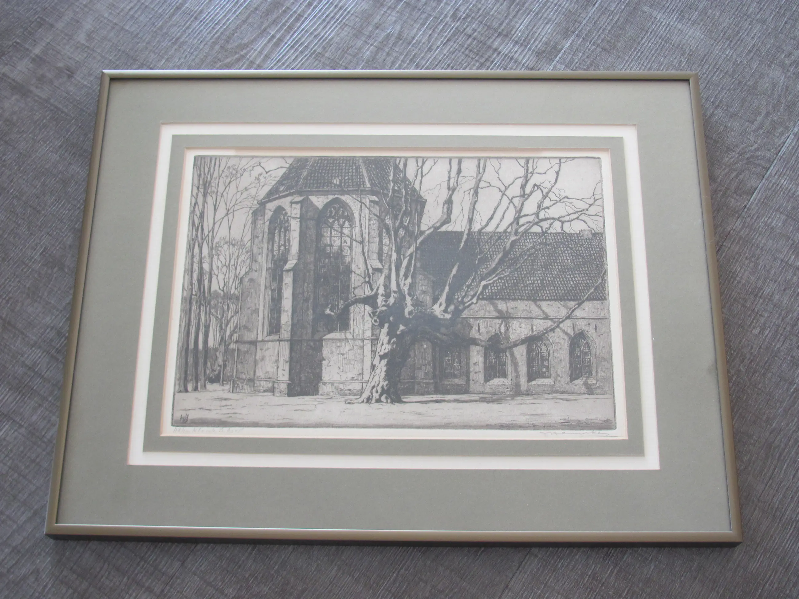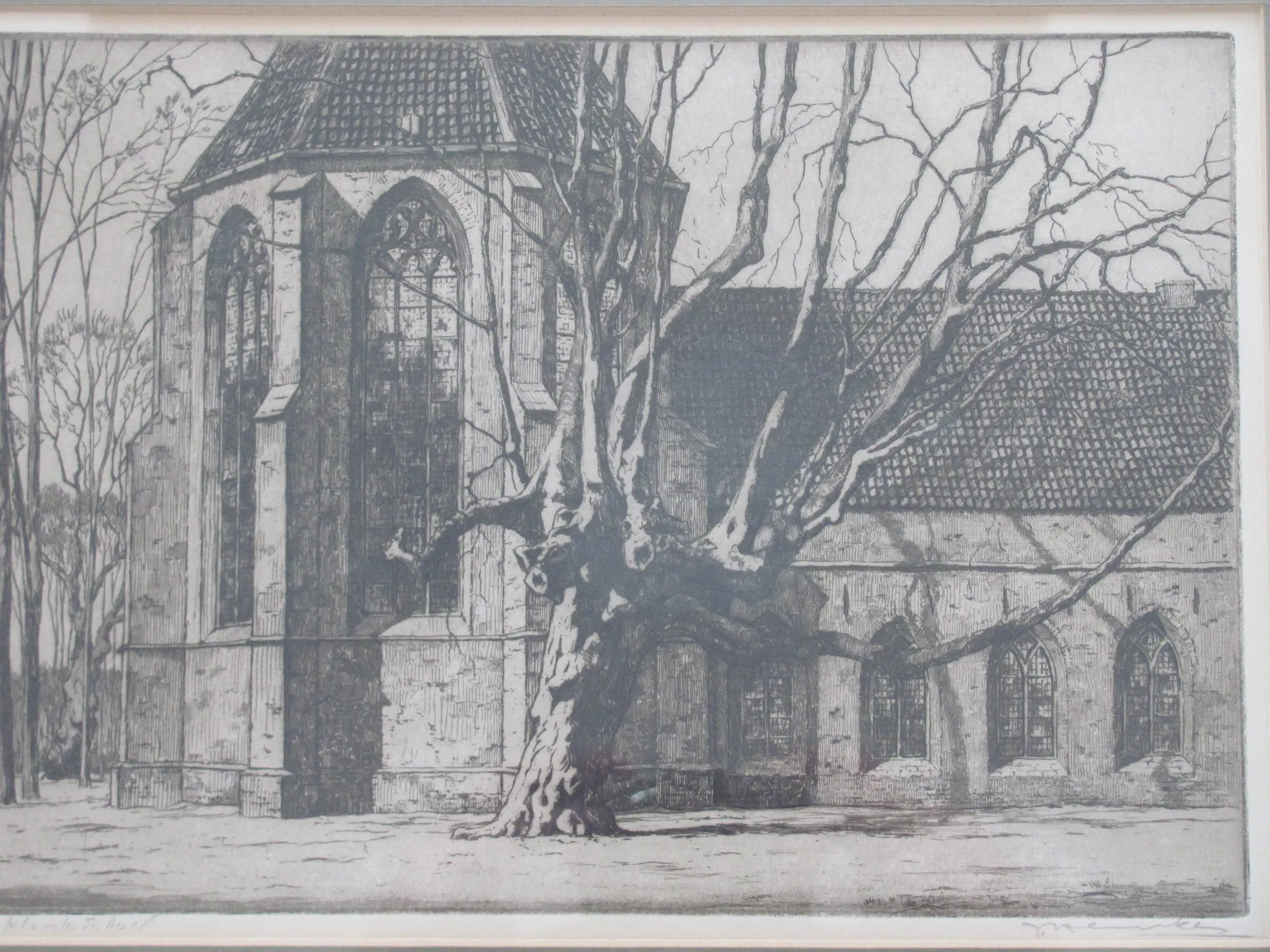 Mooie ets van Johan Hemkes uit 1939. Getiteld: Klooster Ter Apel.