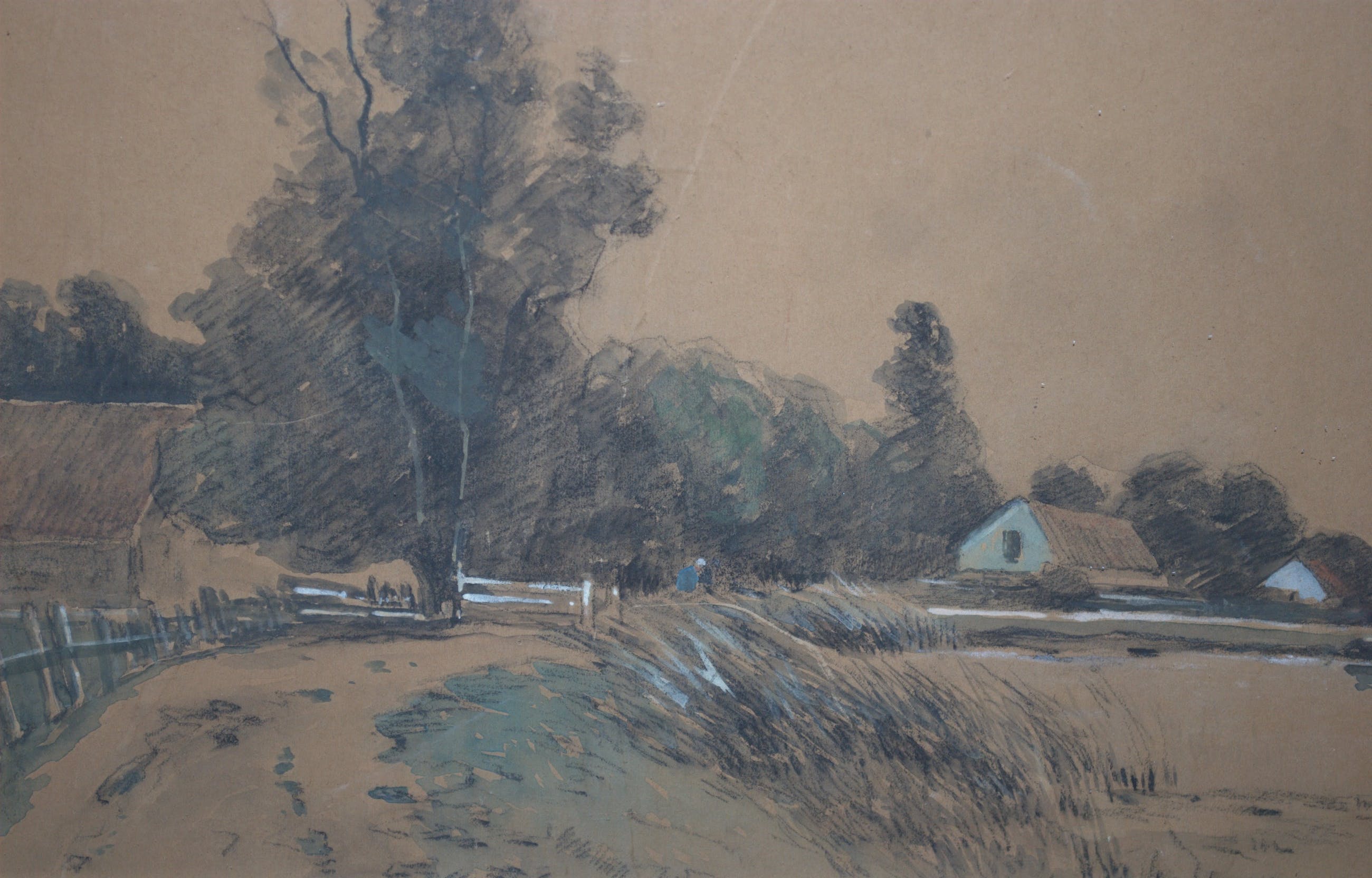 Aquarel/krijt op papier op karton. Papiermaat 25x38 cm. Achter passepartout en glas, in de originele lijst met lichte schade.