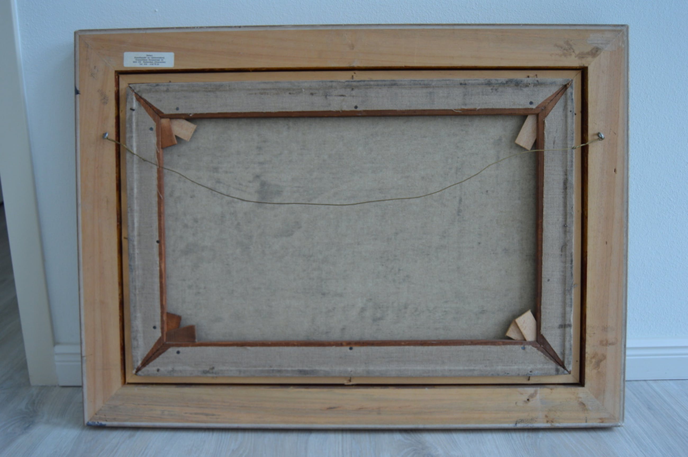 Doek vertoont craquelé (zie foto's). Onlangs professioneel schoongemaakt. De oude lijst is aan de linkerkant beschadigd.