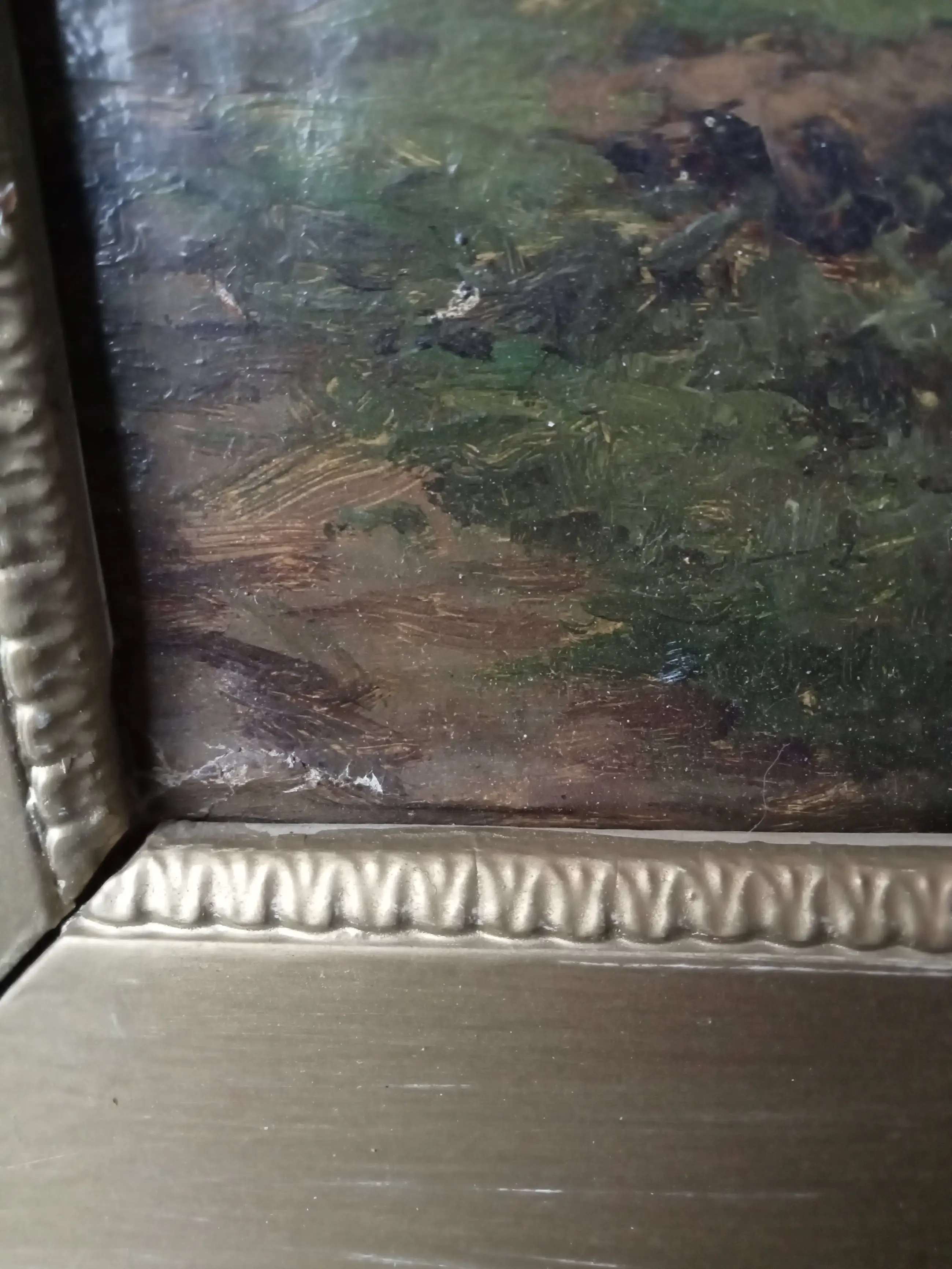 Schilderij is links boven en links onder niet meer zo heel mooi, lijst is prachtige barok stijl in goudkleur. Heeft ook jammer genoeg beschadigingen . Zie fotos voor eigen indruk