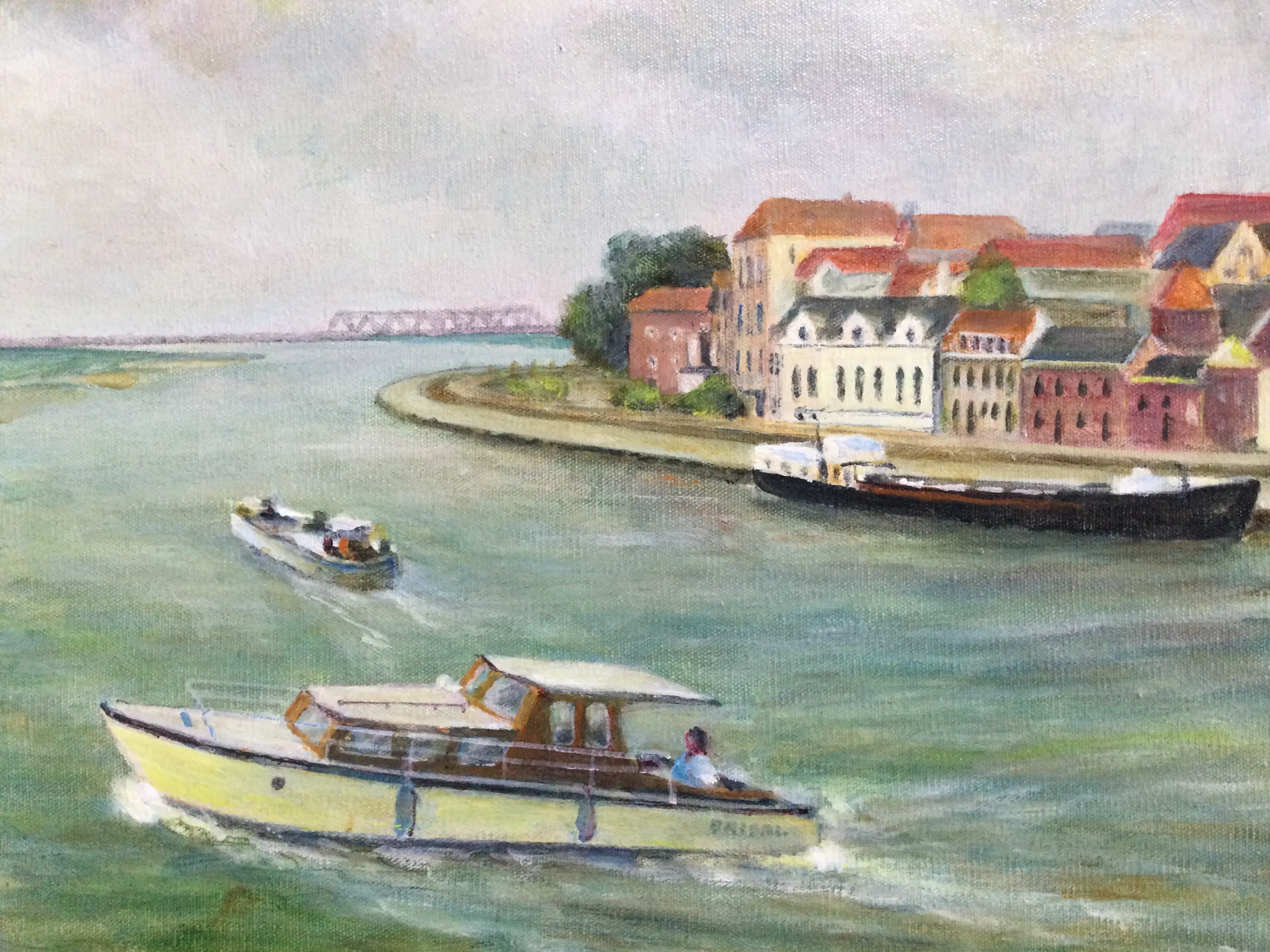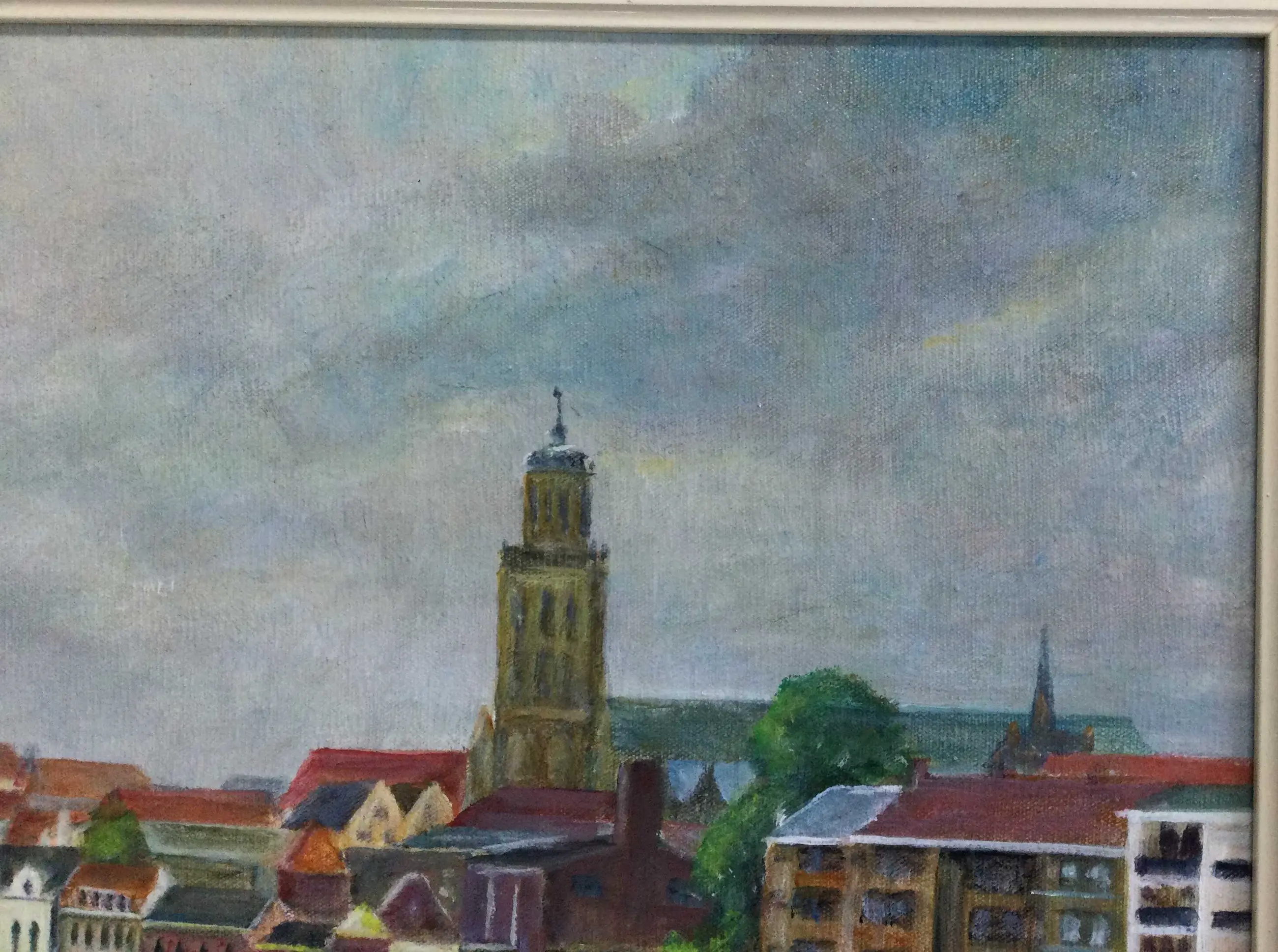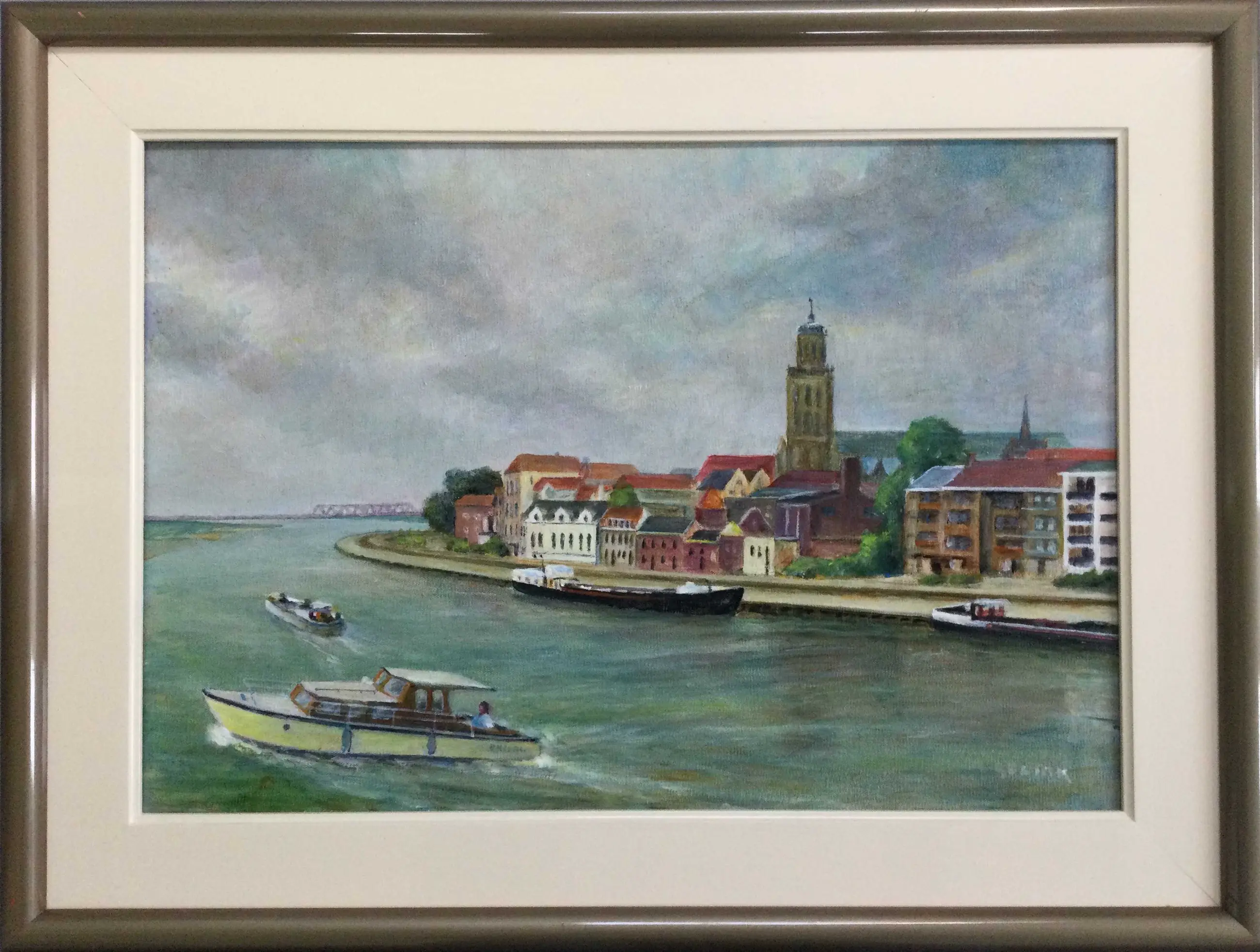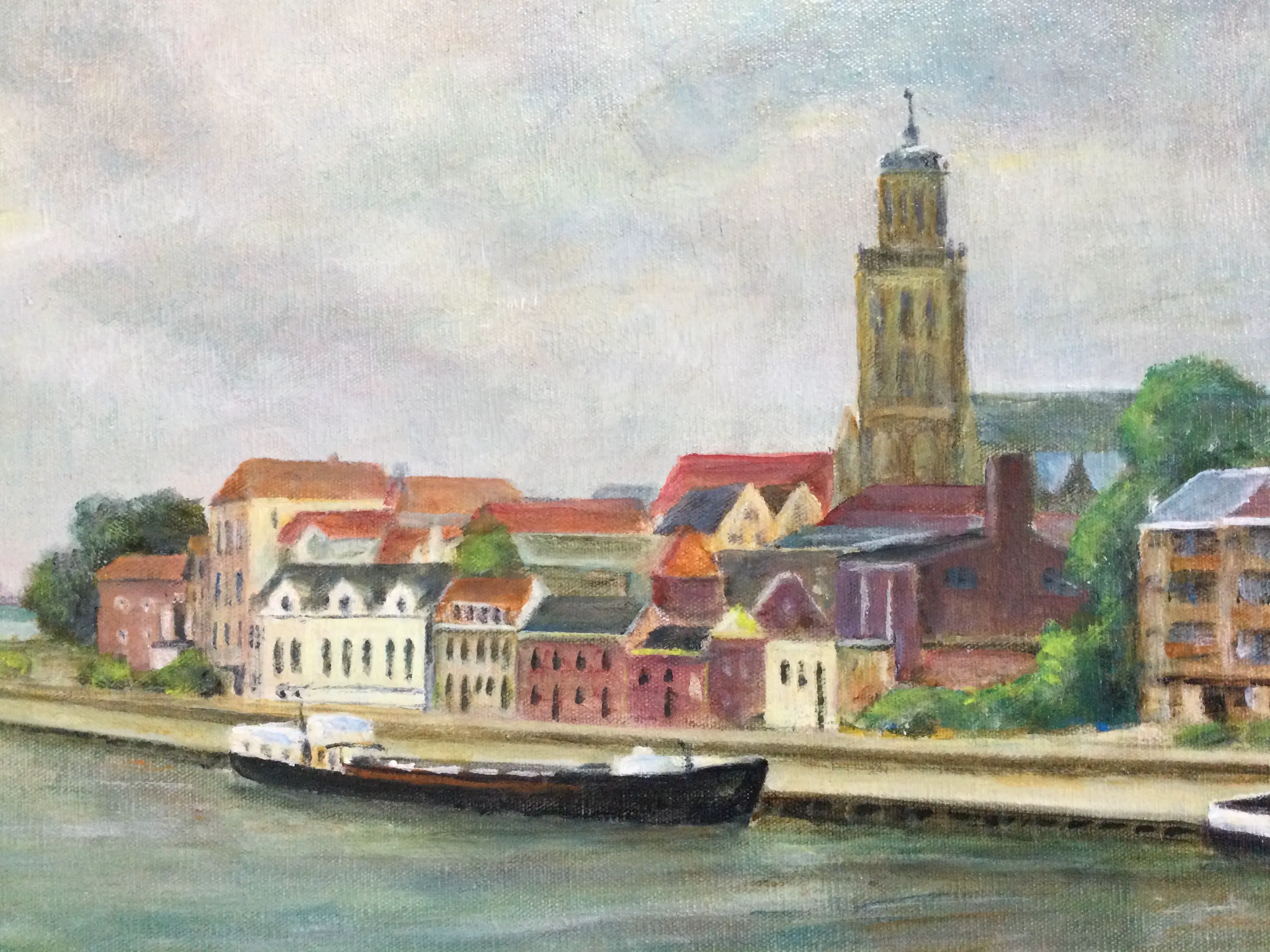 Dit prachtige schilderij met zicht op Deventer vanaf de IJssel is kenmerkend voor zijn landschap schilderijen. Met veel aandacht en fraai kleurgebruik geschilderd.