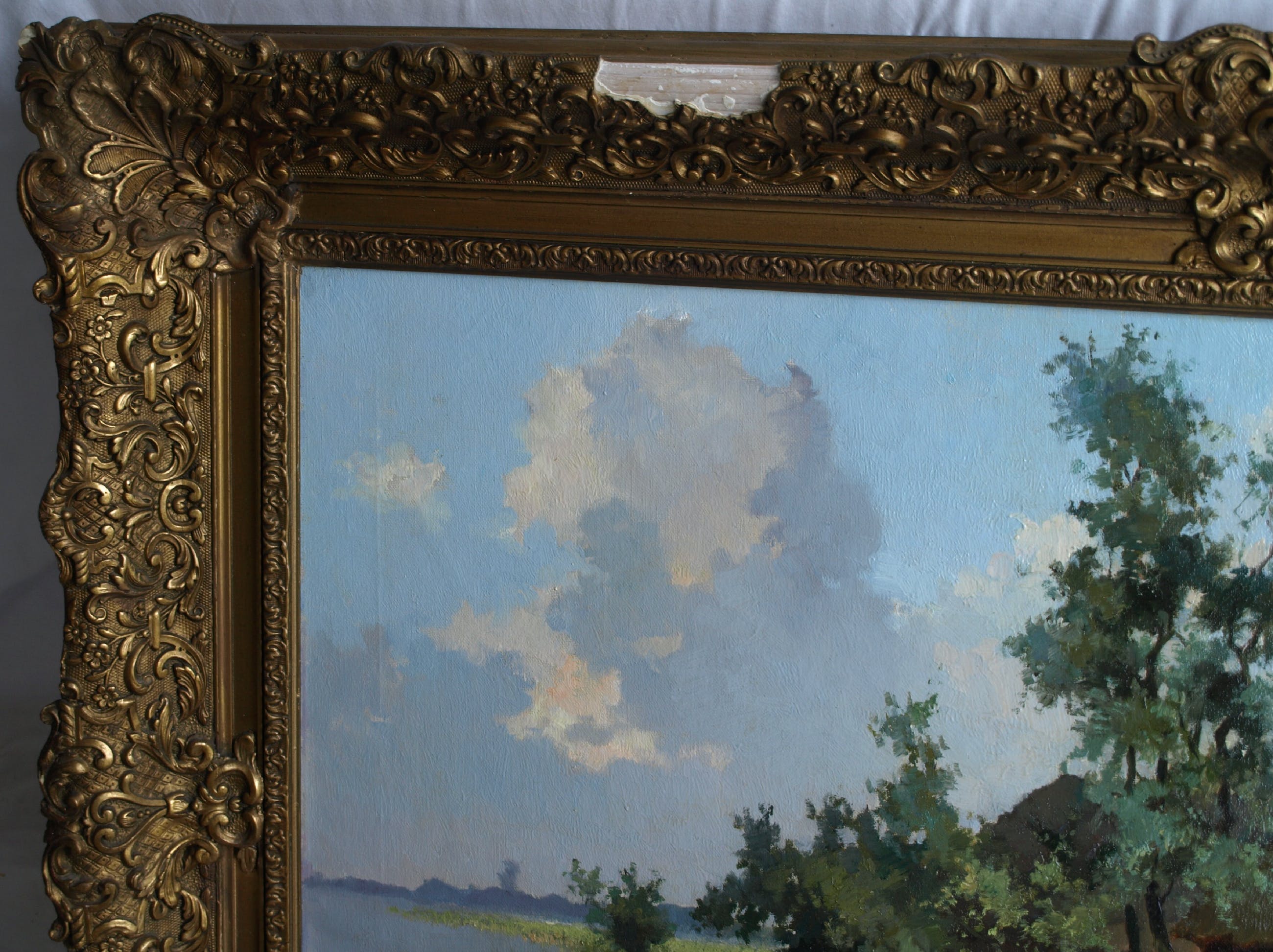 | Het werk is in goede staat met op de achterkant van het doek een klein ‘restauratie-plakkertje’ (3 x 1 cm, zie de laatste foto). De gipsen sierrand van de houten lijst heeft aan de bovenrand en linkerbovenhoek een beschadiging. Zie ook alle foto’s voor een eigen indruk.. Kan zo aan de muur. | |||||||