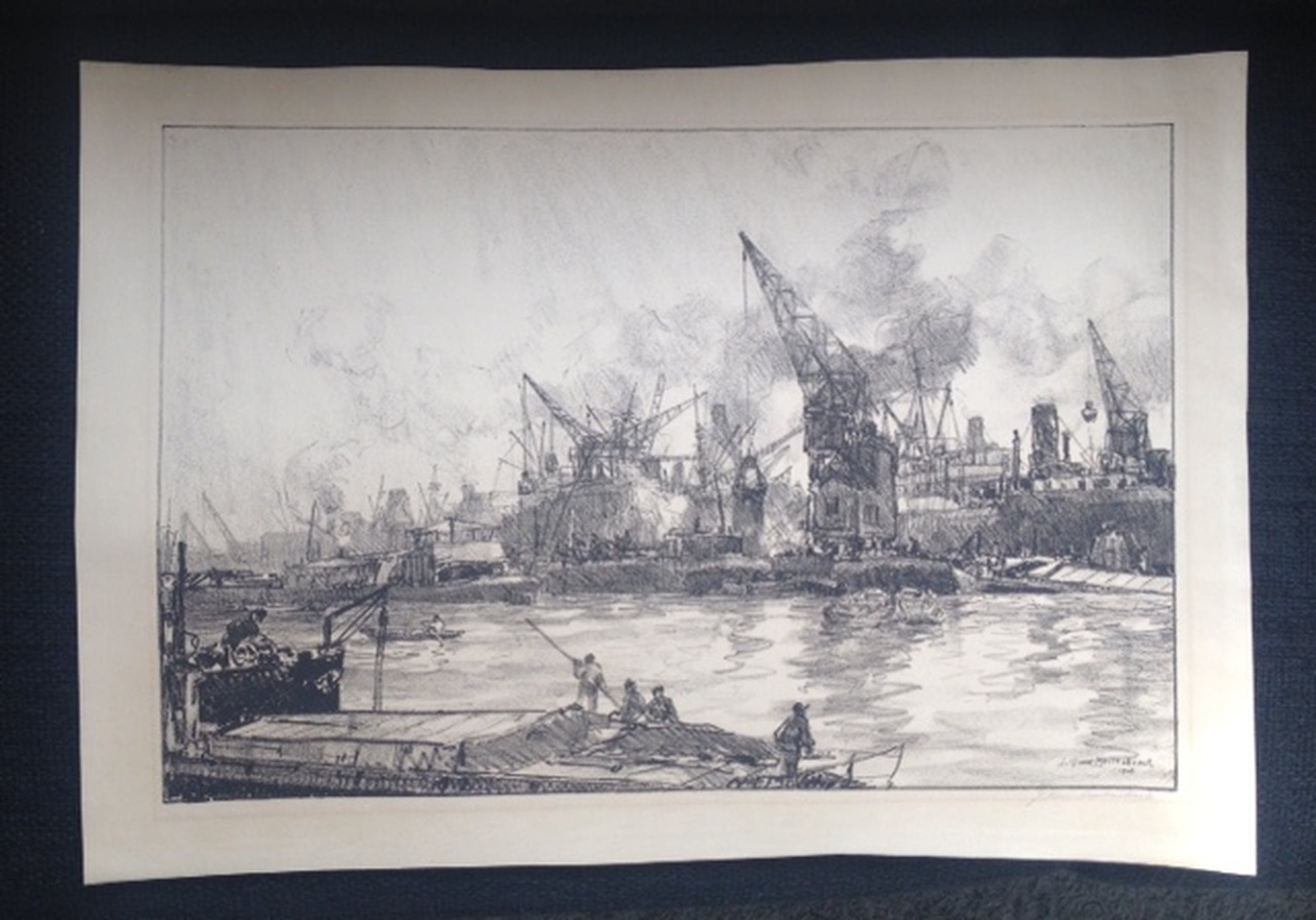 Grote litho van de haven in Rotterdam. Afbeelding 40 cm x 60 cm. Litho uit 1906. Losbladig en met potlood gesigneerd.