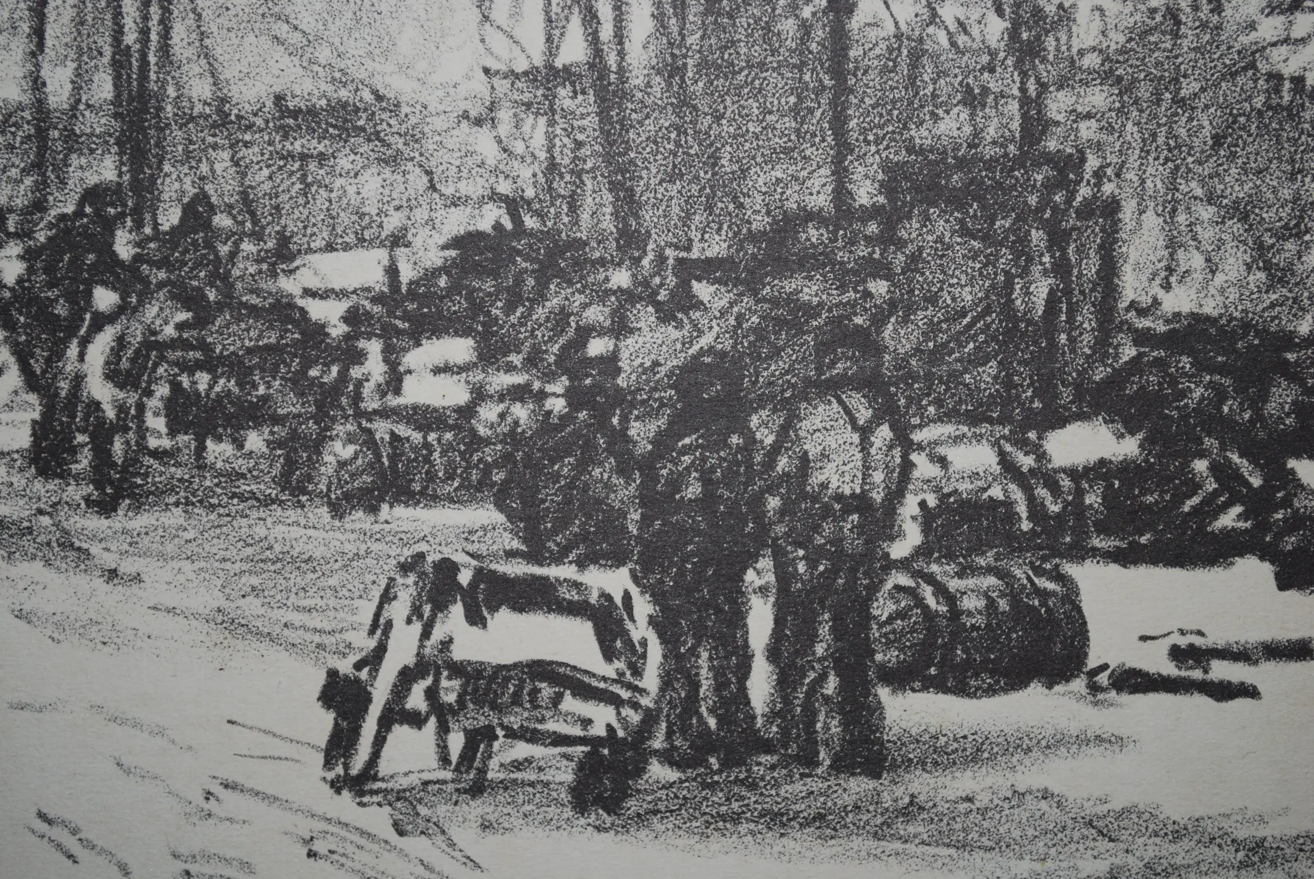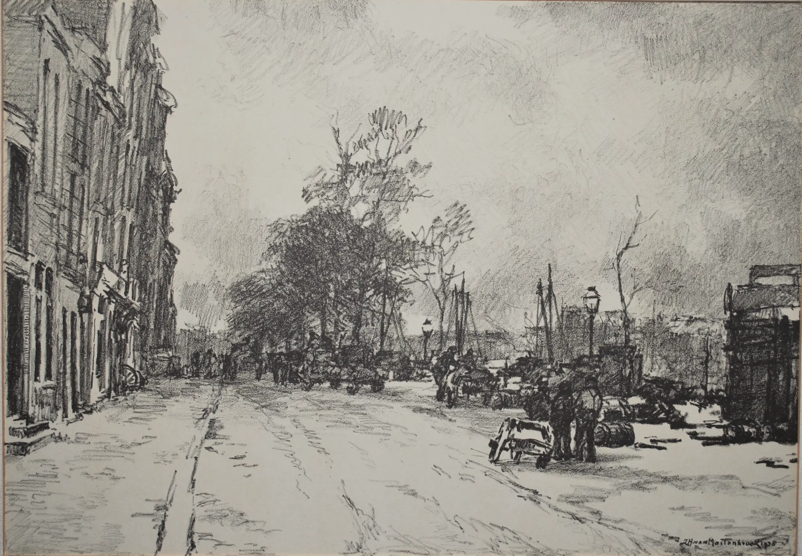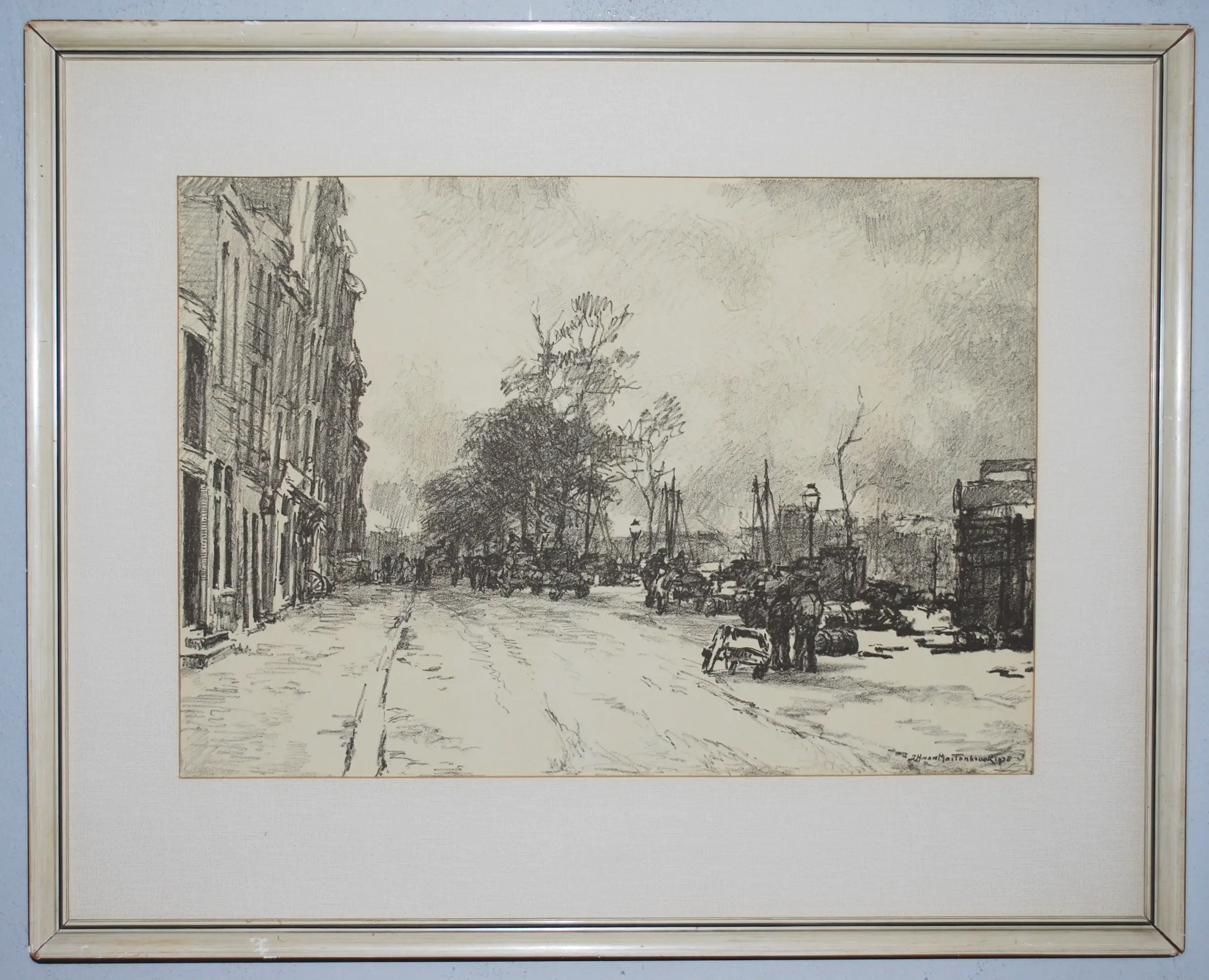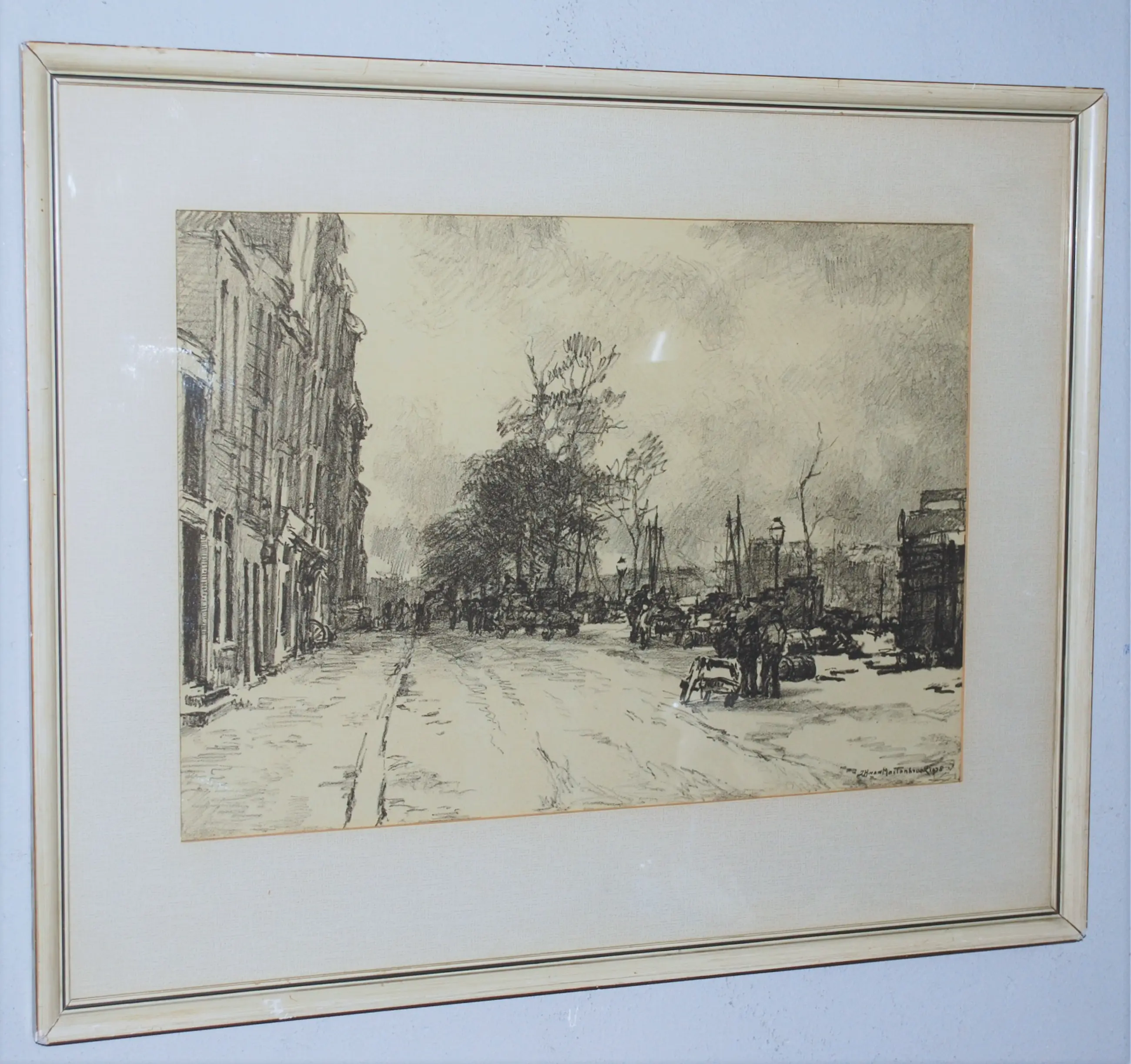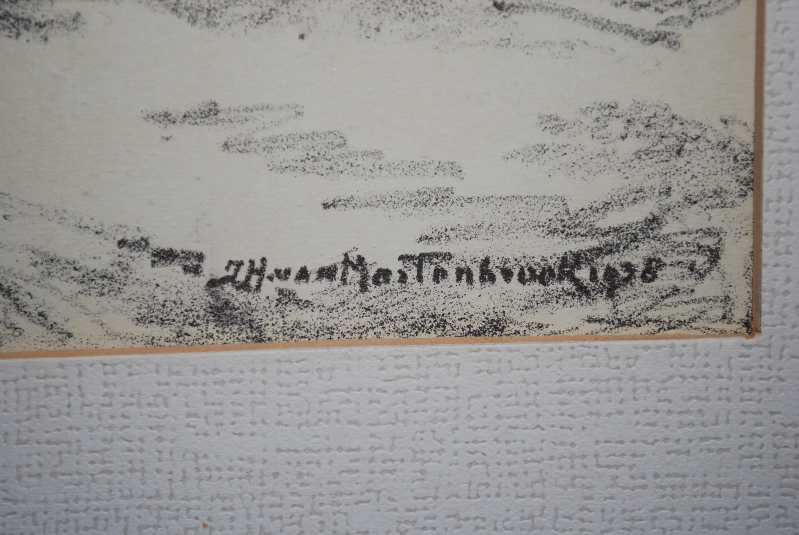 Achter glas en passepartout ingelijst (43x53 cm). De lijst heeft slijtschade.