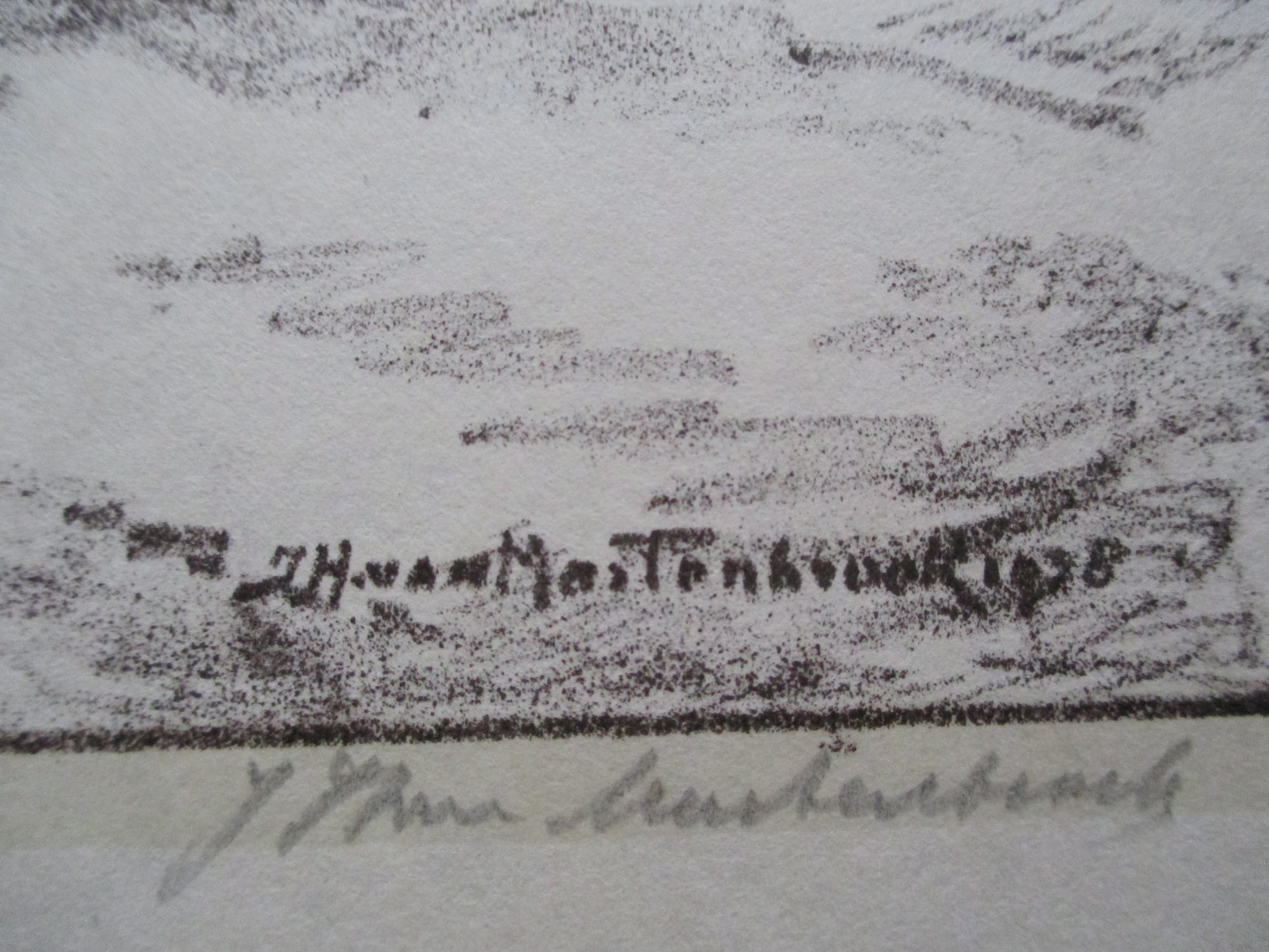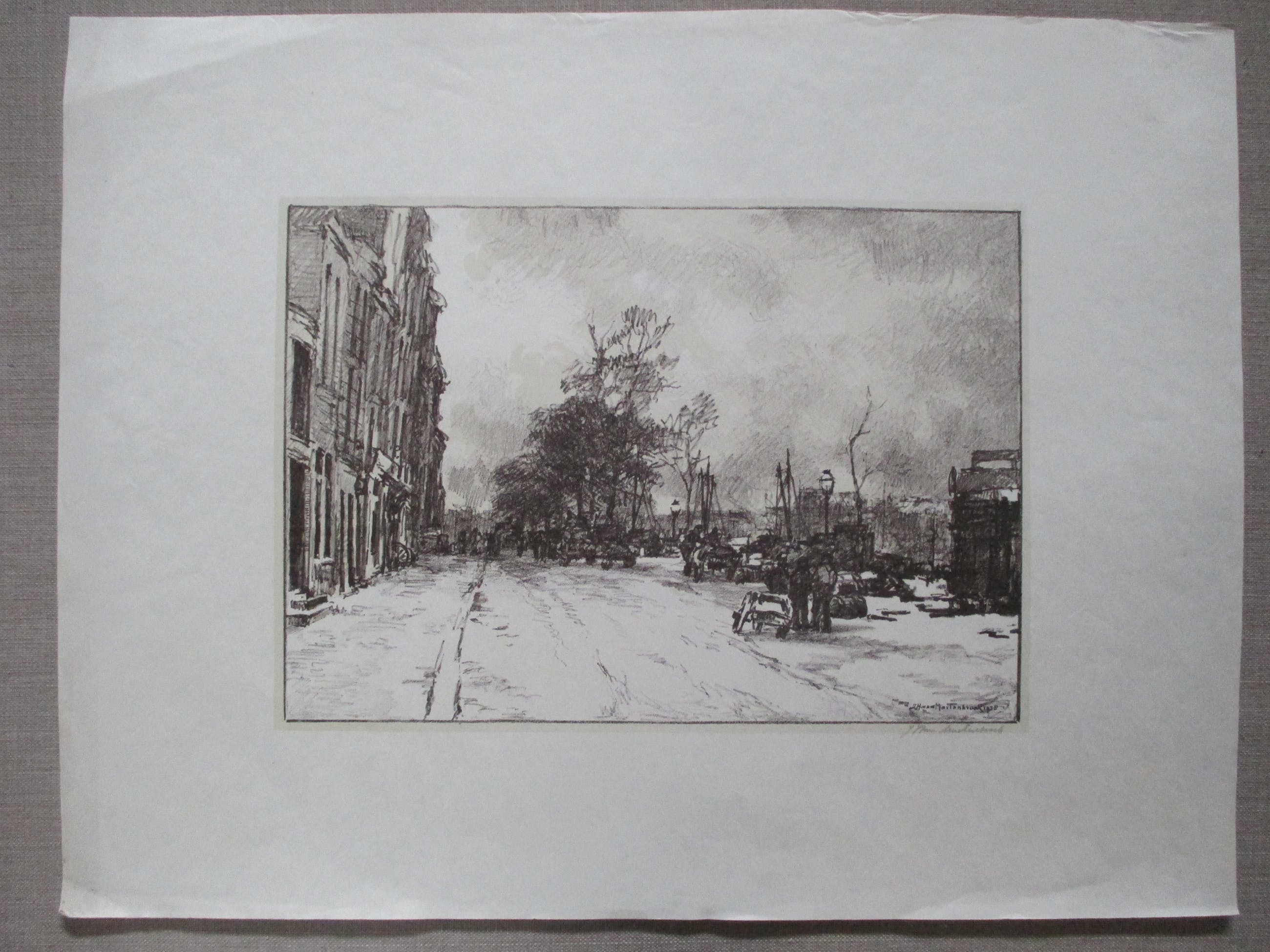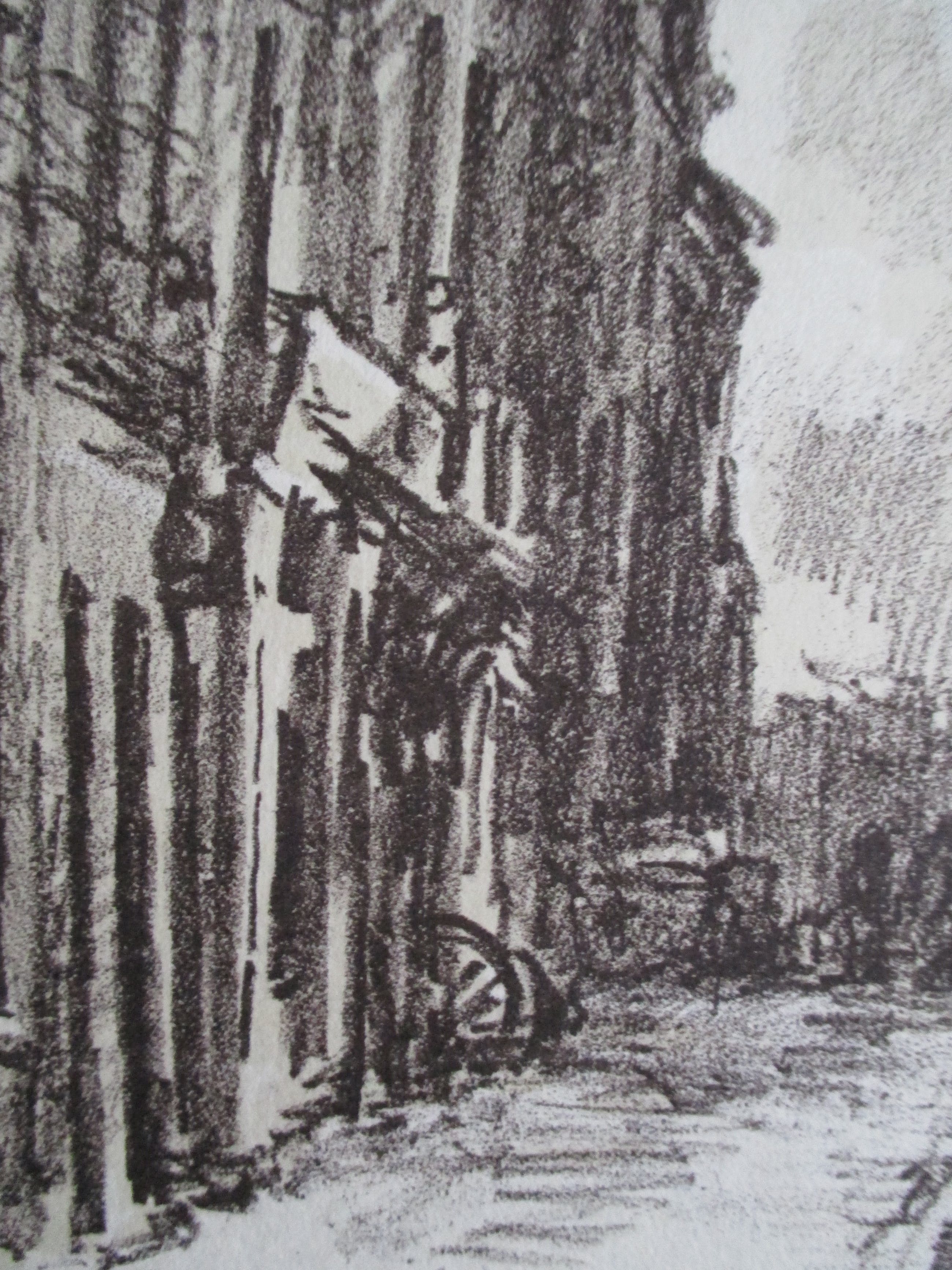 Twee kleuren-litho van J.H van Mastenbroek uit 1938. R.o gesigneerd in potlood en gesigneerd en gedateerd in de druk. Ik weet niet welke stad hier afgebeeld wordt. Afm. beeld 41x29 cm. Verzending tussen twee platen, 8,50, aangetekend 10,15