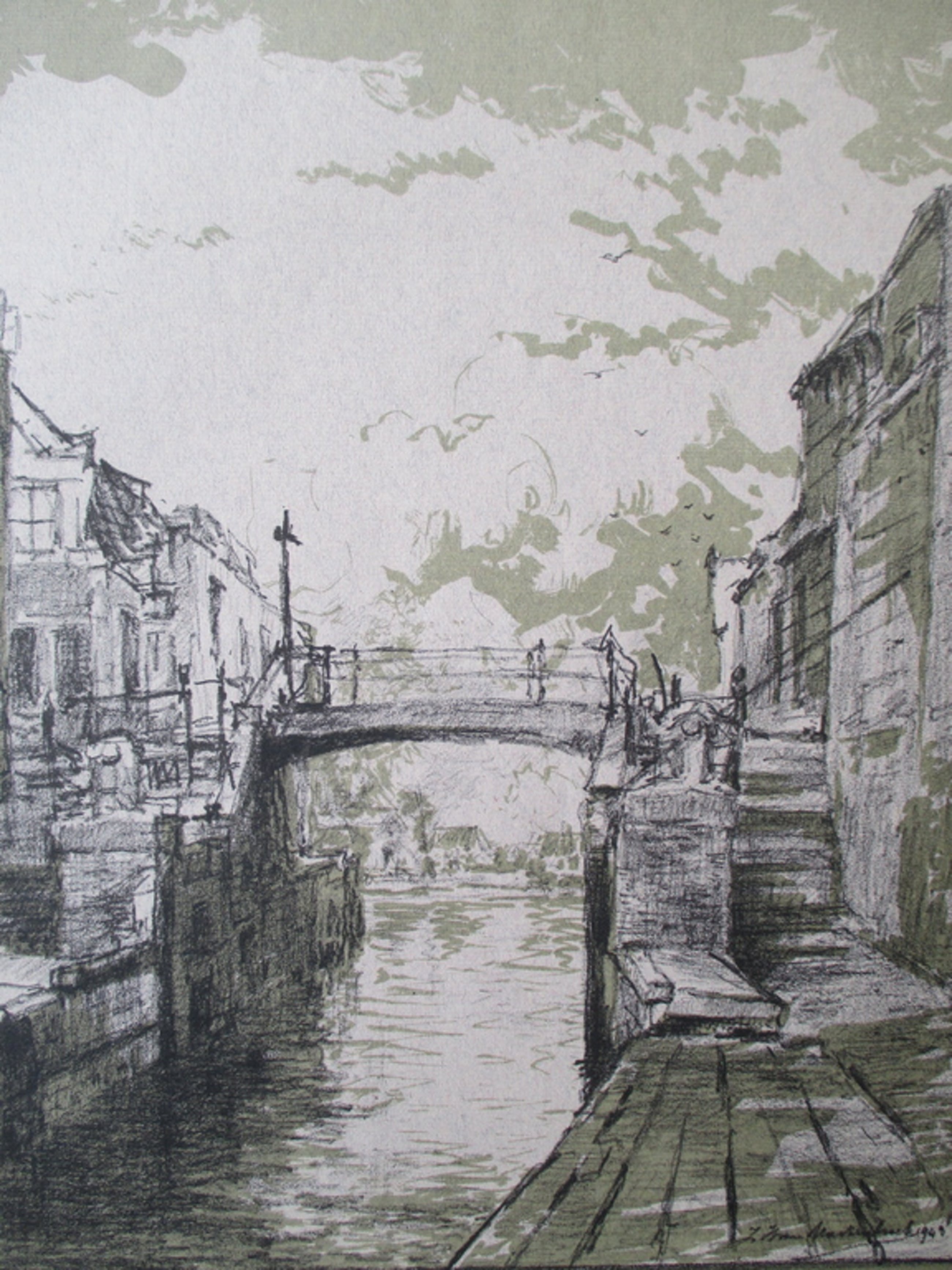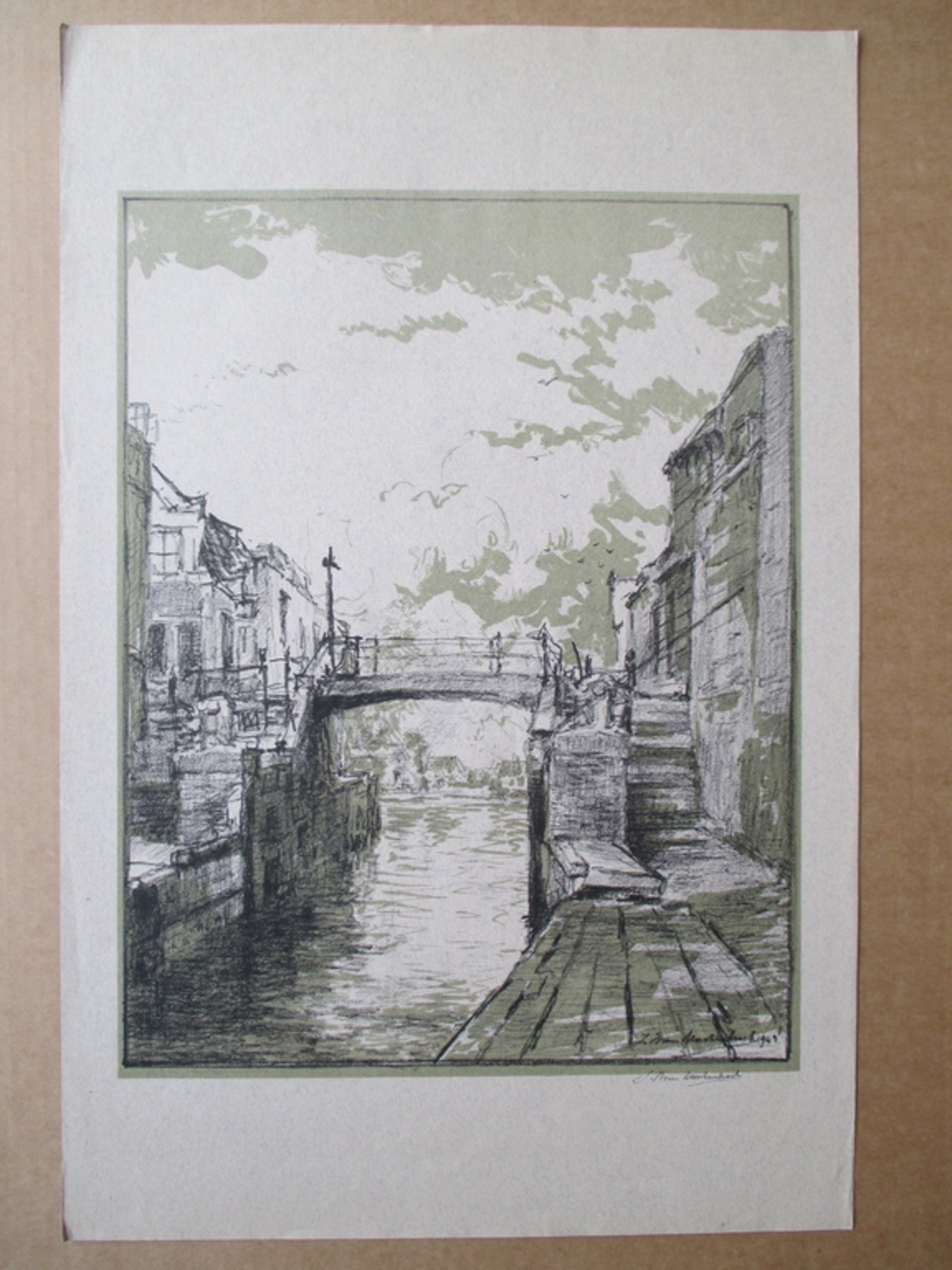 2 kleurenlitho op lichtgrijs papier van J.H van Mastenbroek (1875-1945) uit 1943, voorstellende een sluisje te Rotterdam, gesign in plaat r.o en in potlood, afm. blad 32,4x49,3, beeld 36x27,7. In perfecte staat, niet ingelijst geweest. Dit blad is afkomstig uit de nalatenschap van schilder Harm Kamerlingh Onnes.