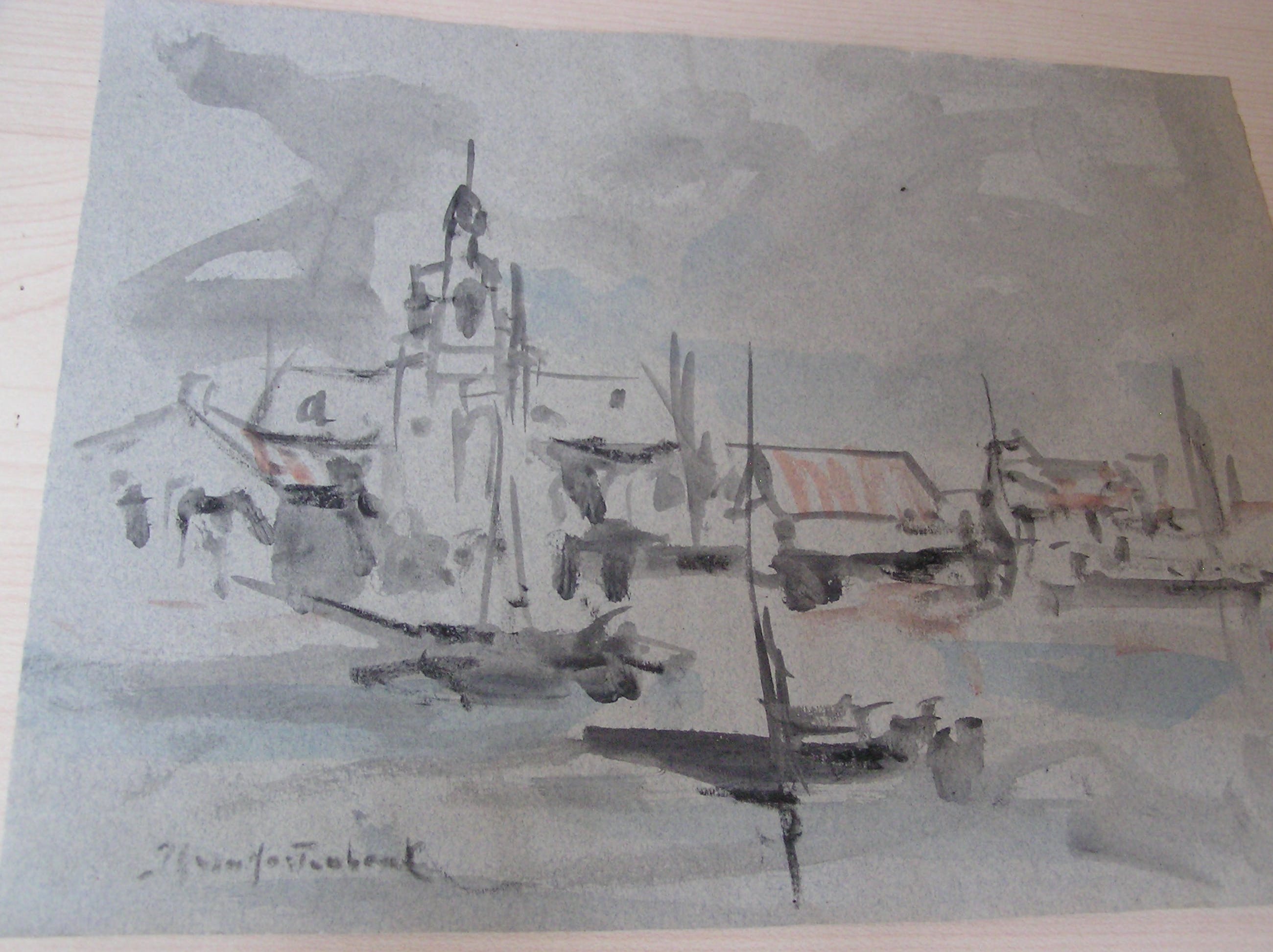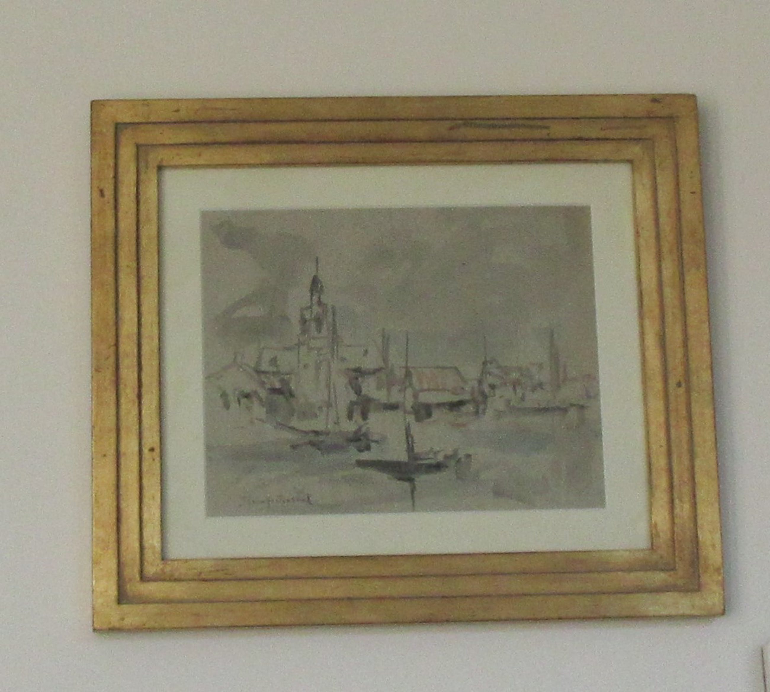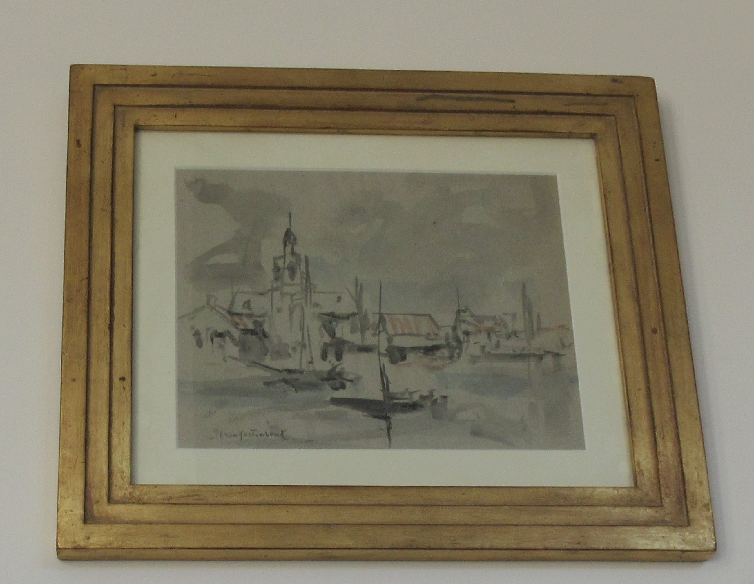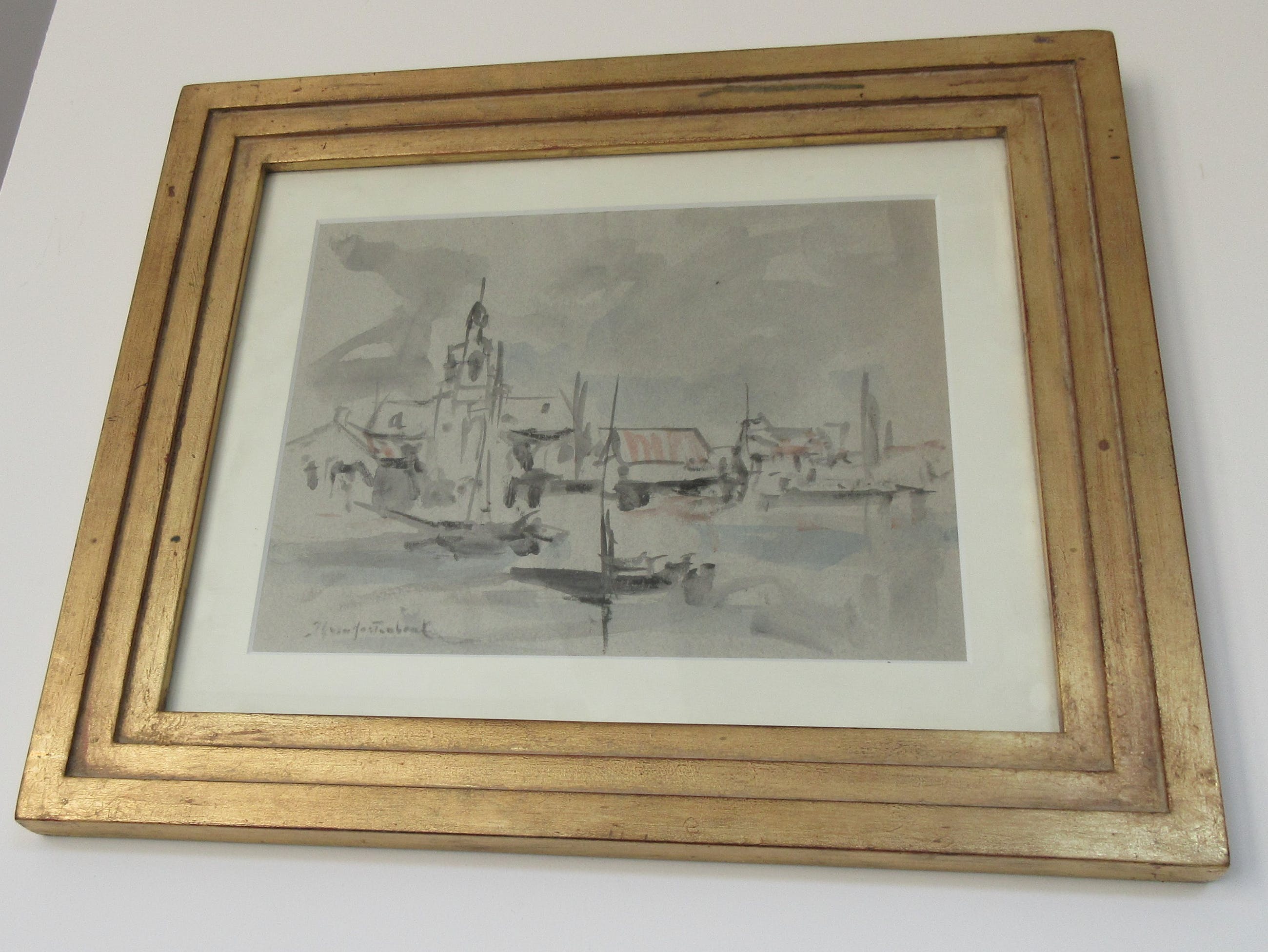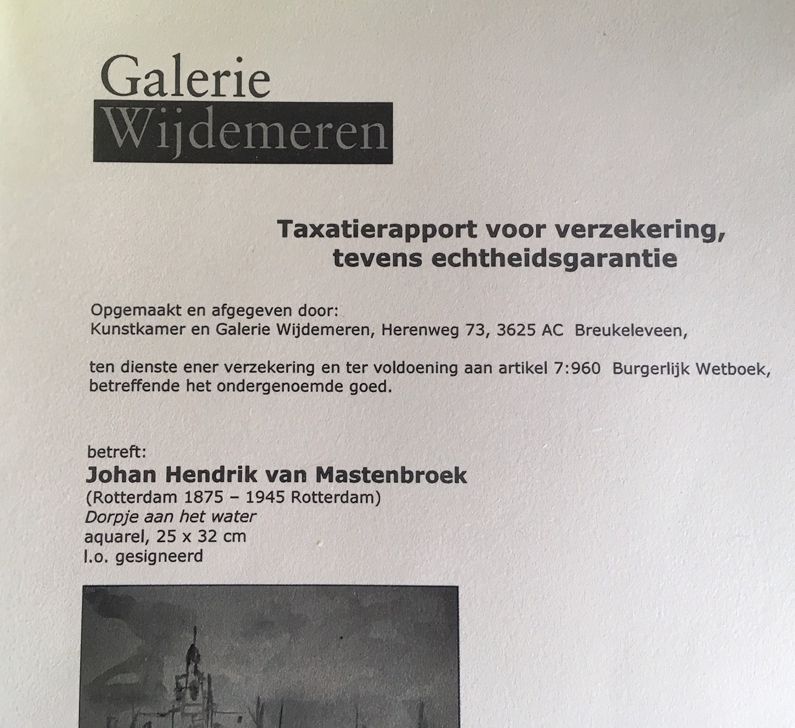 Voorstudie Aquarel Dorpje aan het Water, geschilderd door J.H. Mastenbroek ca. 1900-1910. De lijst is op maat gemaakt door Galerie Wijdemeren. Inclusief echtheids certificaat (zie foto).