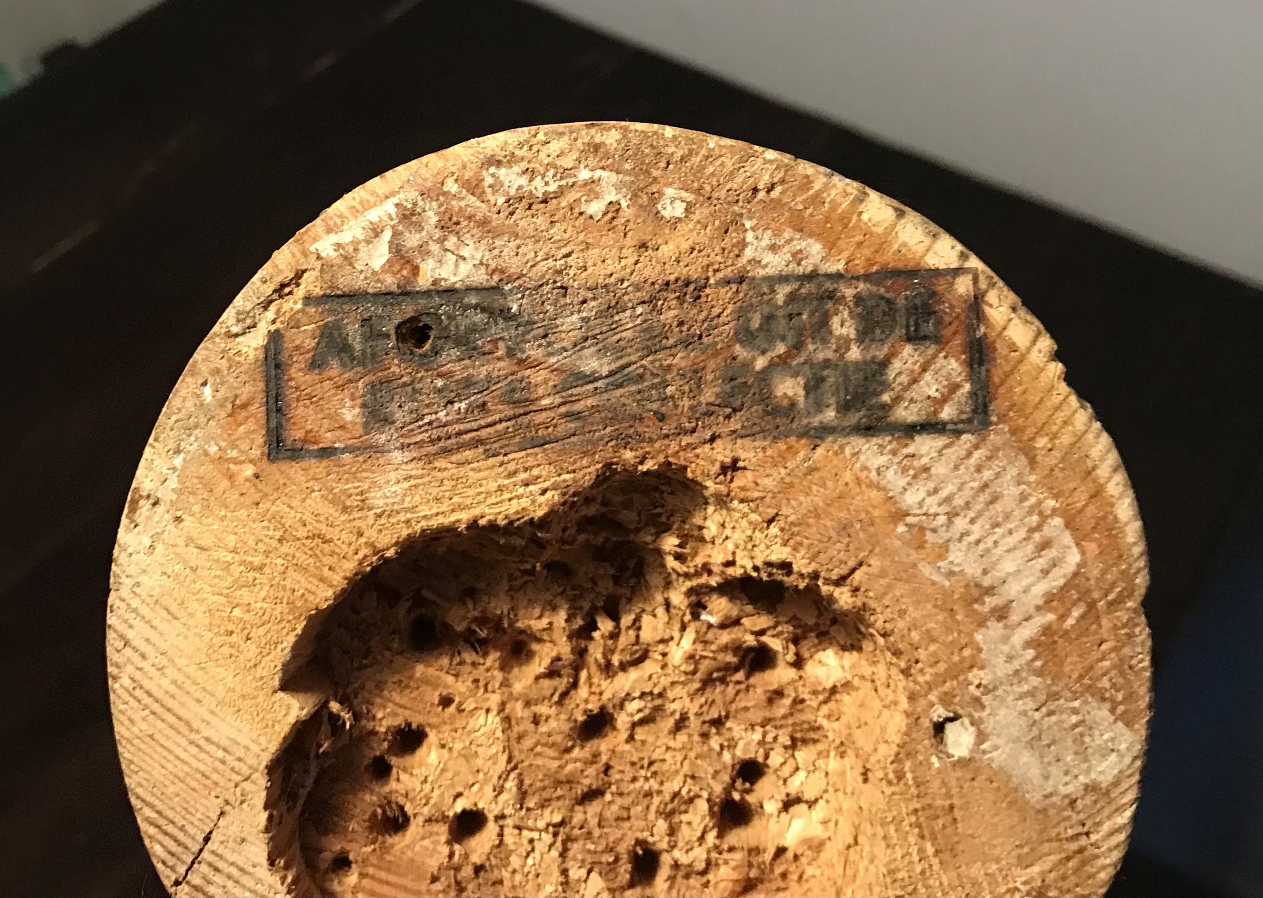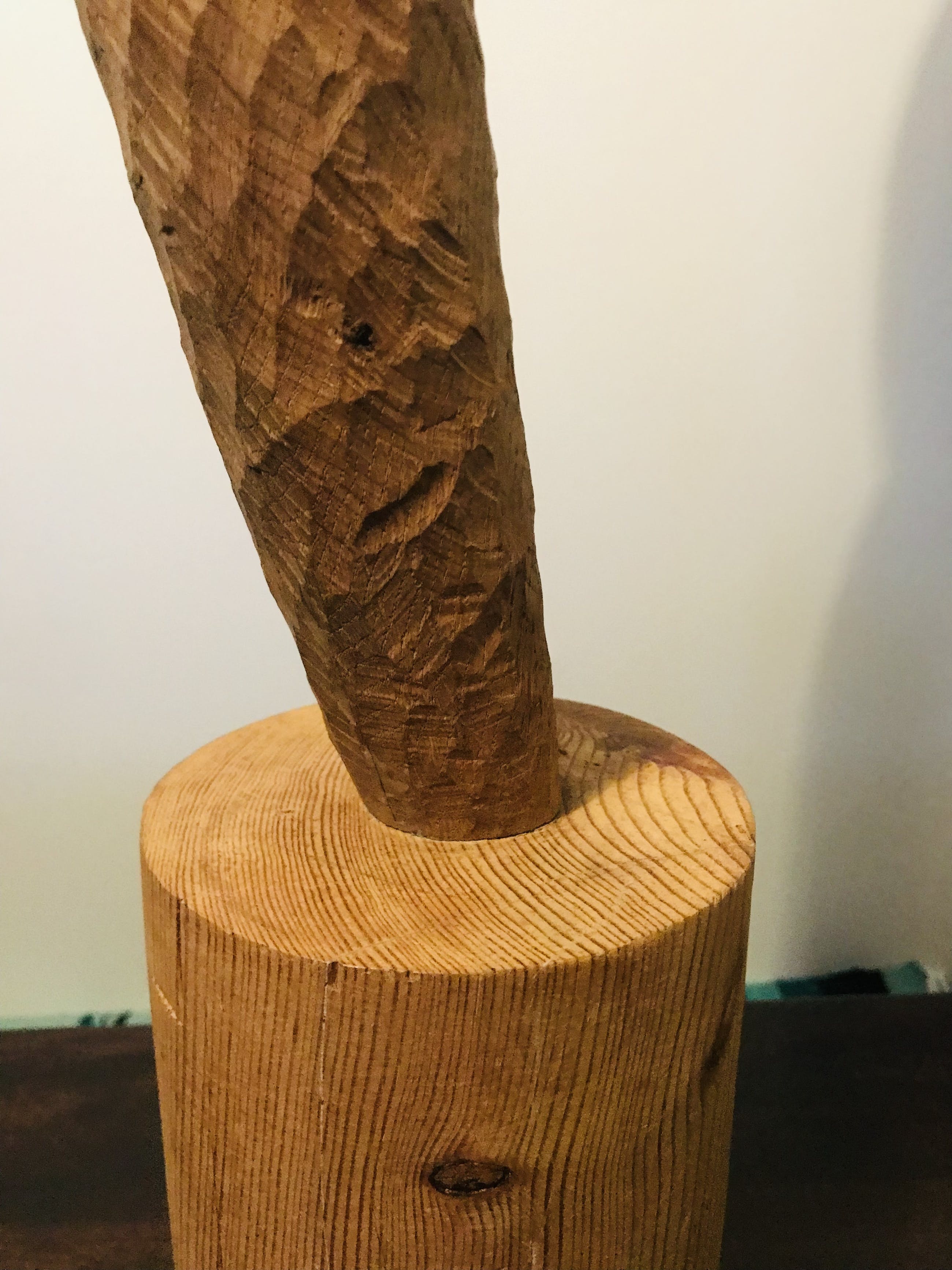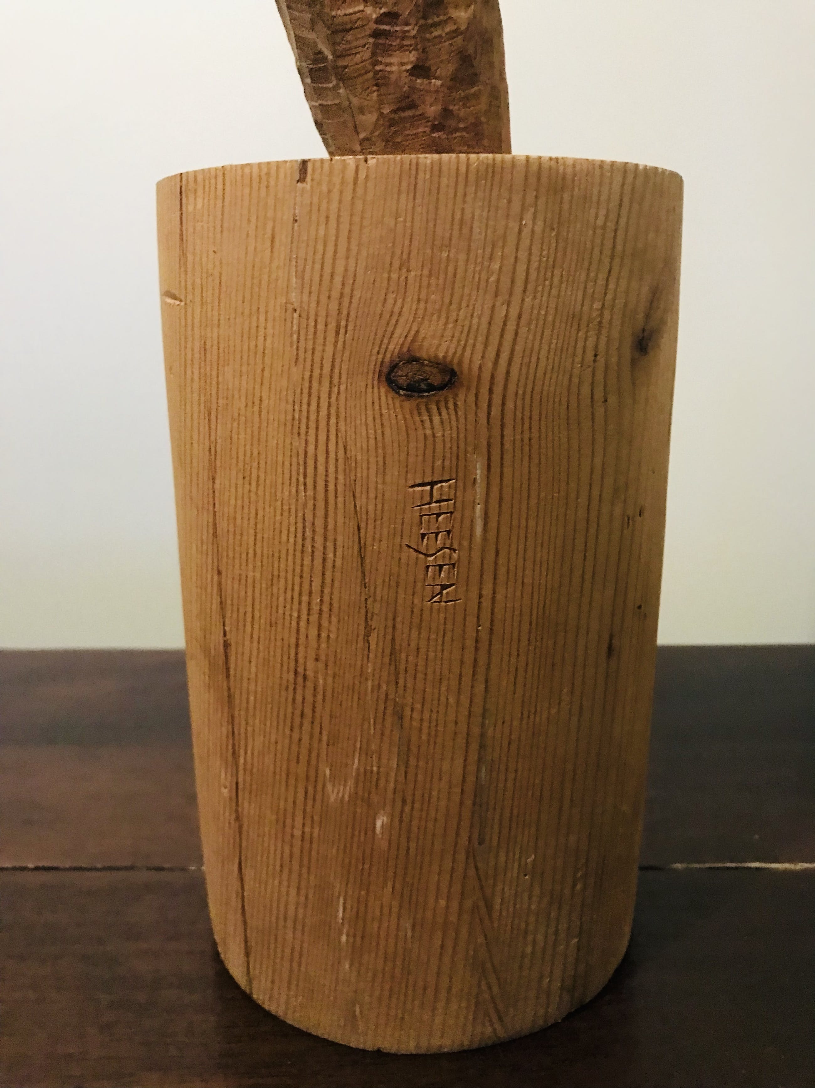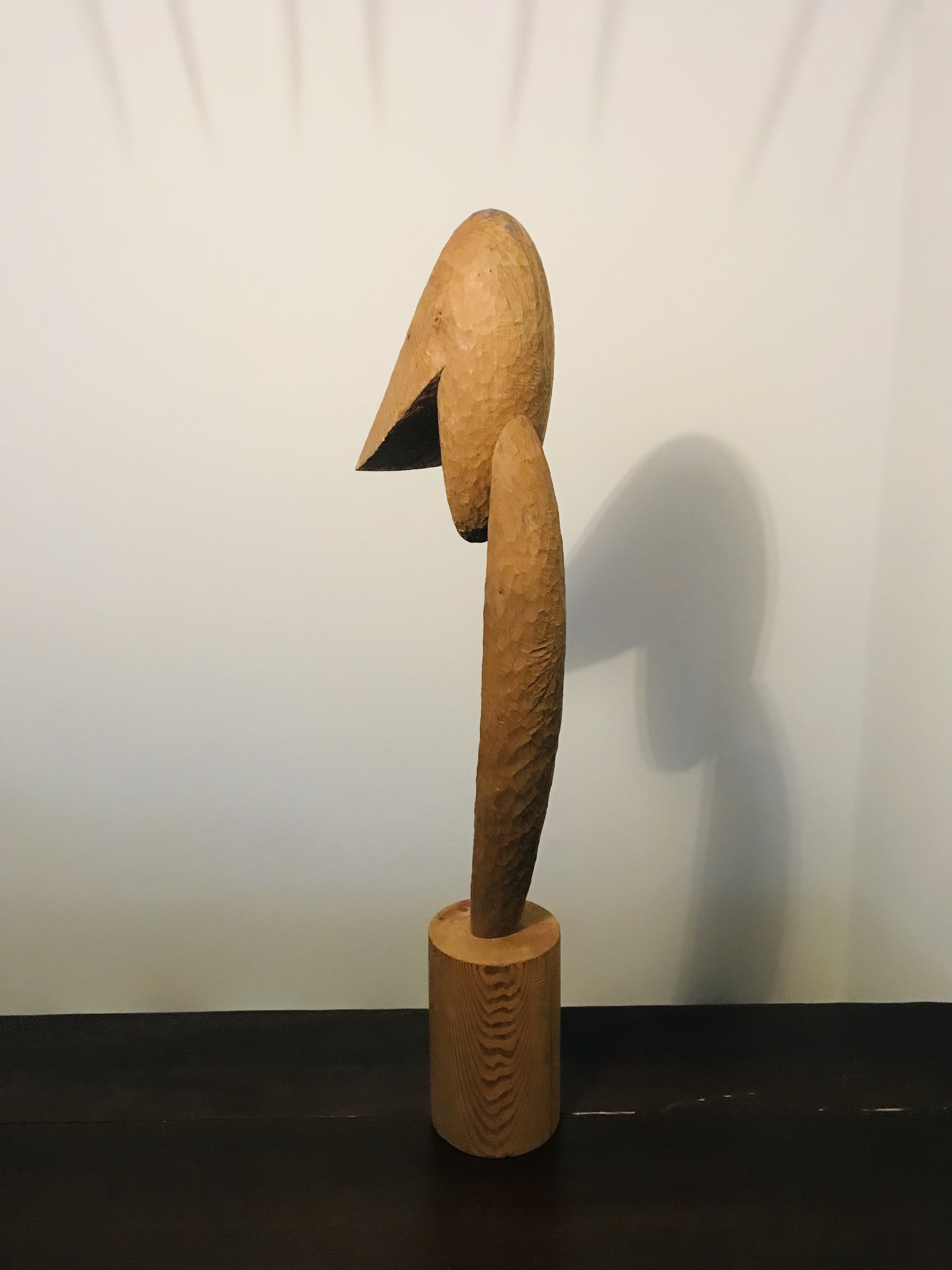Omschrijving: Rechtopstaand staak-vormig (figuratief) plastiek, eindigend in een U-vorm, geplaast op een silindrische houten sokkel. Afkomstig uit Rijkscollectie.