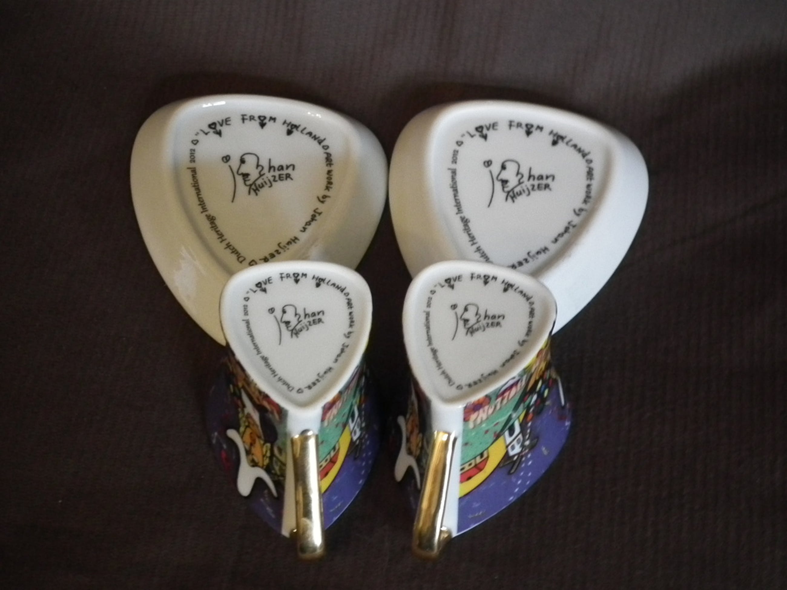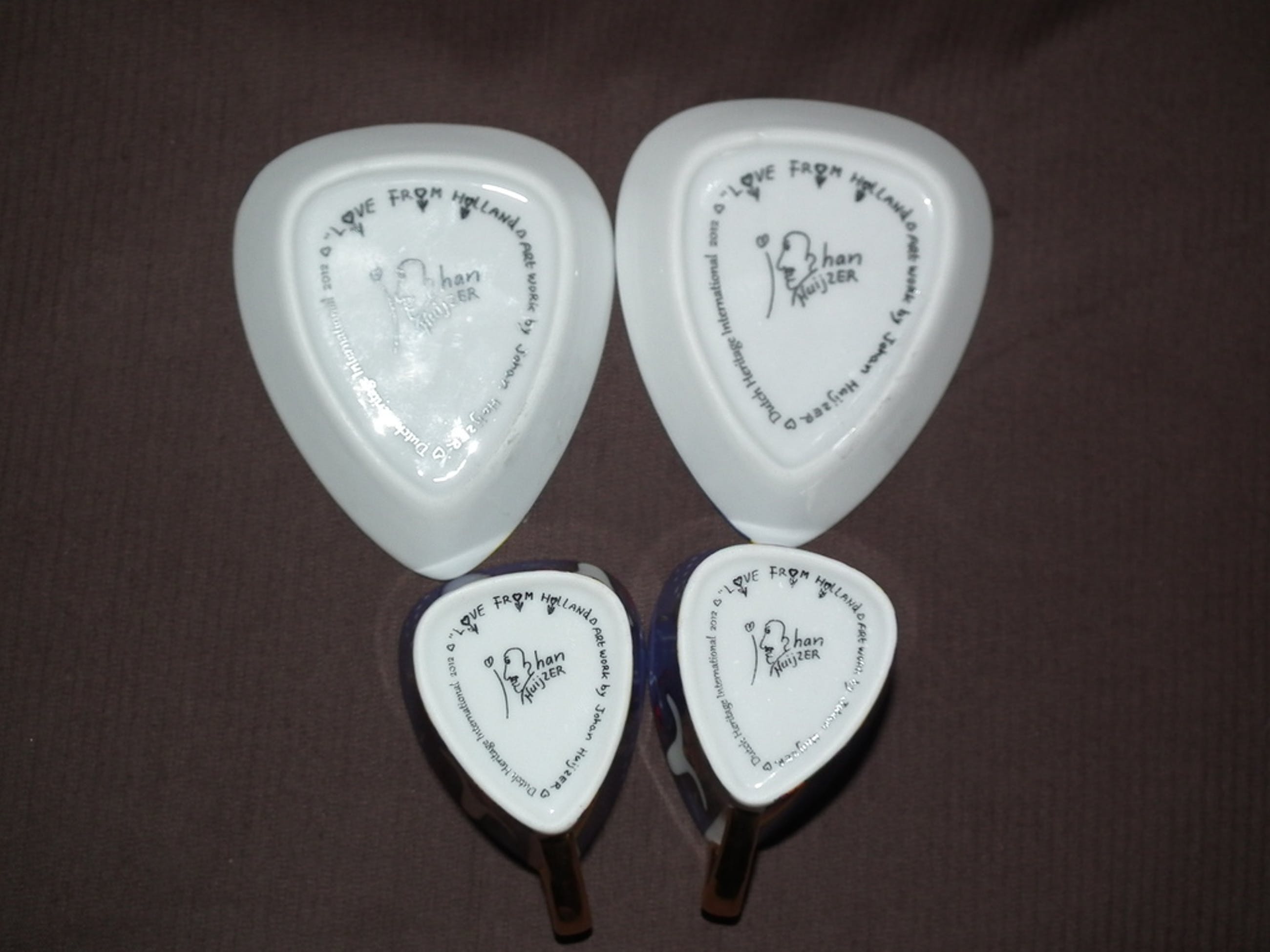 Zowel de schotel als het kopje hebben een aflopende vorm en zijn beiden gesigneerd met: