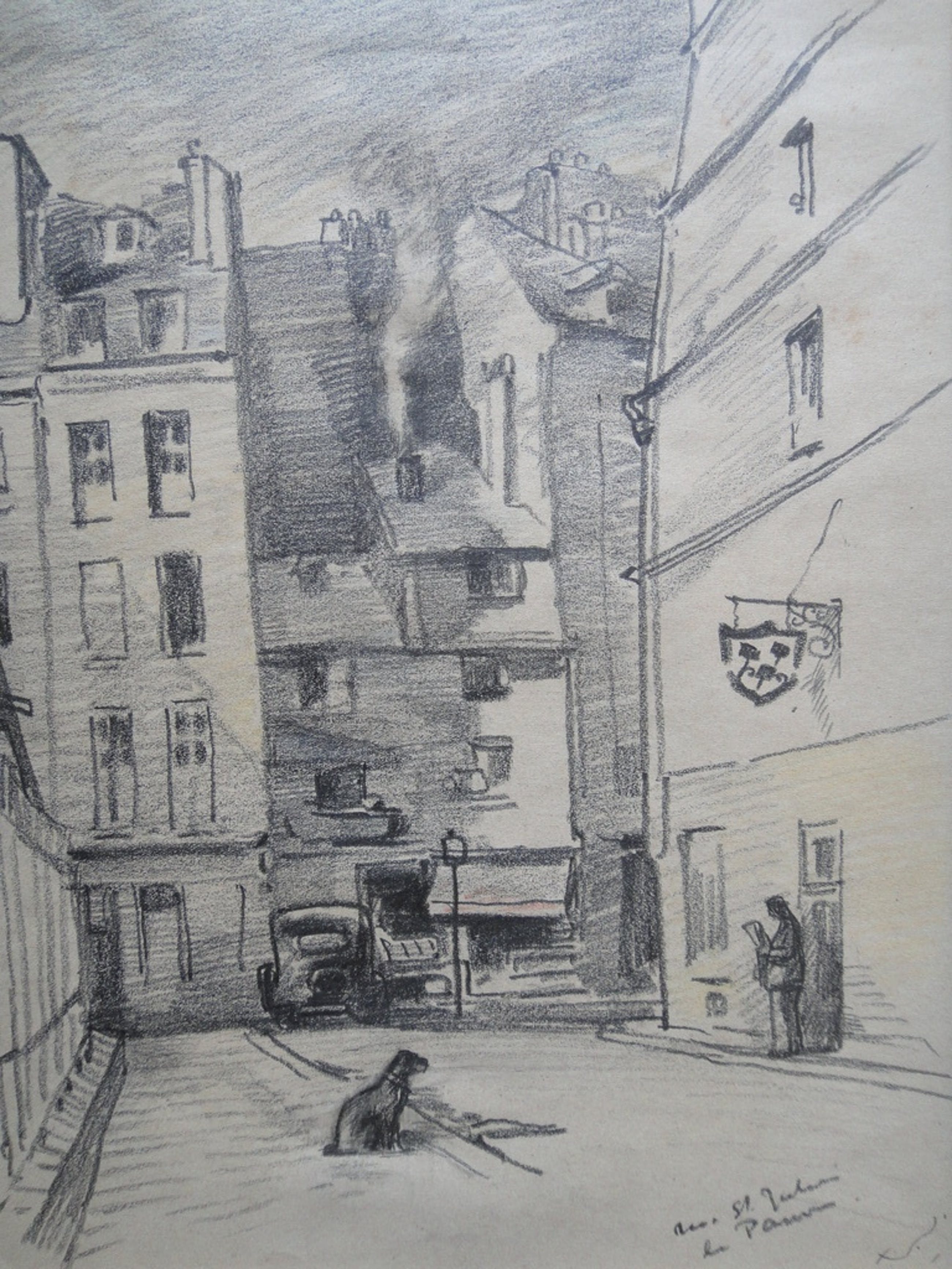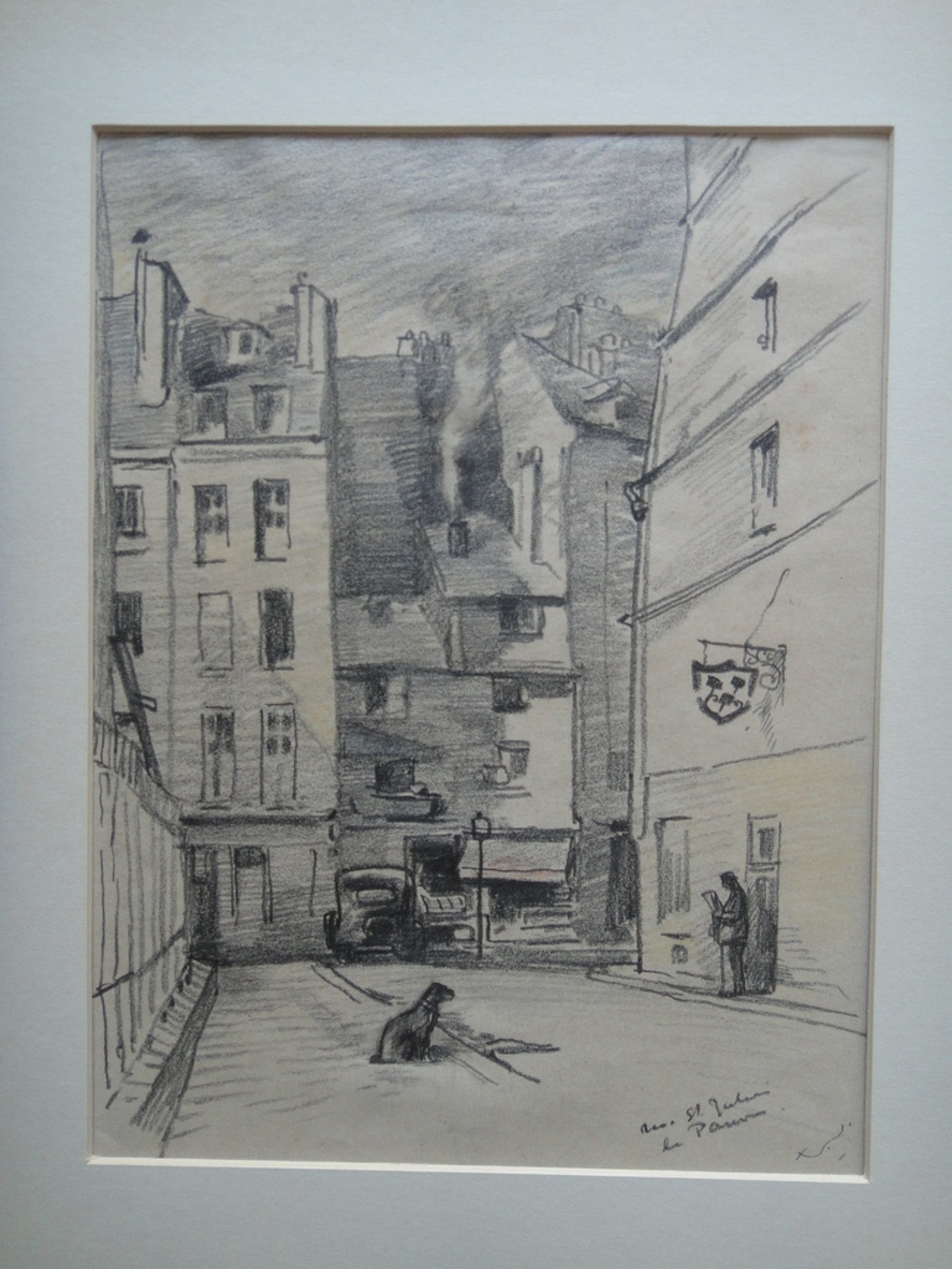 Potloodtekening achter passe-partout van de 'Rue St Ja....' te Parijs.