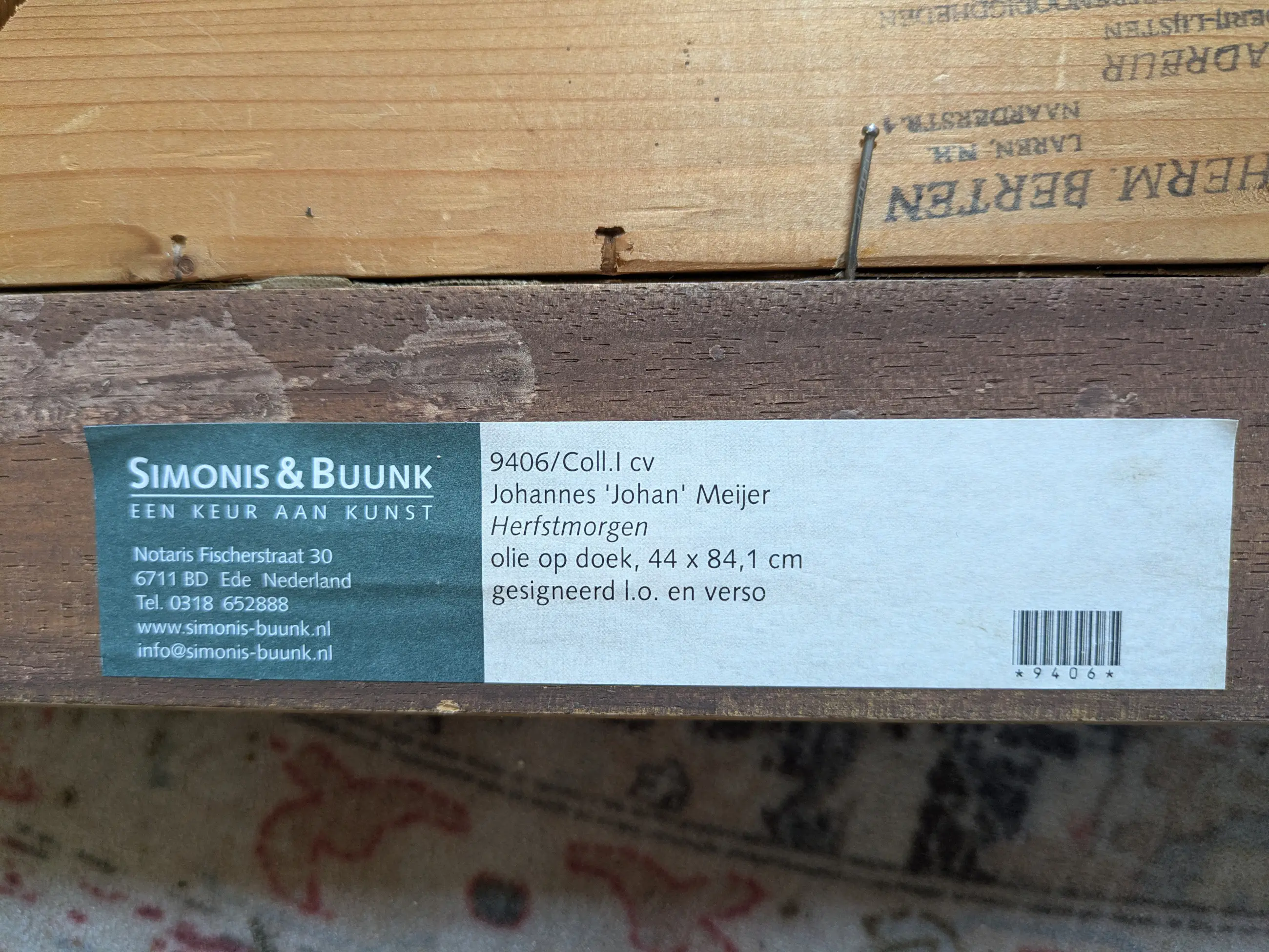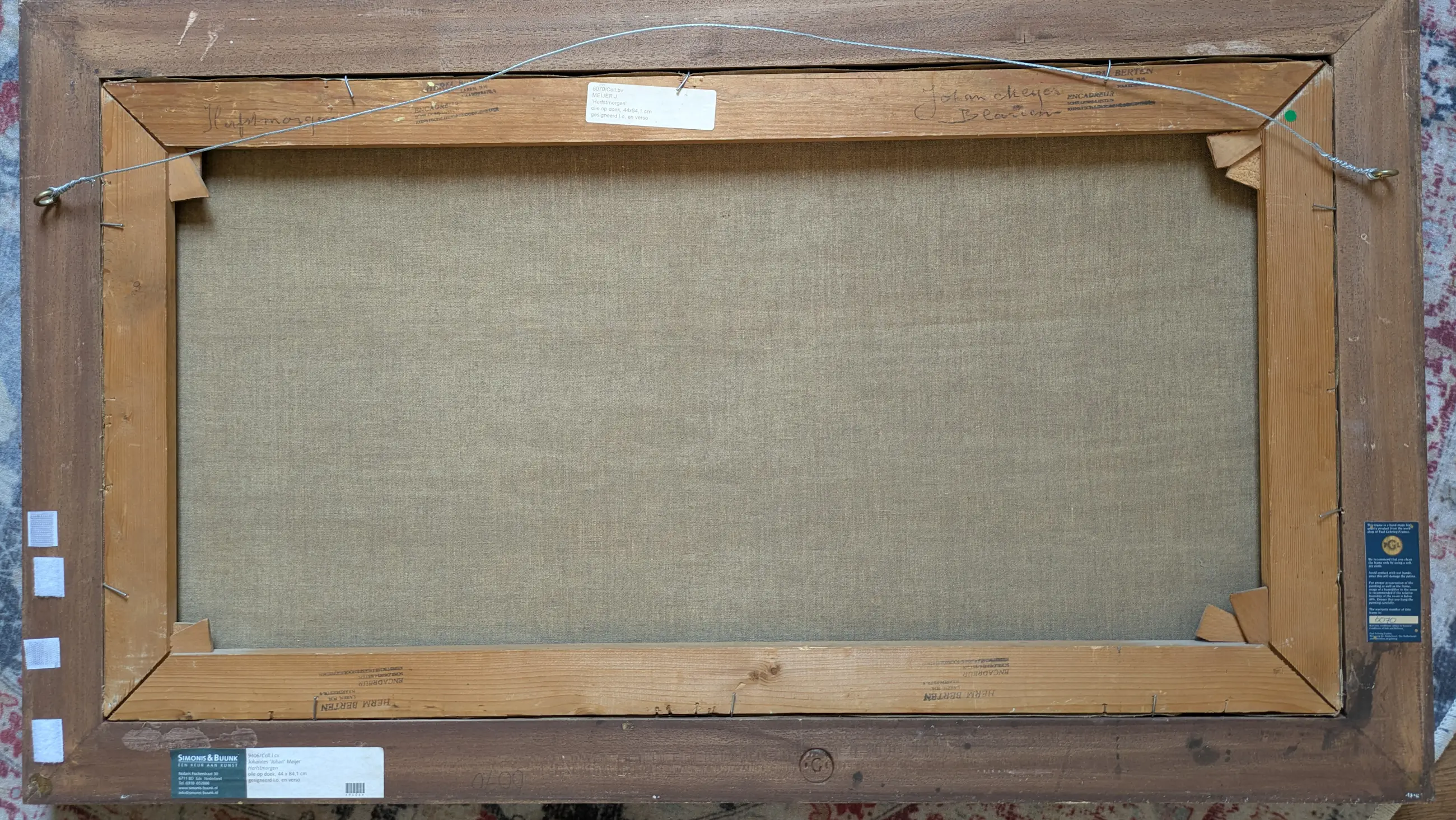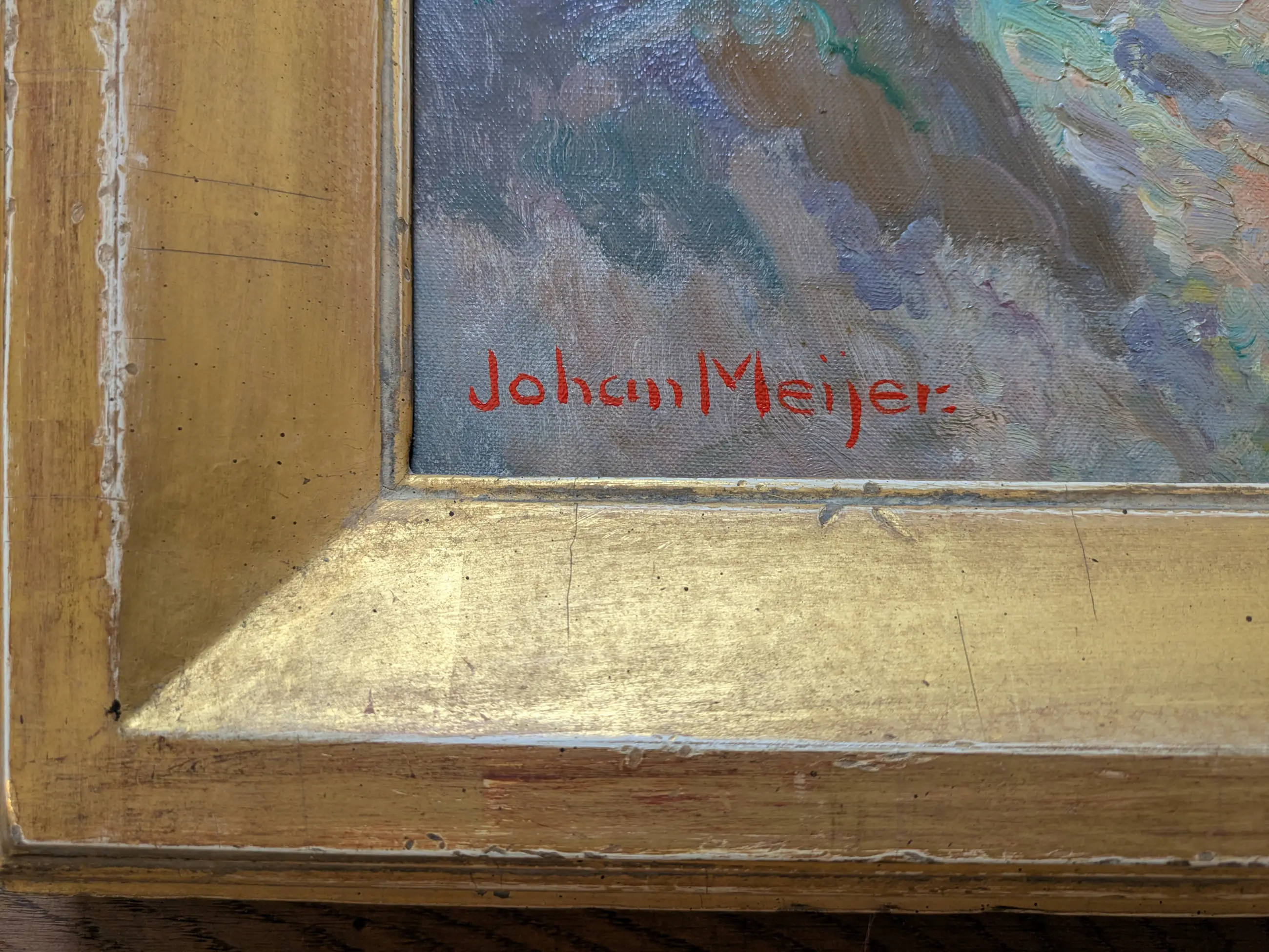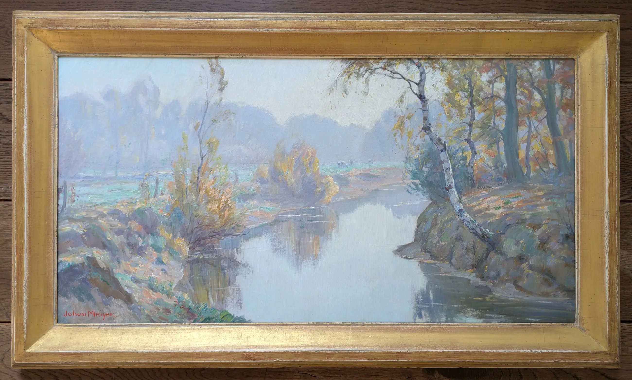 Fraai werk van Meijer in uitmuntende, schone staat. Handgemaakte met bladgoud belegde lijst van Gehring wordt meegeleverd. Voorkeur voor afhalen vanwege afmetingen.