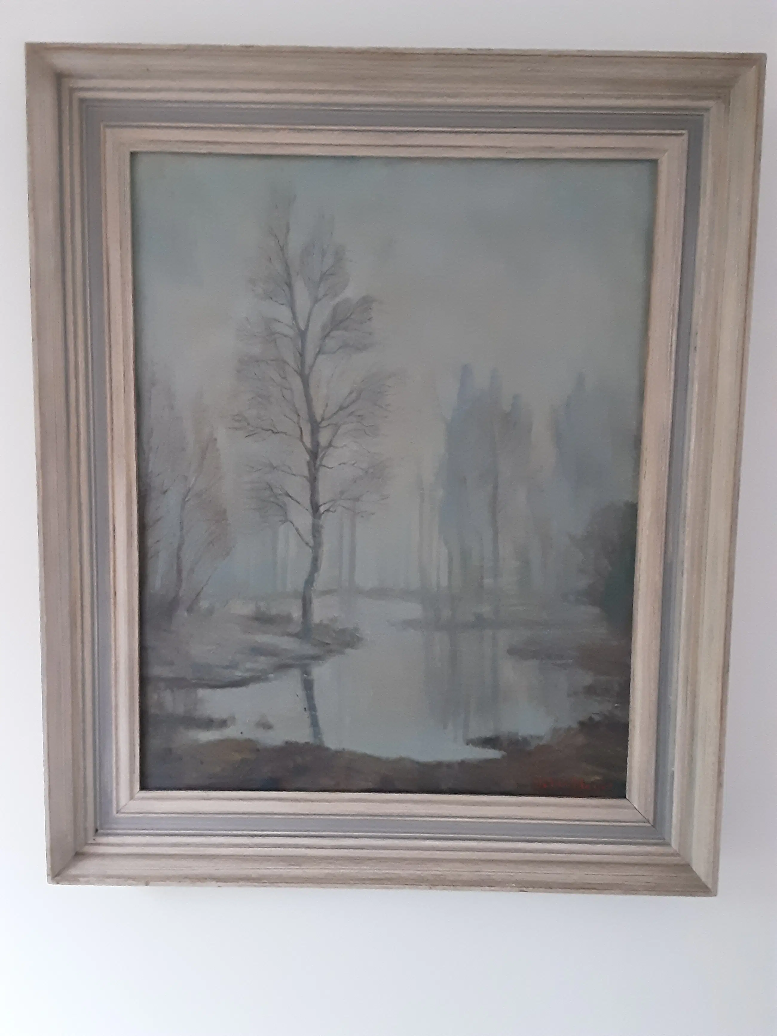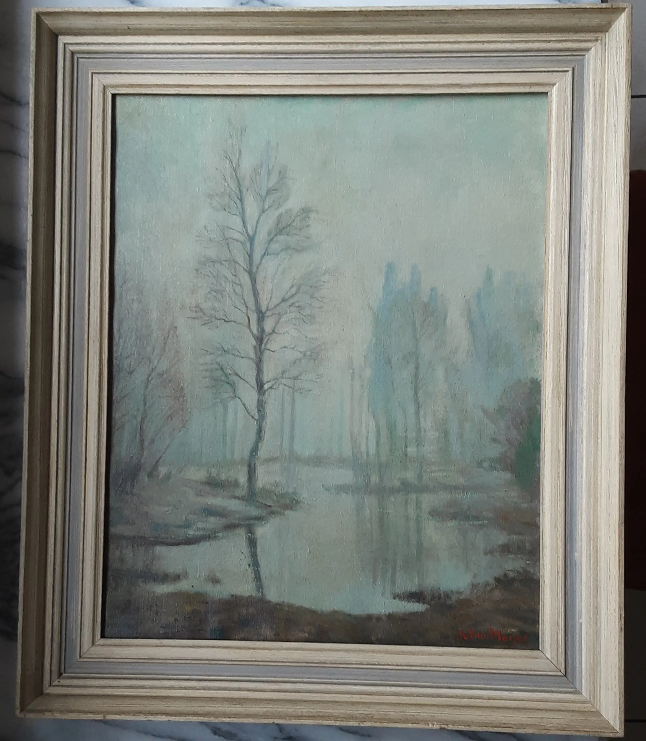 Sfeervol schilderij van Johan Meijer, behorend tot de Larense school. Het schilderij toont een nevelig boslandschap met zachte contouren in blauw/ grijs tinten met wat bruintinten in de grond.