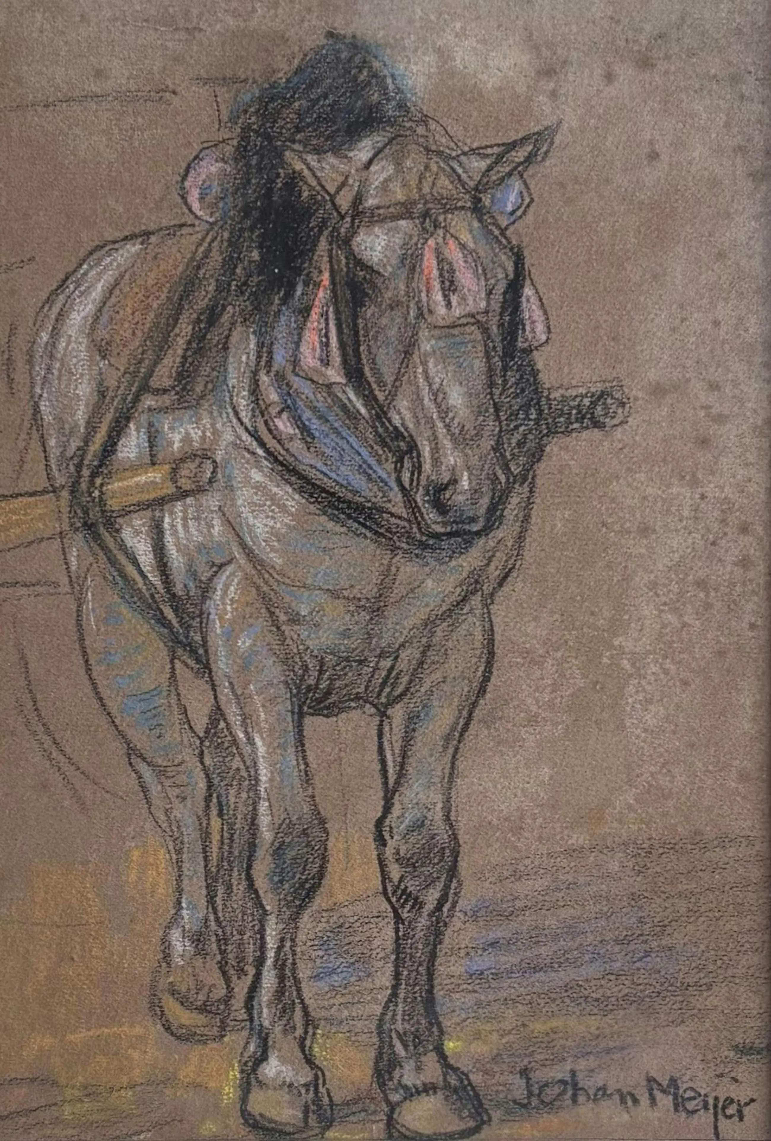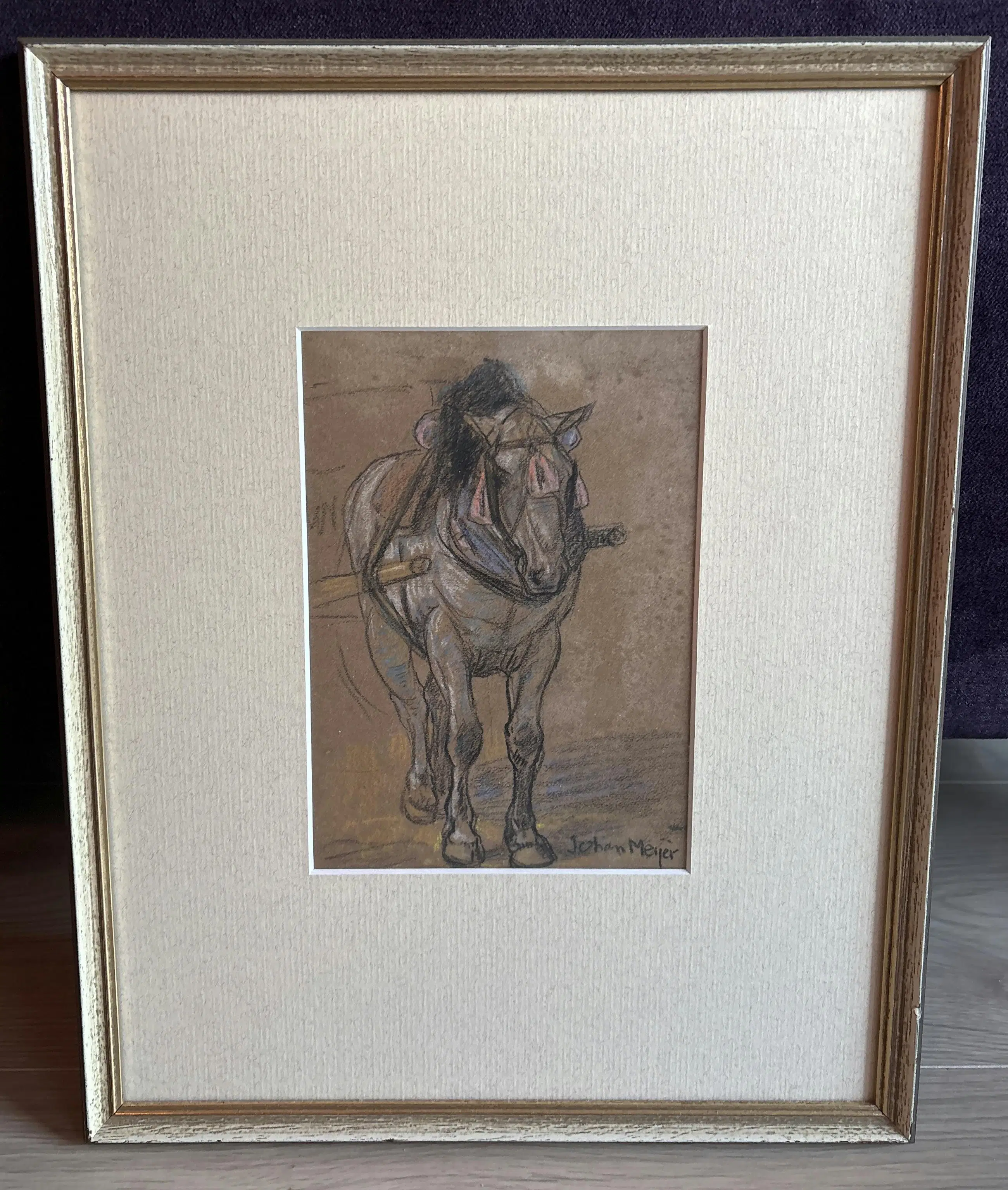 Een mooi ingelijste met zachte kleuren in pastel/krijt tekening van een trekpaard. Handgesigneerd Johan Meijer. Het kunstwerk is in goede staat en klaar om opgehangen te worden.