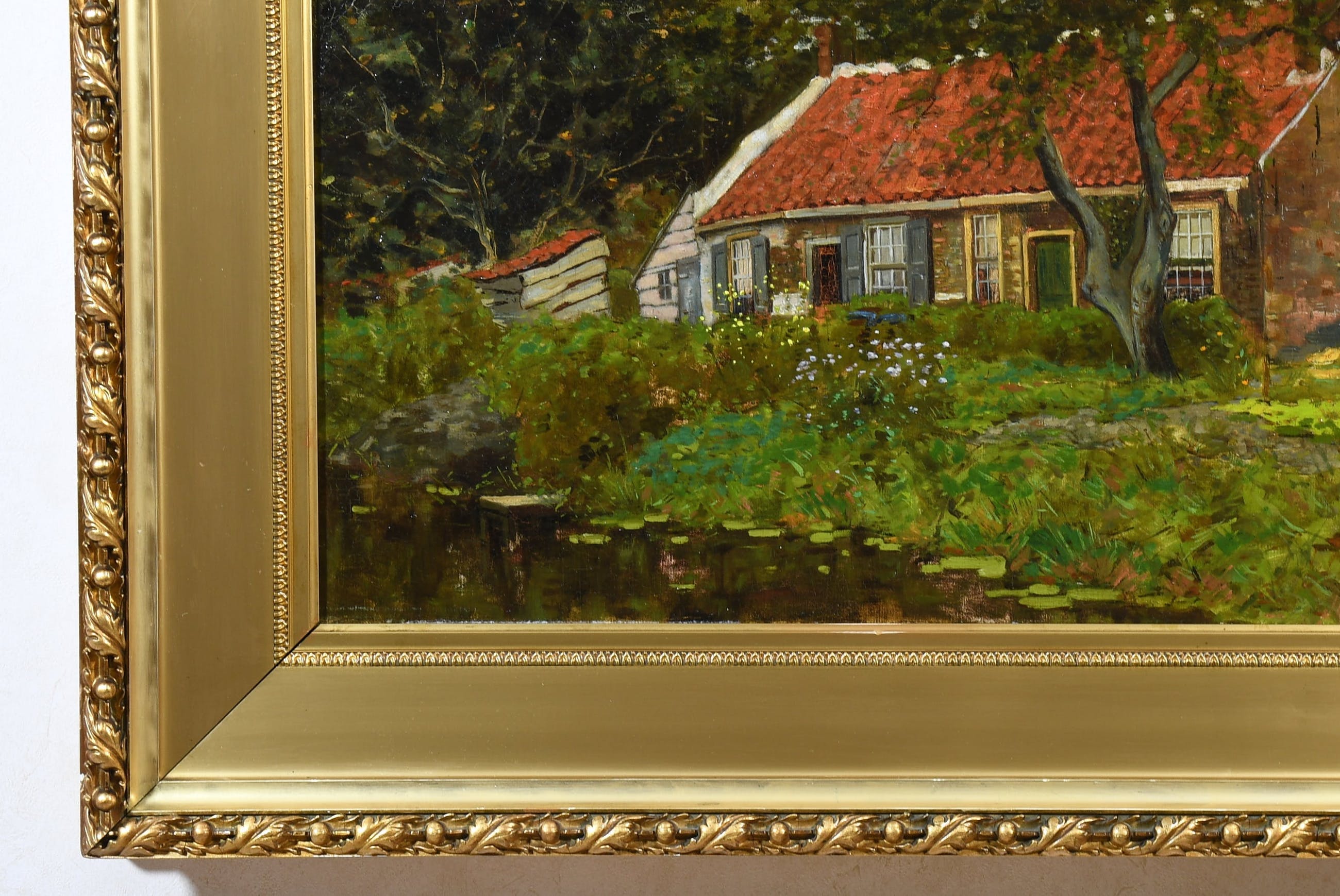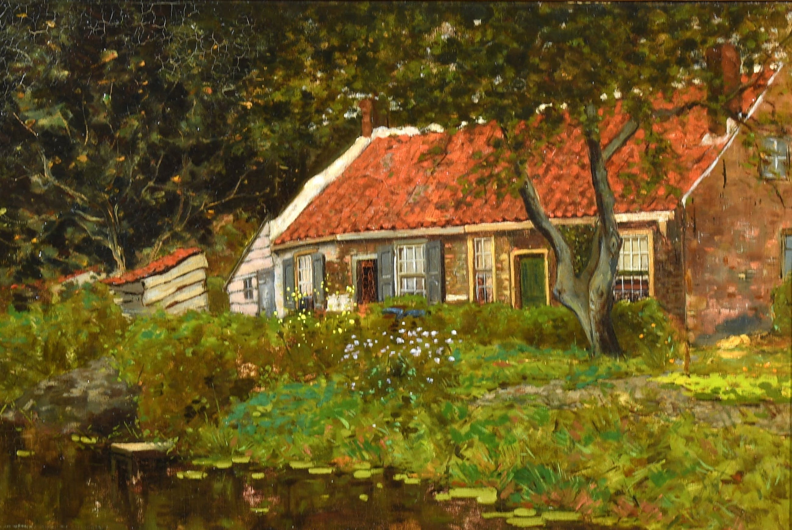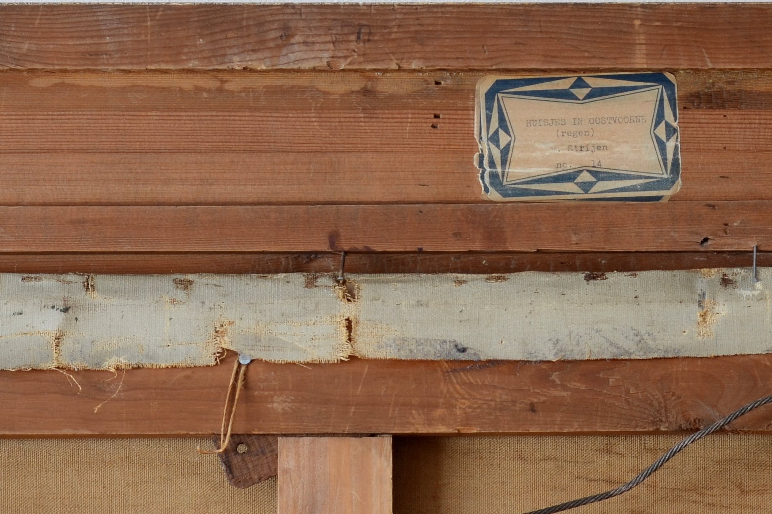 Schitterend schilderij, geschilderd in olieverf op doek rond 1900, van een van de " Duinhuisjes" bij Oostvoorne conform de beschrijving op de tentoonstellingssticker. Kleurrijk geschilderd, goede kwaliteit, originele klassieke lijst, verguld-goudkleurig, toegeschreven aan J.P. van Strijen.Johan Pieter van Strijen, Wijk bij Duurstede 1972 - Wassenaar 1922.Woonde en werkte in Den Haag van 1890 - 1921 en daarna in Wassenaar.Schilder van landschappen, tentoonstellingen in Amsterdam 1895 en Den Haag.