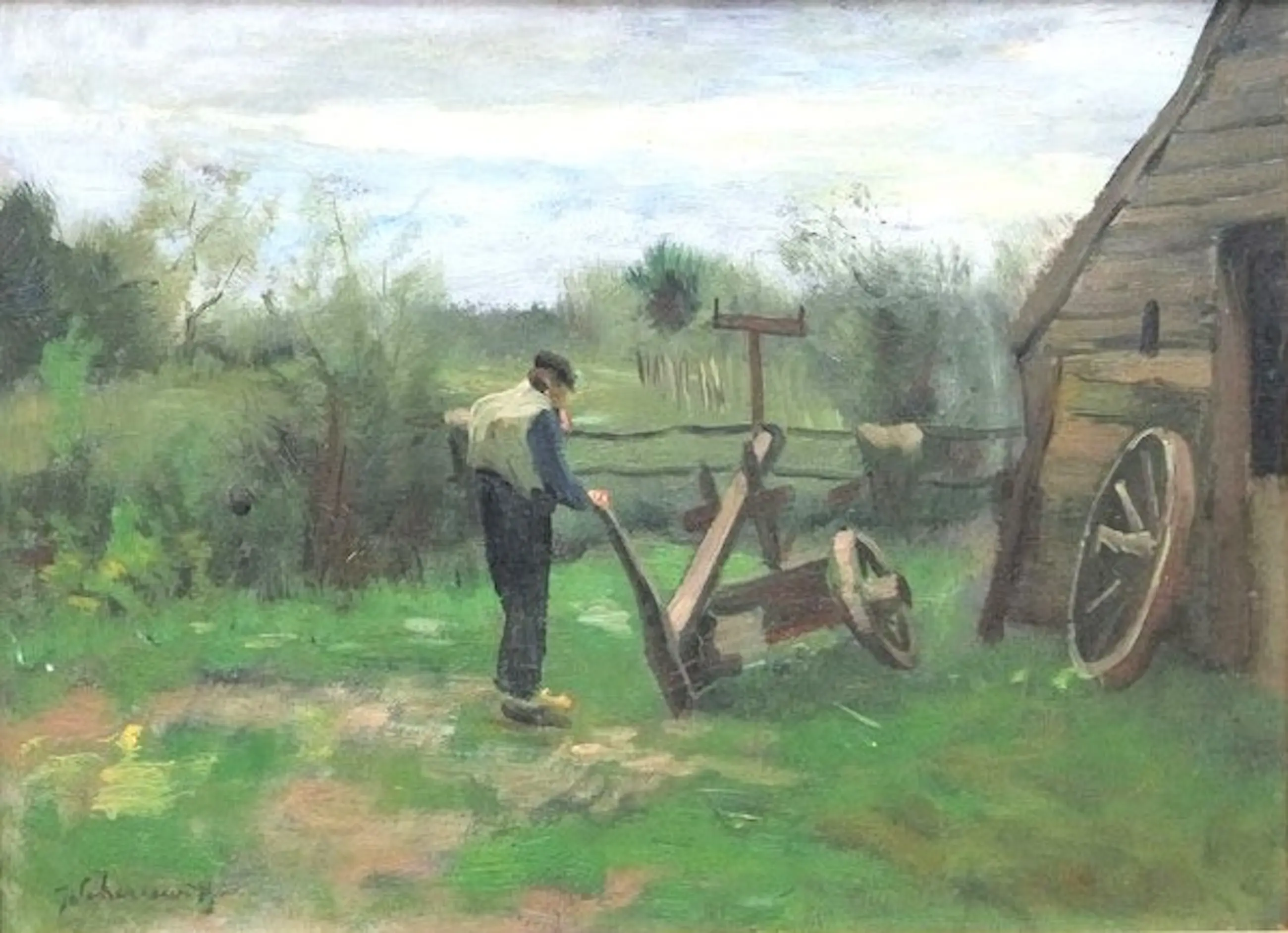 Een prachtig genre schilderij ( "boer met ploeg", olieverf op doek op board ) van de Nederlandse kunstenaar Johan Frederik Scherrewitz (1868-1951). 2de generatie Haagse School. Met een mooie lijst. Gesigneerd links onder. Afmetingen met lijst: 39 cm. x 49 cm. boardmaat: 28 cm. x 38 cm. De algemene conditie van het schilderij is goed. Het werk is te bezichtigen bij Kunsthandel Martins te Wolvega en wordt geleverd met een echtheidscertificaat.