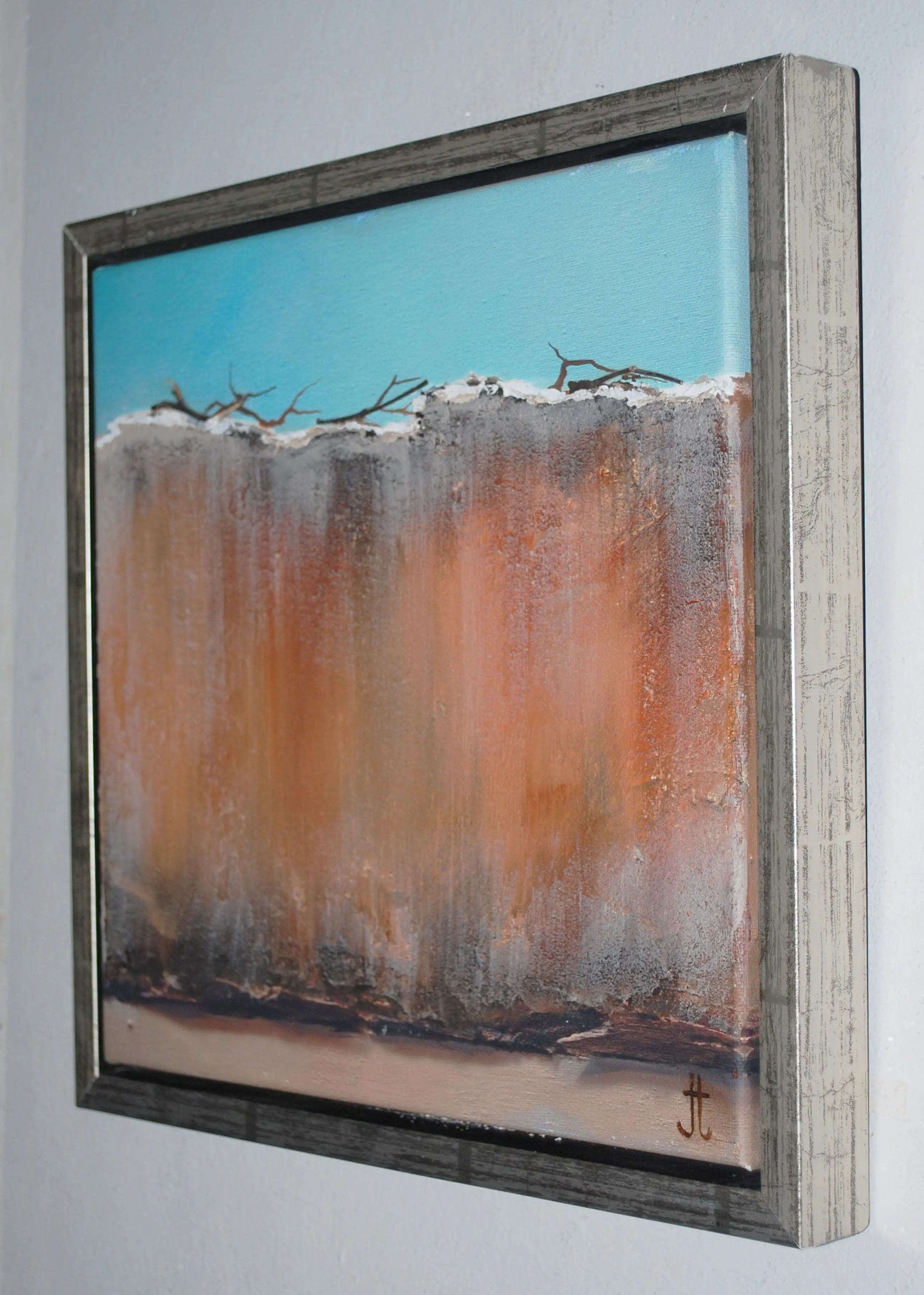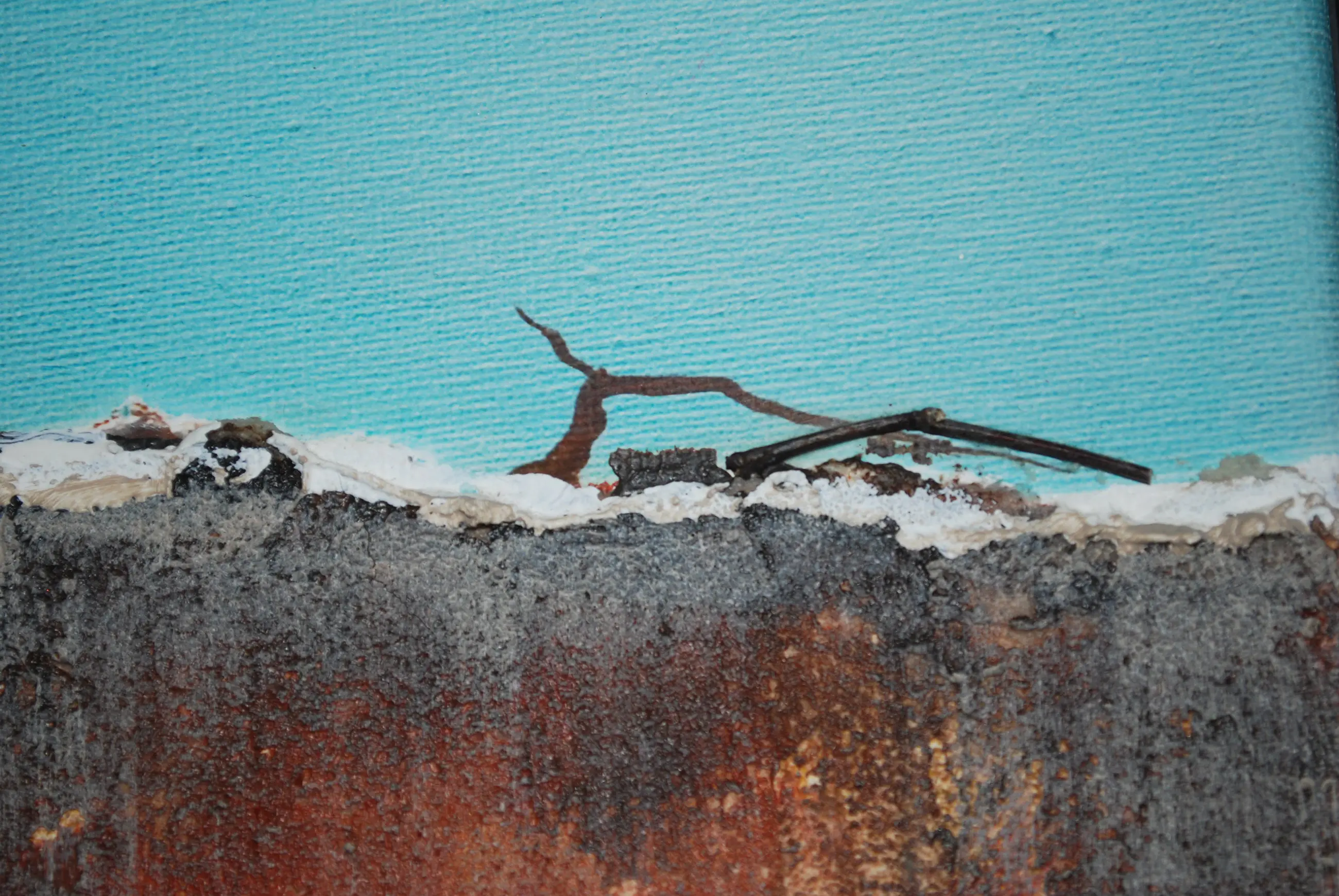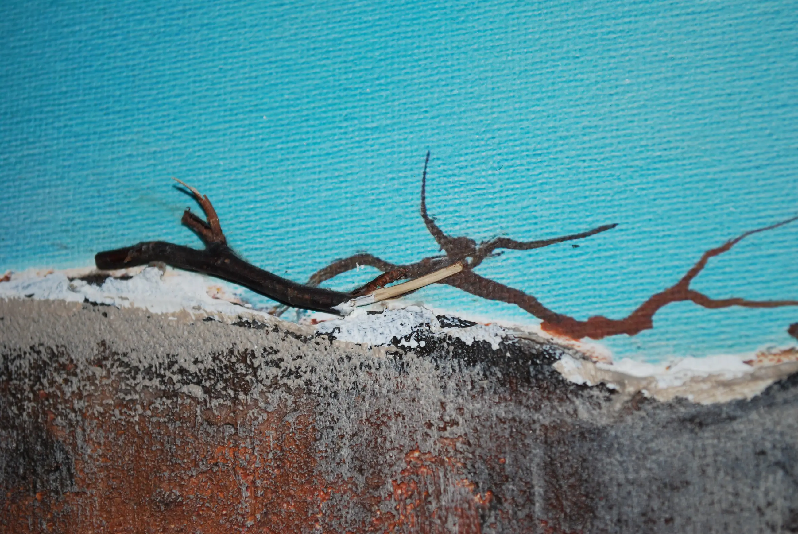Fascinerend werk, met optische illusies. Afwisselend pasteus en glad. Bovenaan zijn echte takjes bevestigd.