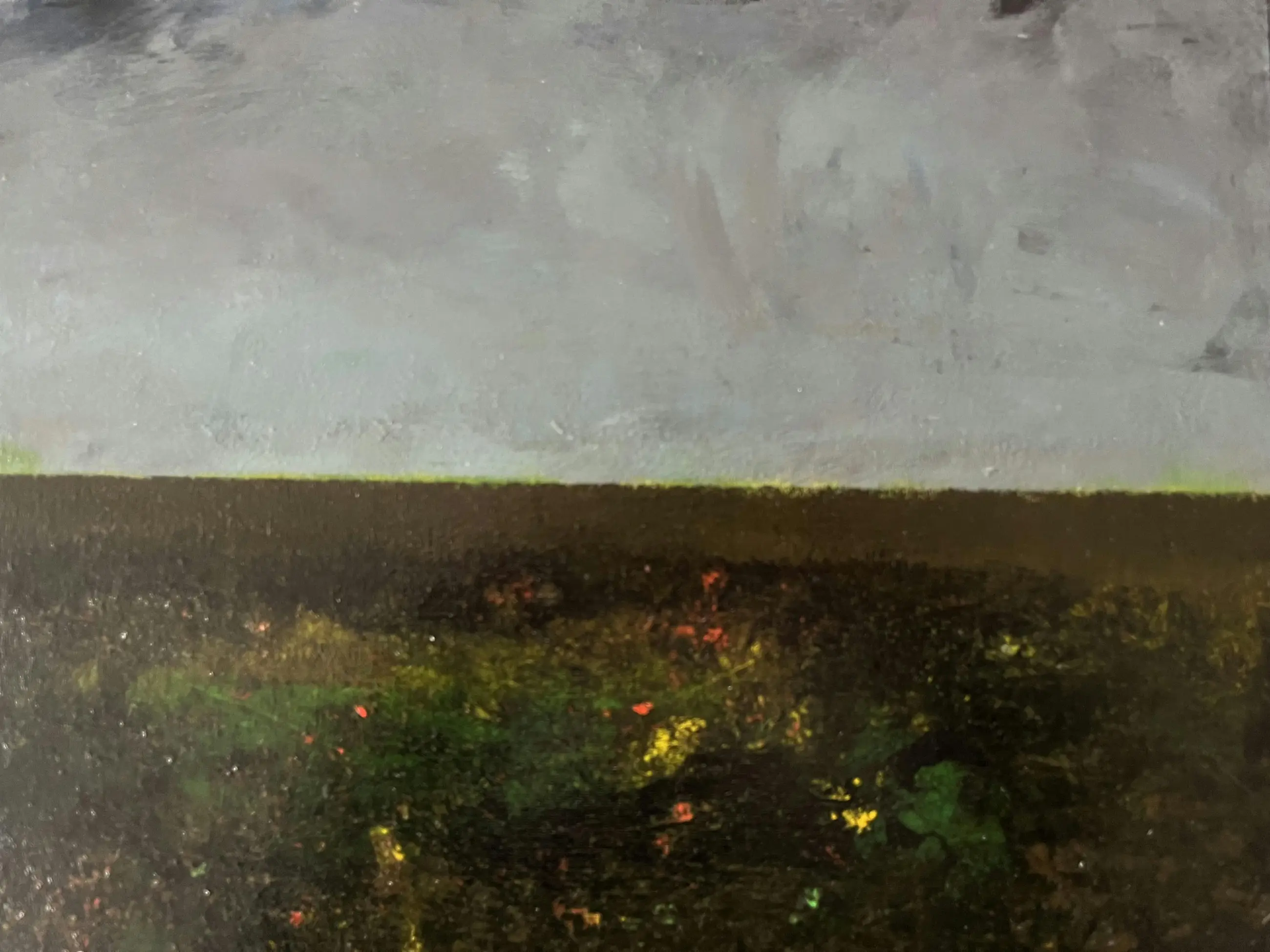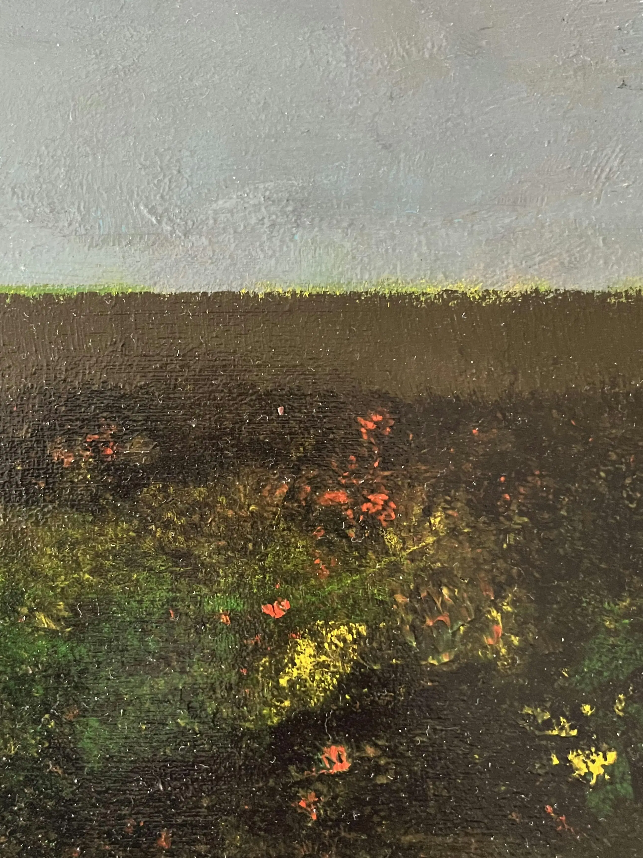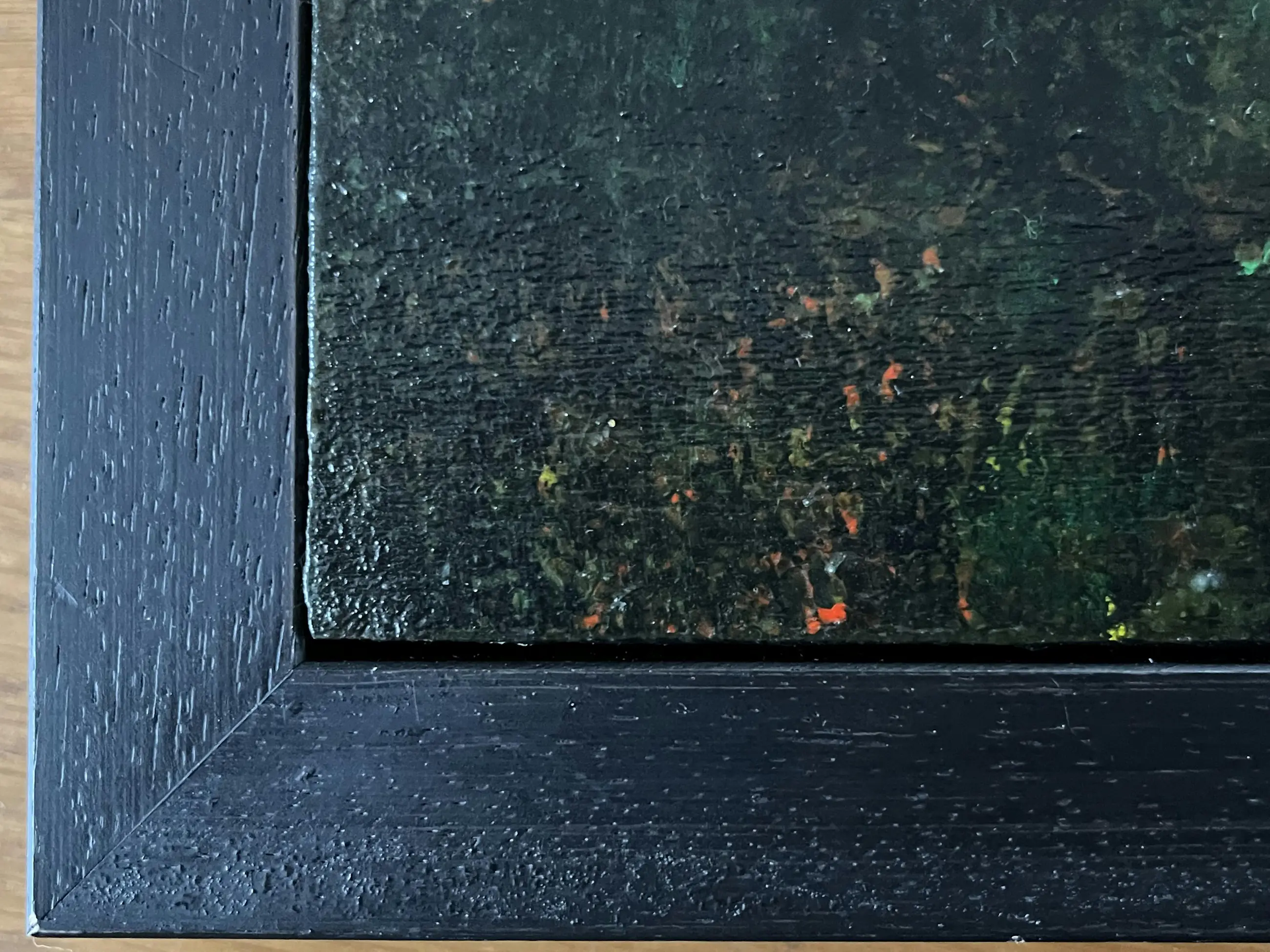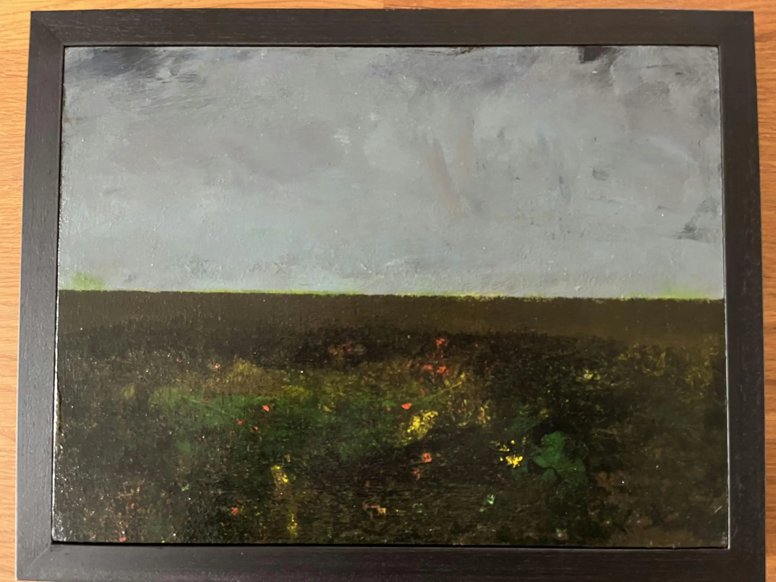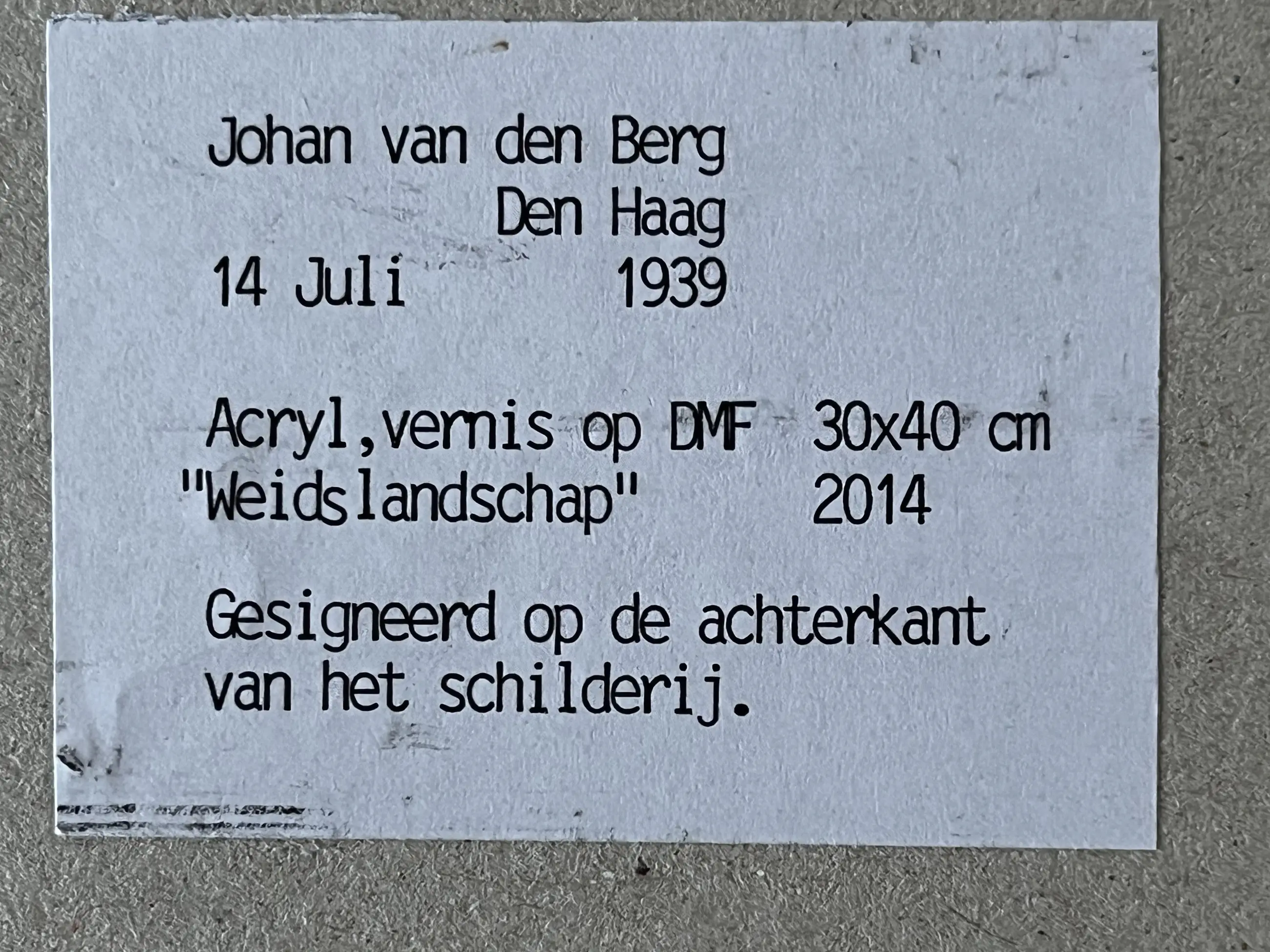 Fraai geabstraheerd landschap uit 2014 op MDF. Aan achterzijde gesigneerd. Afmeting werk 30 x 40 cm. Inclusief zwartgeverfde houten lijst 35 x 45 cm.