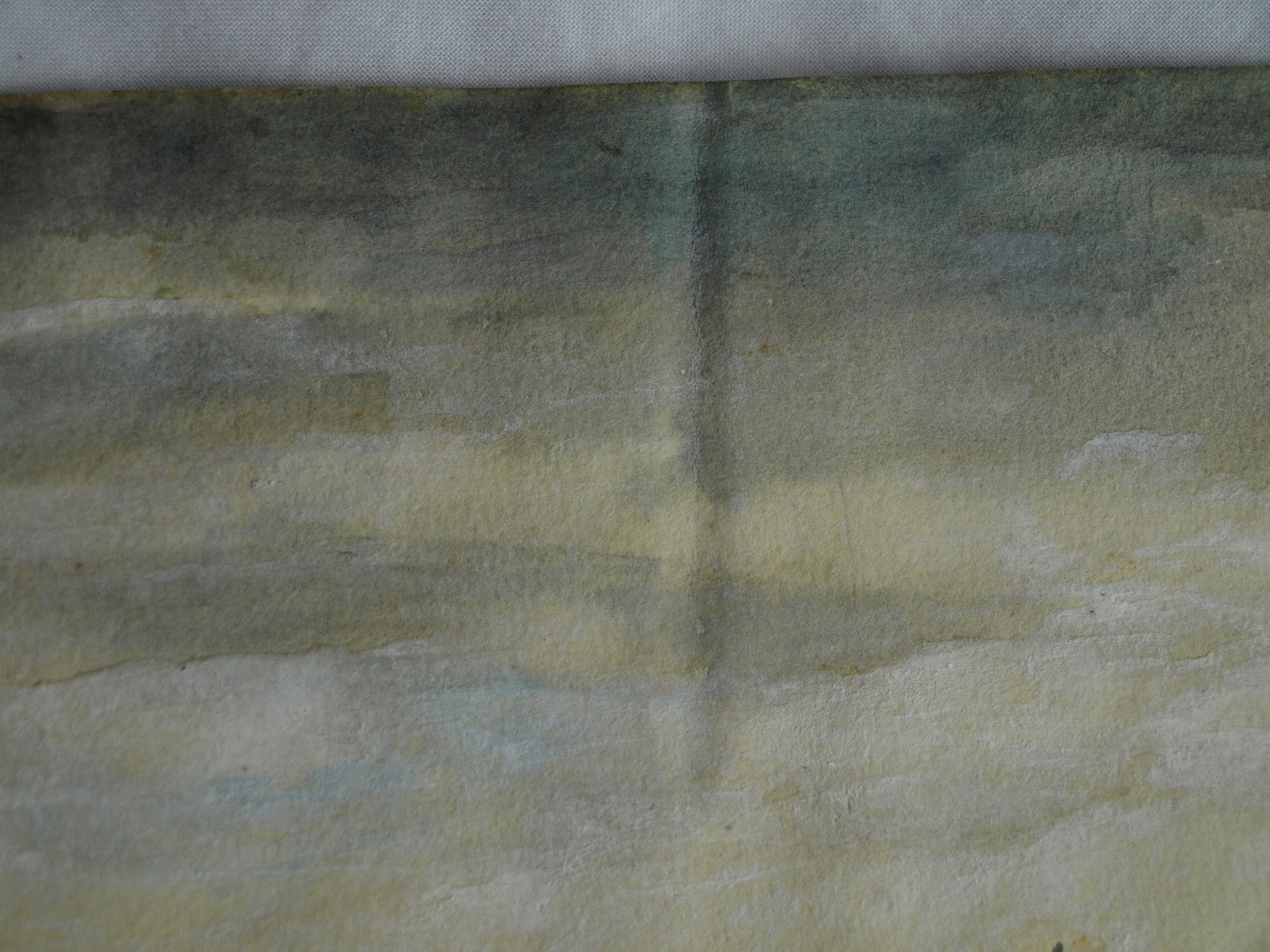 -Conditie: Het papier is ‘vergeeld’ en heeft een paar ‘zuurvlekjes’ en heeft tape-resten in de linker- en rechter bovenhoek. Het papier heeft een verticale ‘vouw’ aan de bovenrand (zie de 11e foto).