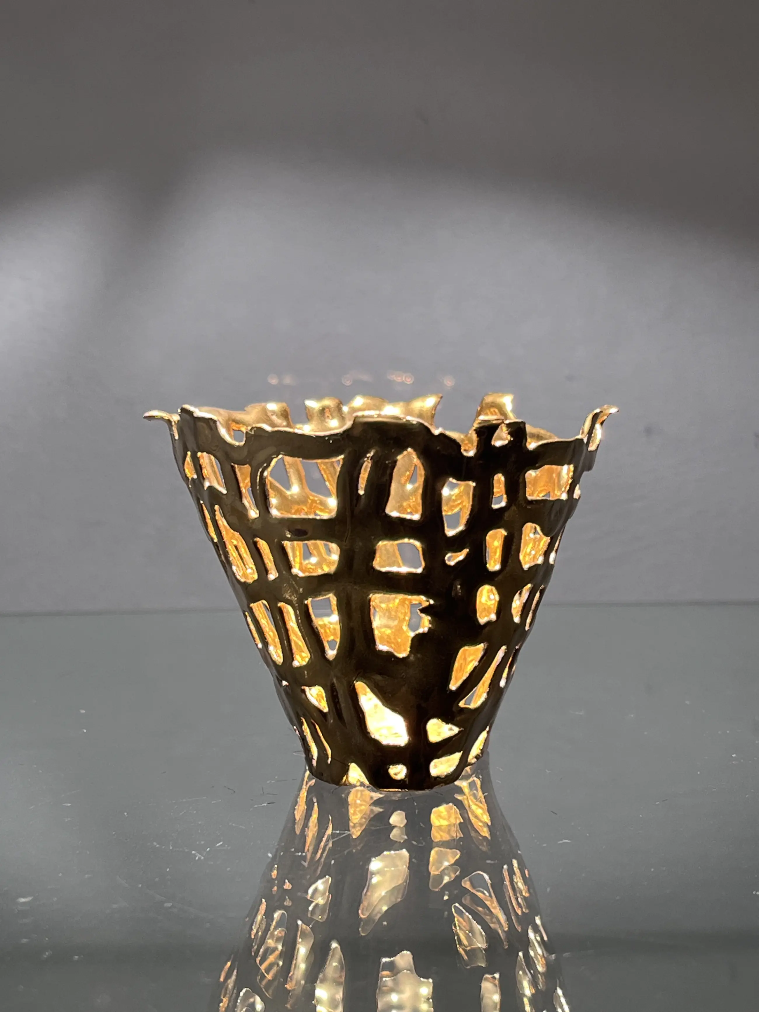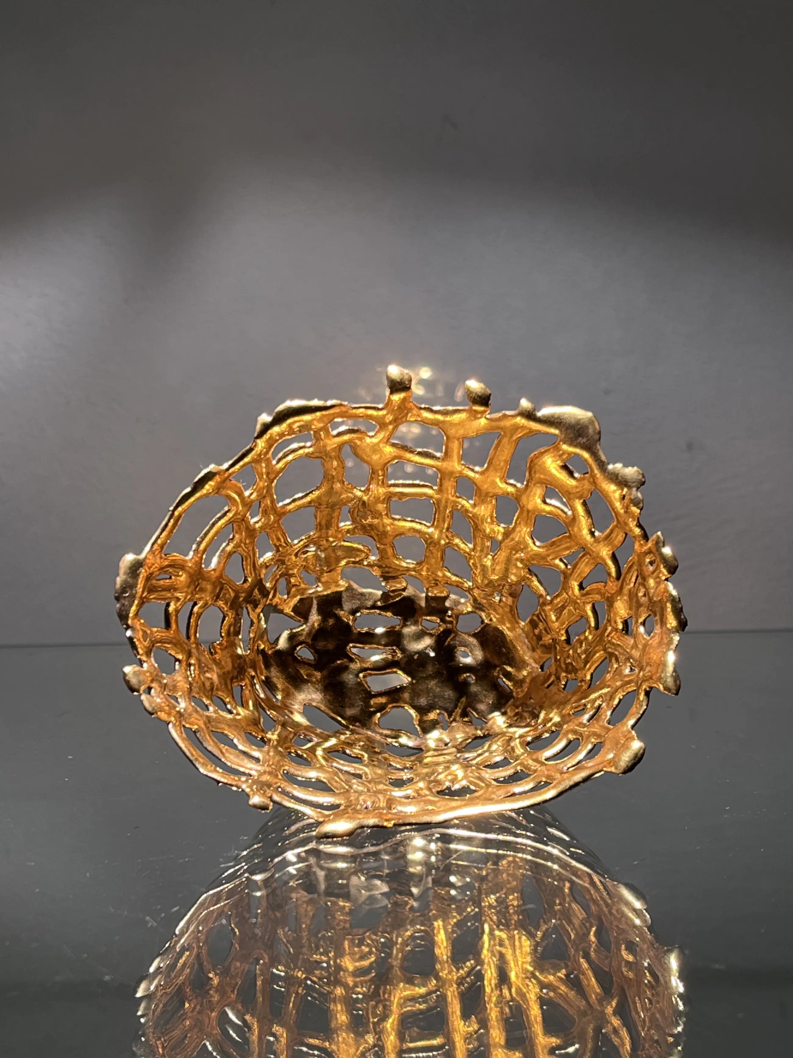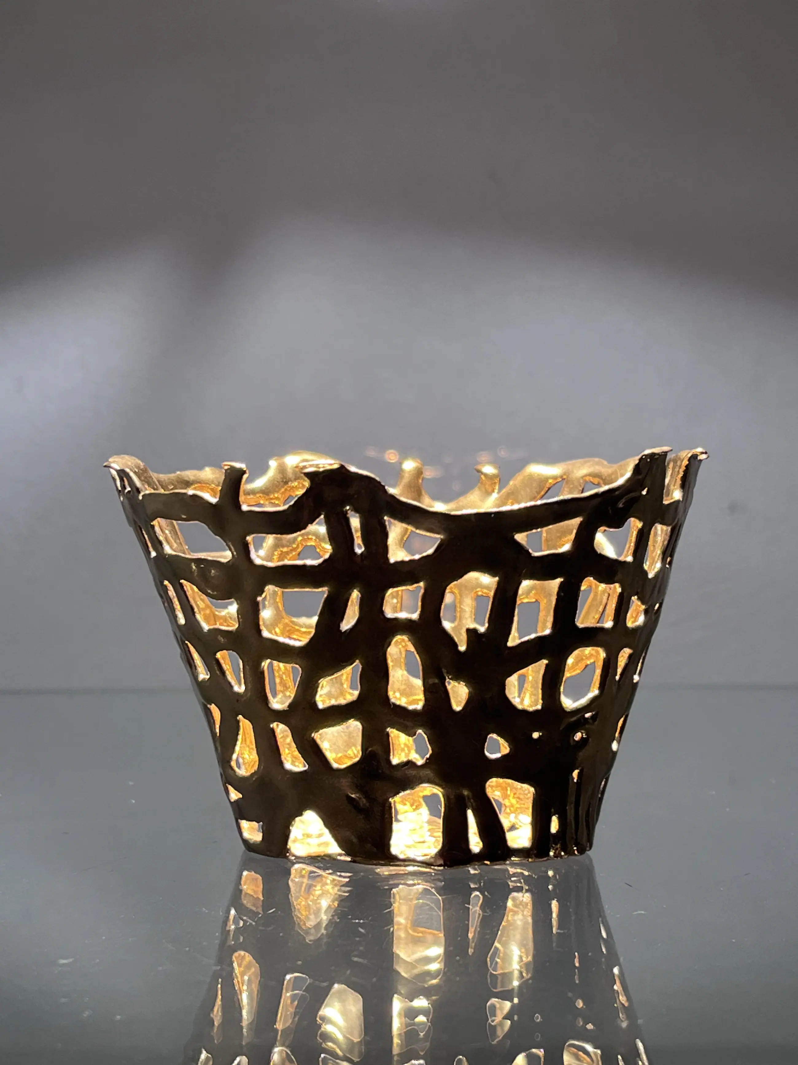 Een uit porselein stokjes geweven korf van Master hij verwijs weer naar de textiel technieken met deze werk . Het korf compleet met 14 karat goud luster geglazuurd .