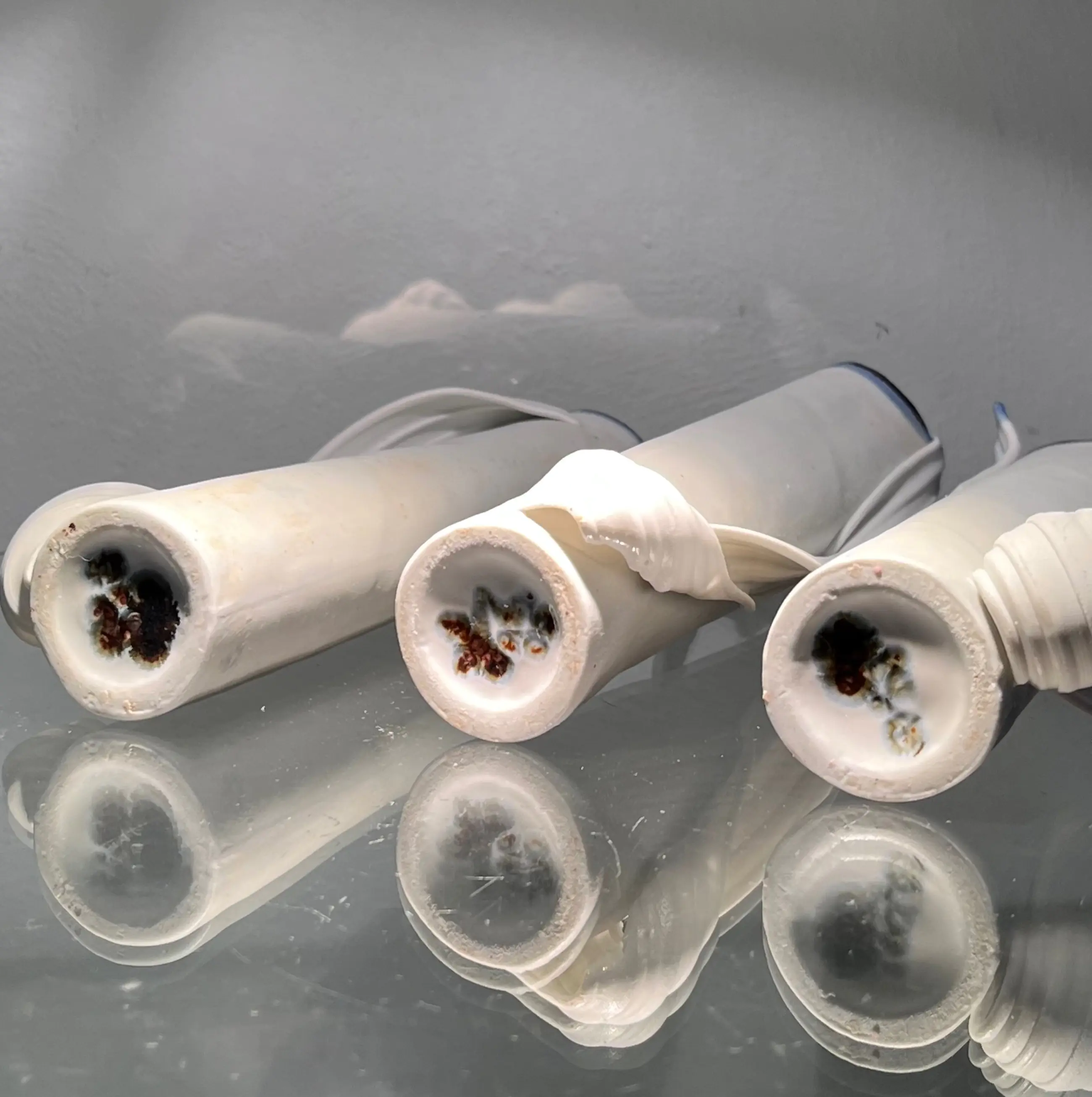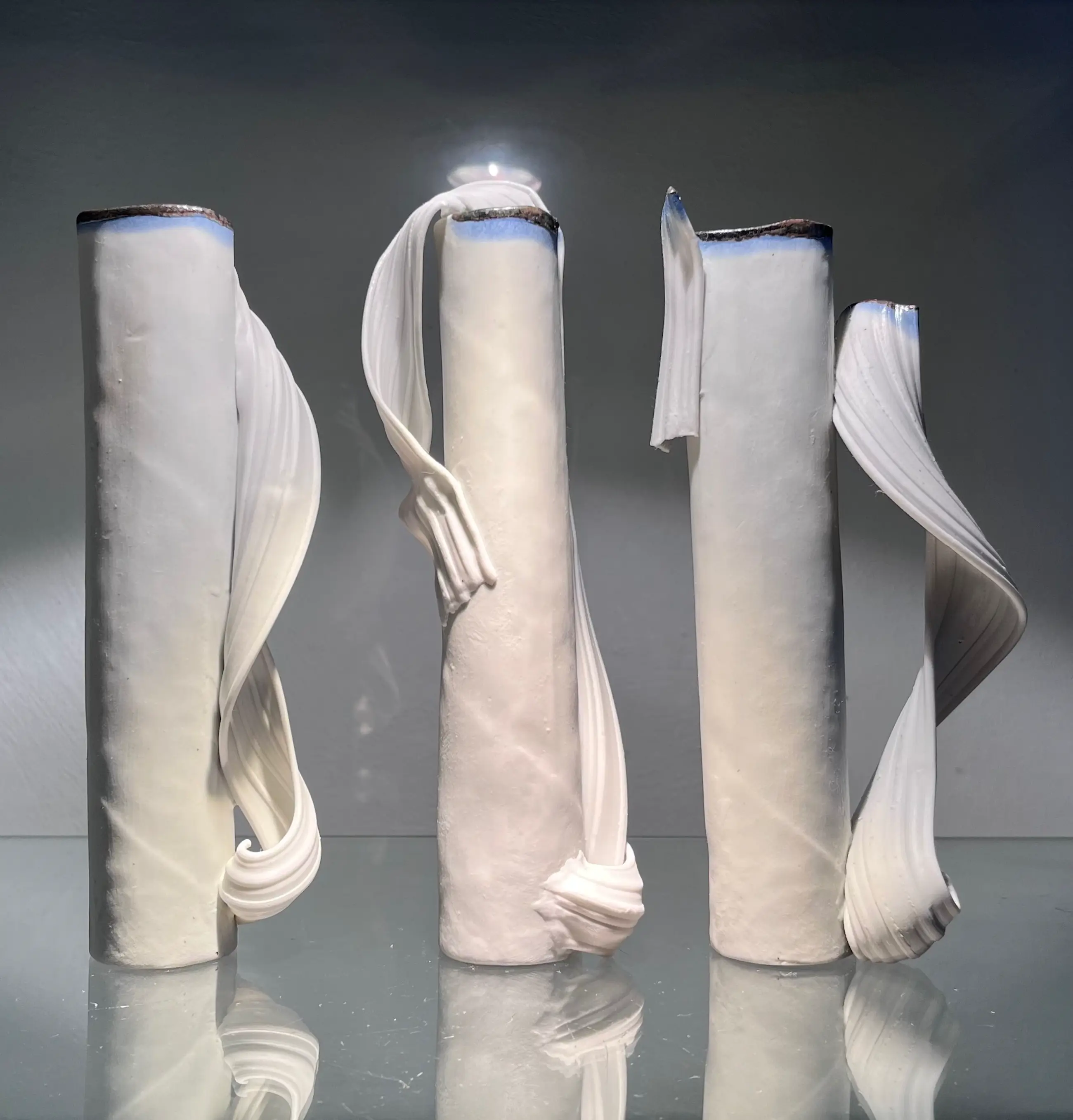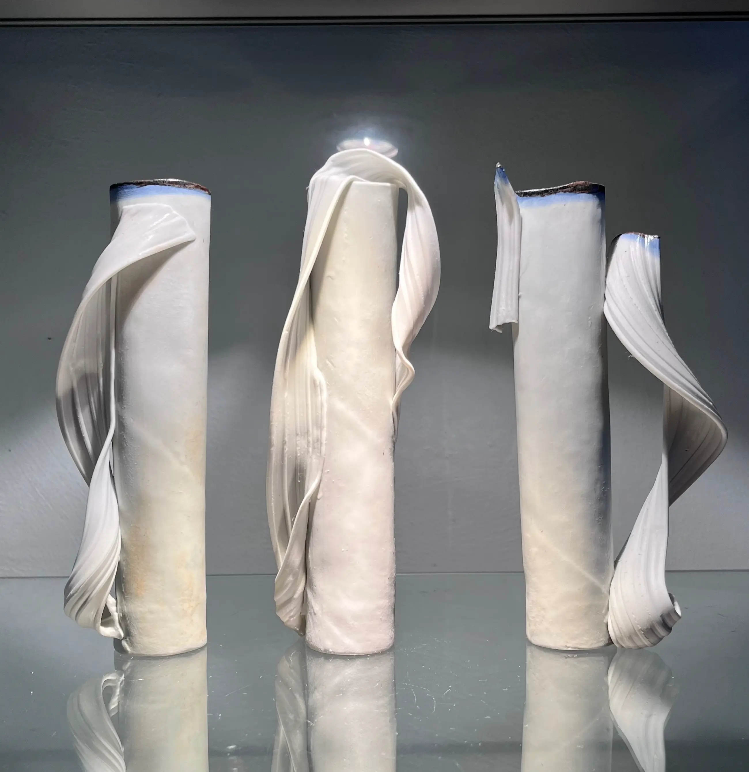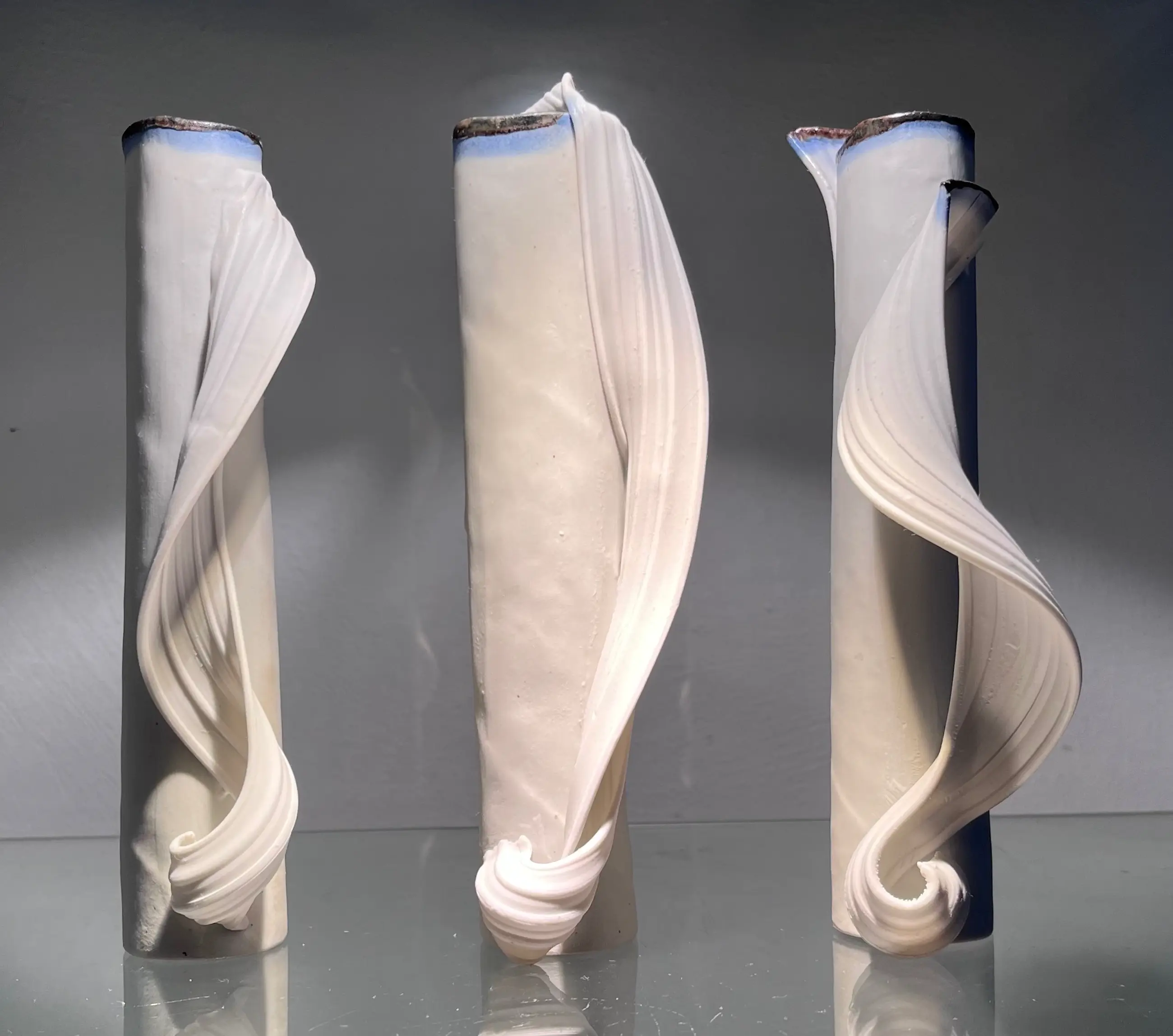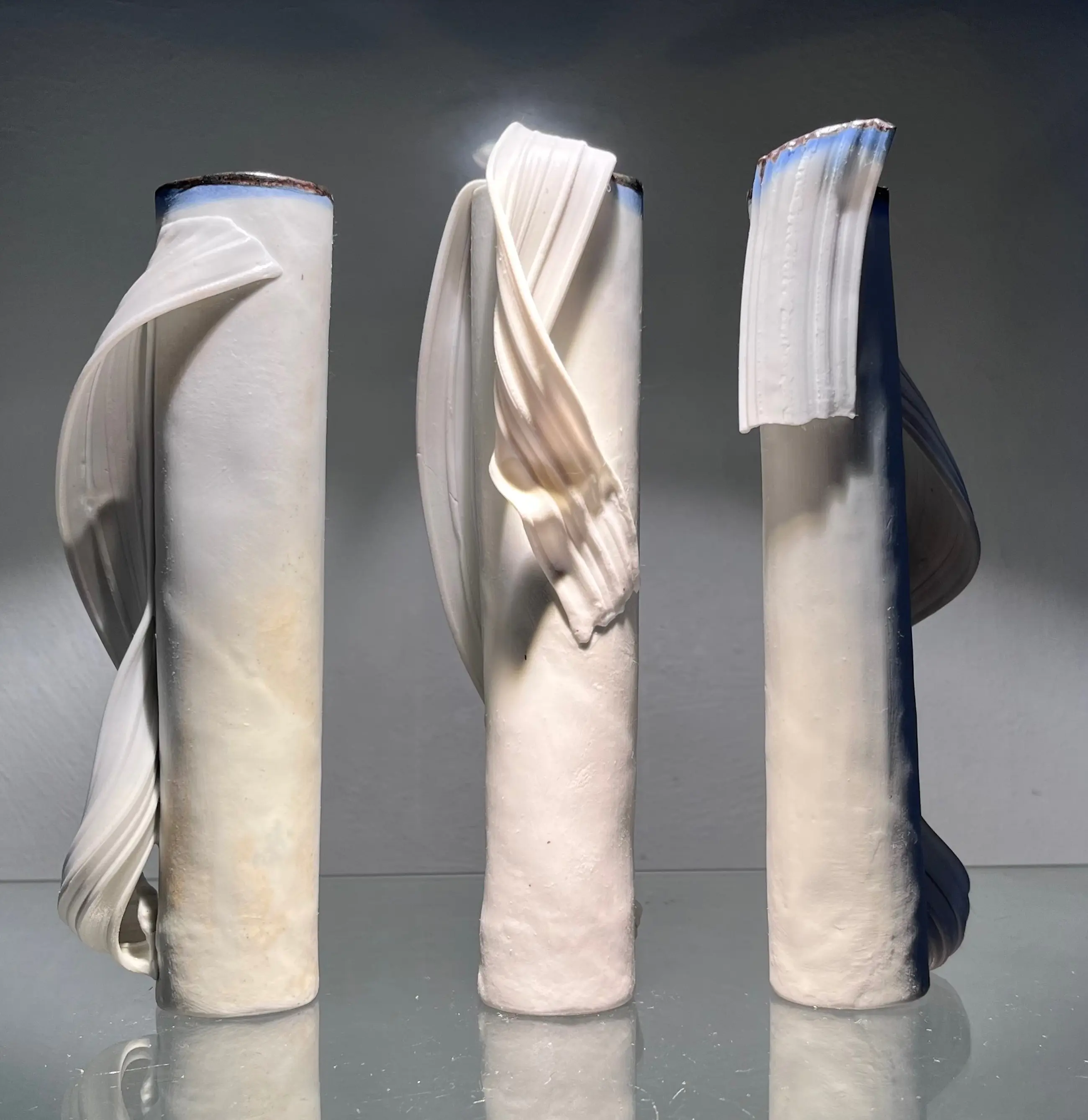 Een porselein triptiek vaas object van het jaar 2008 . Porselein Extrude bedekt en omhield de grondvorm zoals een sluier. Weer typerend werk van Master in het concept van “Klei als textiel lap “
