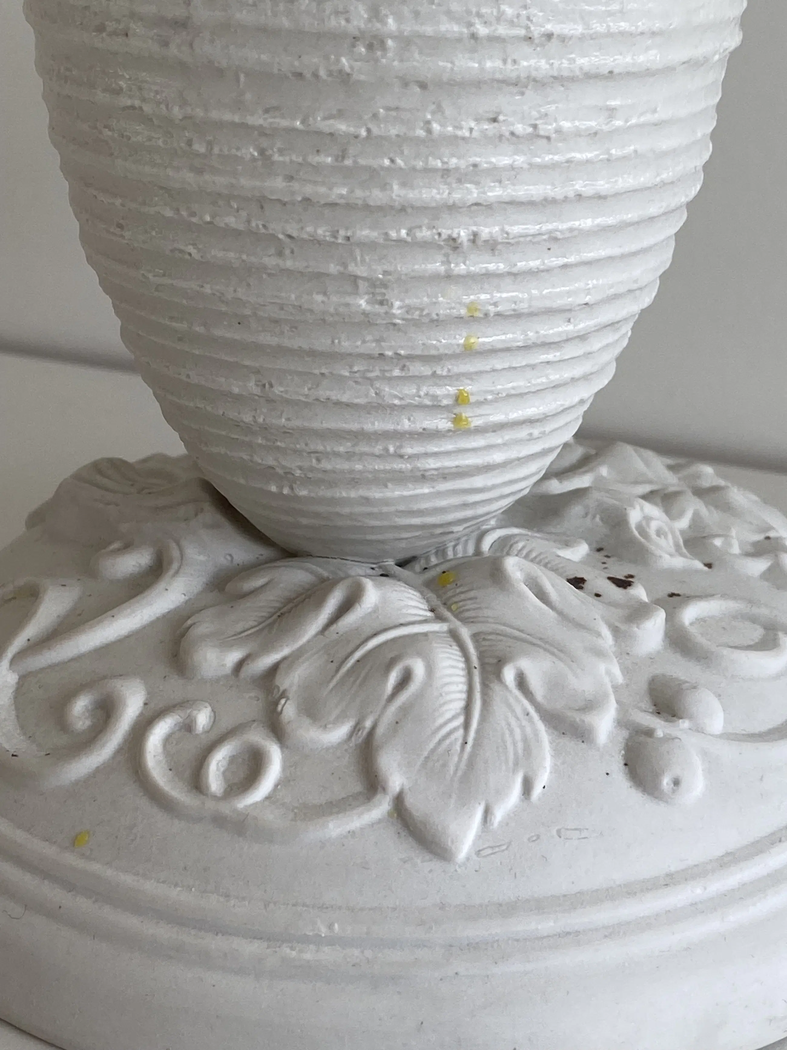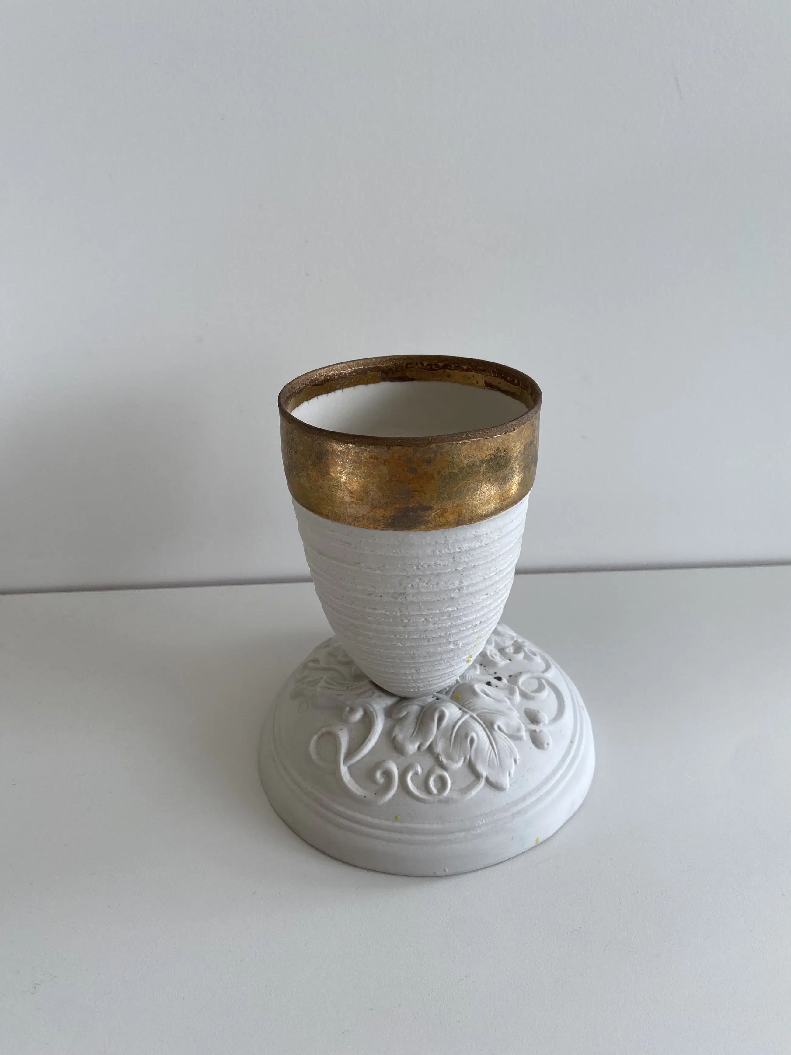 Klein kelkvormig object. Met de hand gedraaid in porselein. Op brede gegoten voet. De rand van de kelk voorzien van een goudkleurig glazuur. Hier en daar enkele spikkels die tijdens het bak proces in de oven zijn ontstaan. Verstild object in de typerende ietwat barokke stijl van Johan van Loon. Gesigneerd. Aan de onderzijde is een dunne haarscheur te zien. Deze loopt niet door in de voet of kelk.