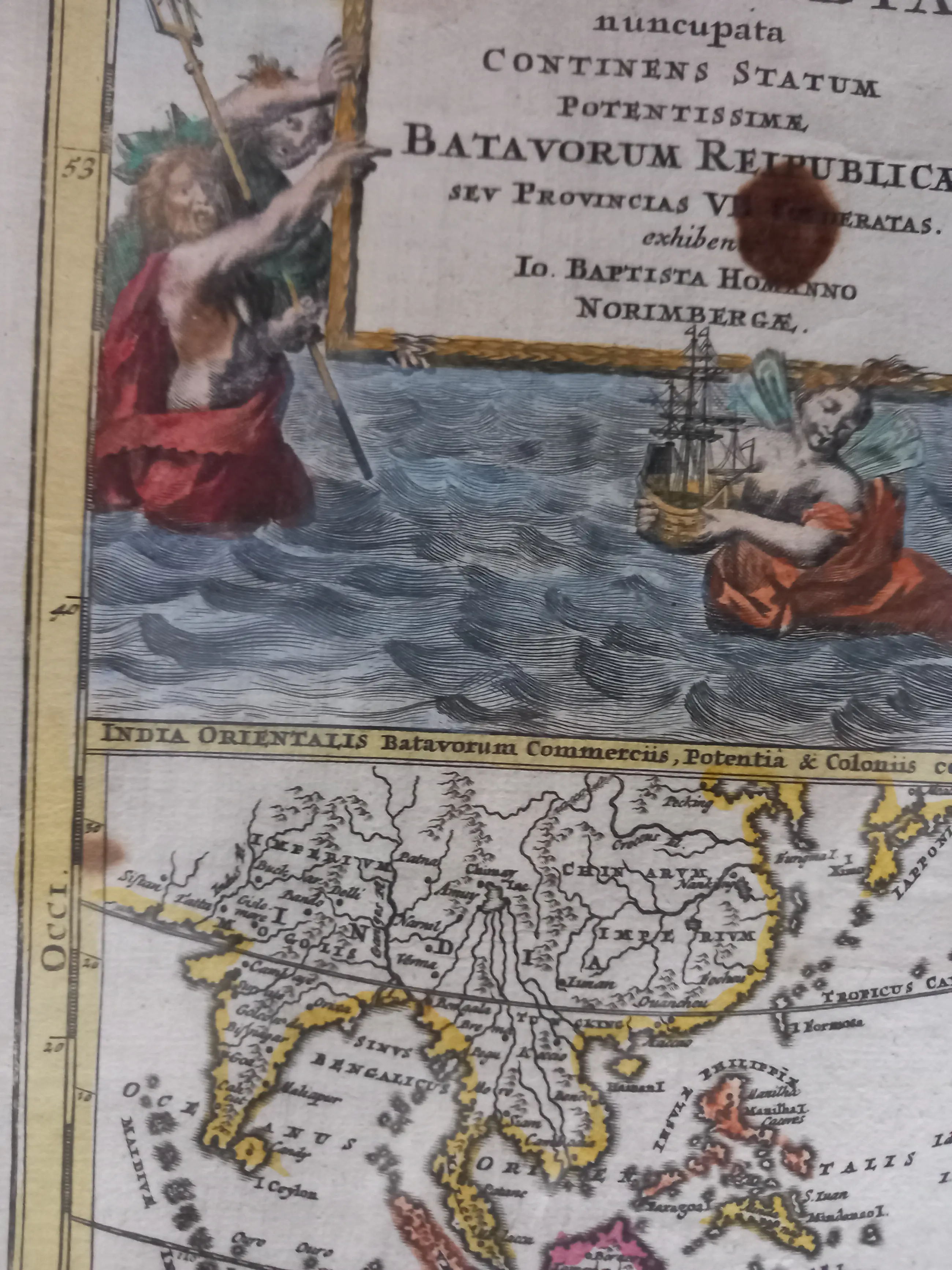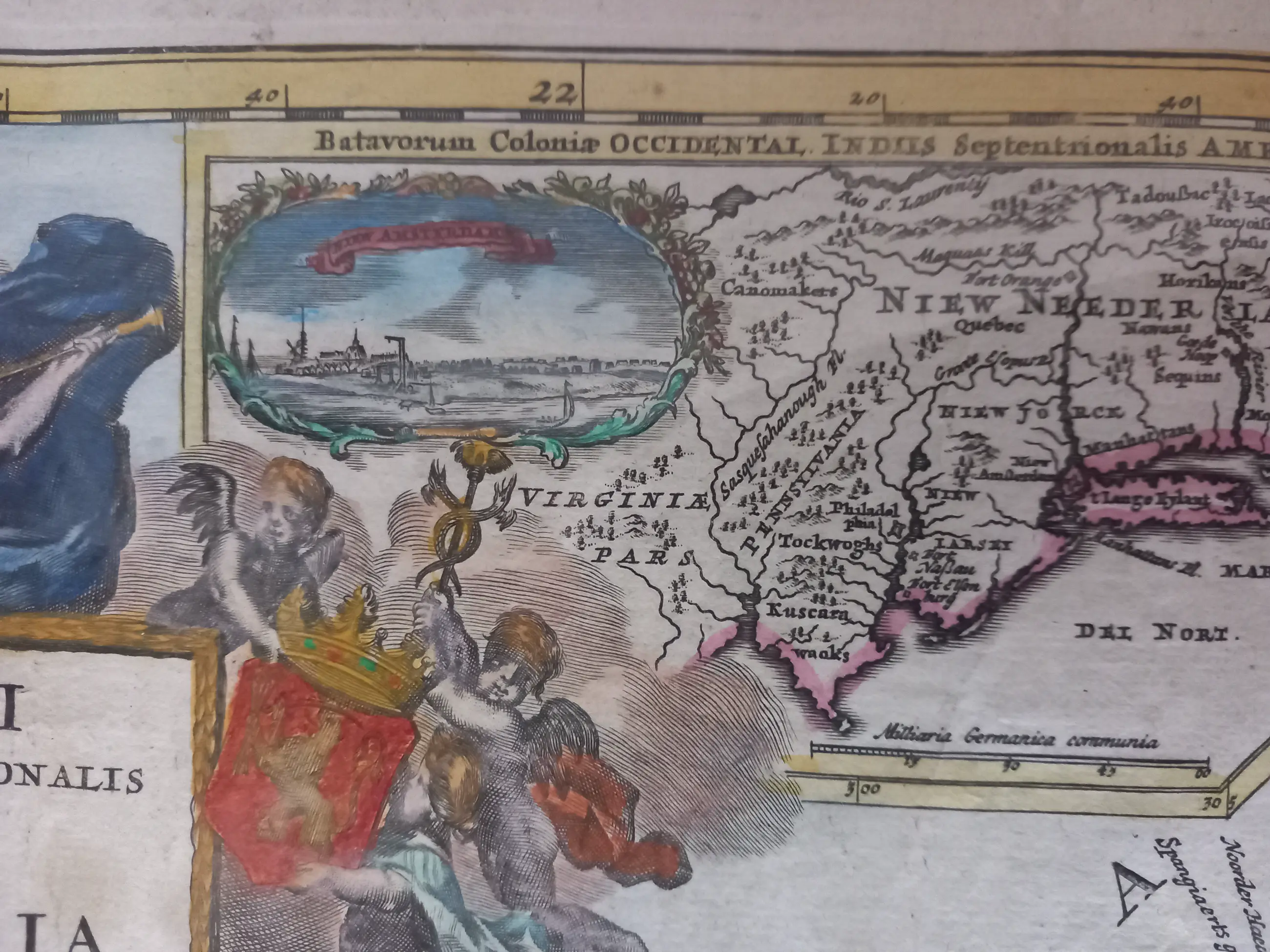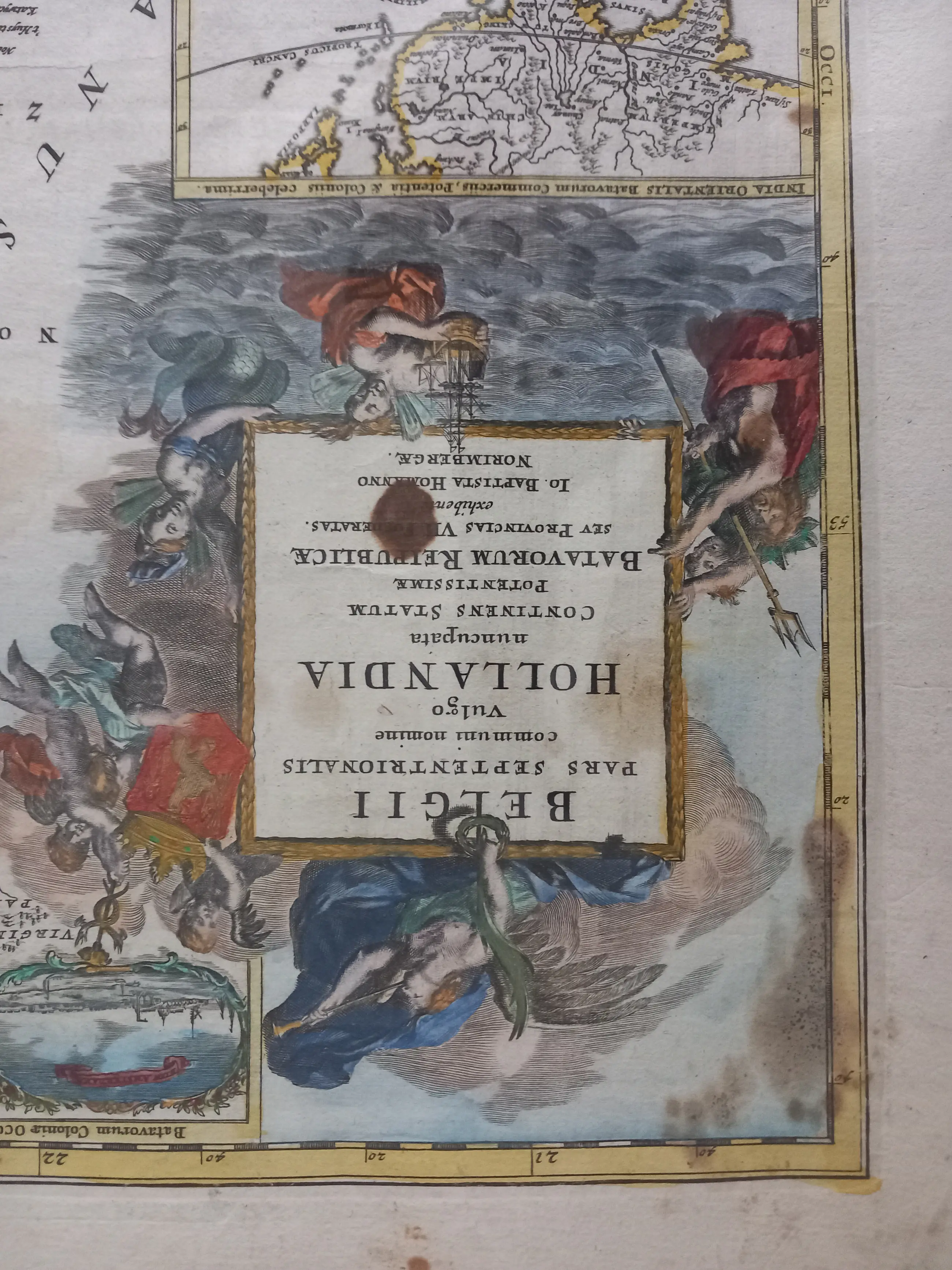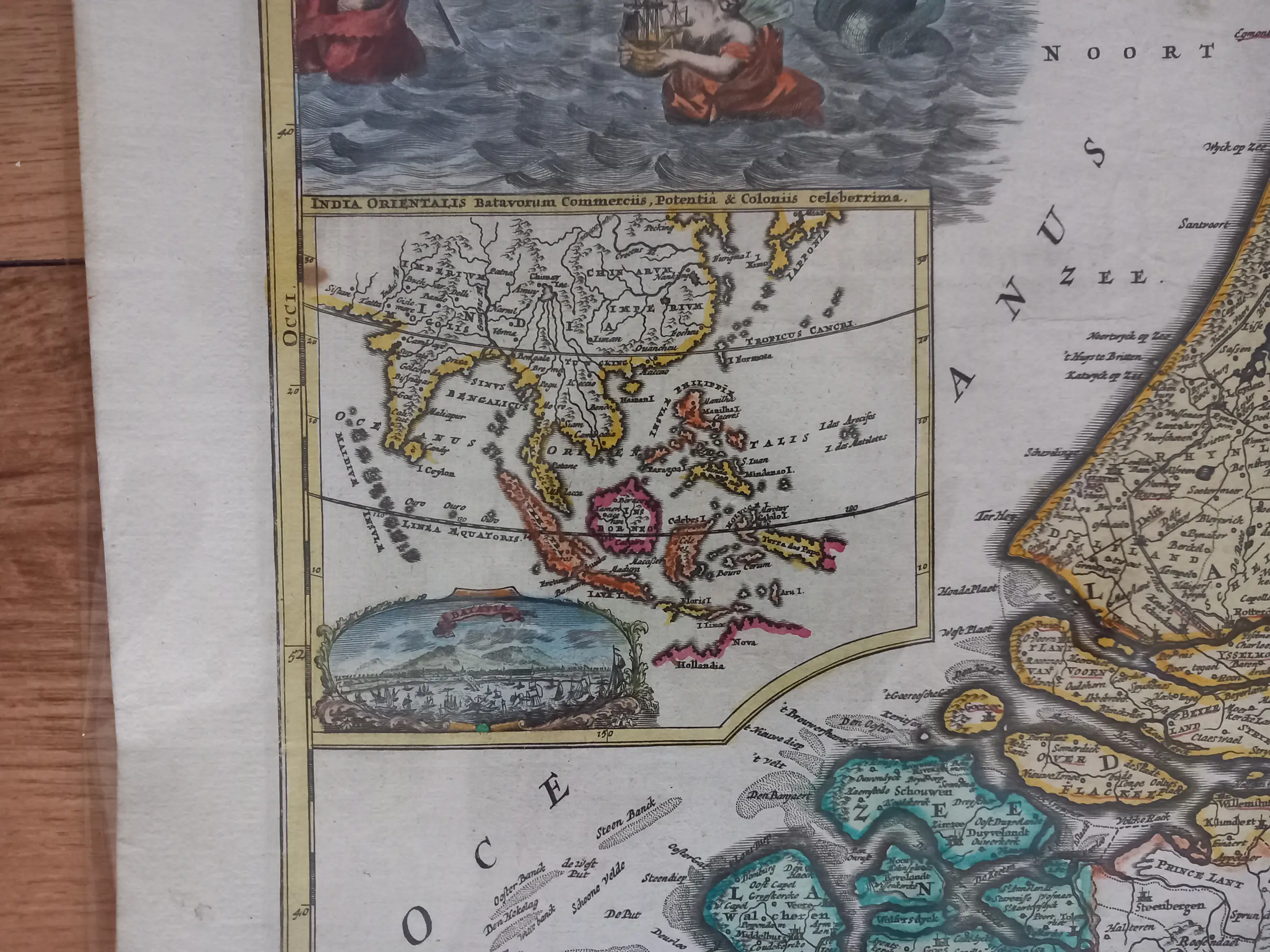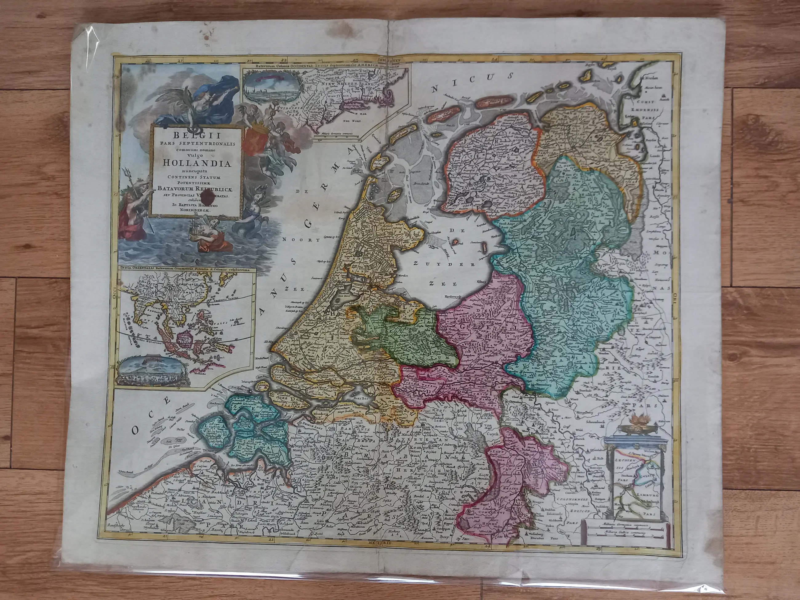 Folio formaat kopergravure van de Zeven Verenigde Nederlanden, met inzetkaartjes van Nieuw Nederland met zicht op Nieuw Amsterdam (New York) en van Zuidoost-Azie met zicht op Batavia (Jakarta). Dit is één van de eerste kaarten van de hand van Homann. Uitgegeven door J.B.Homann te Neurenberg in ca. 1705. Conditie: Goed. Bruine vlek in het titelcartouche en wat lichte vlekken in met name de marges. Heldere druk, stevig papier, frisse kleuring. Verso: blank. Handgekleurd in die tijd. Zeer fraai.