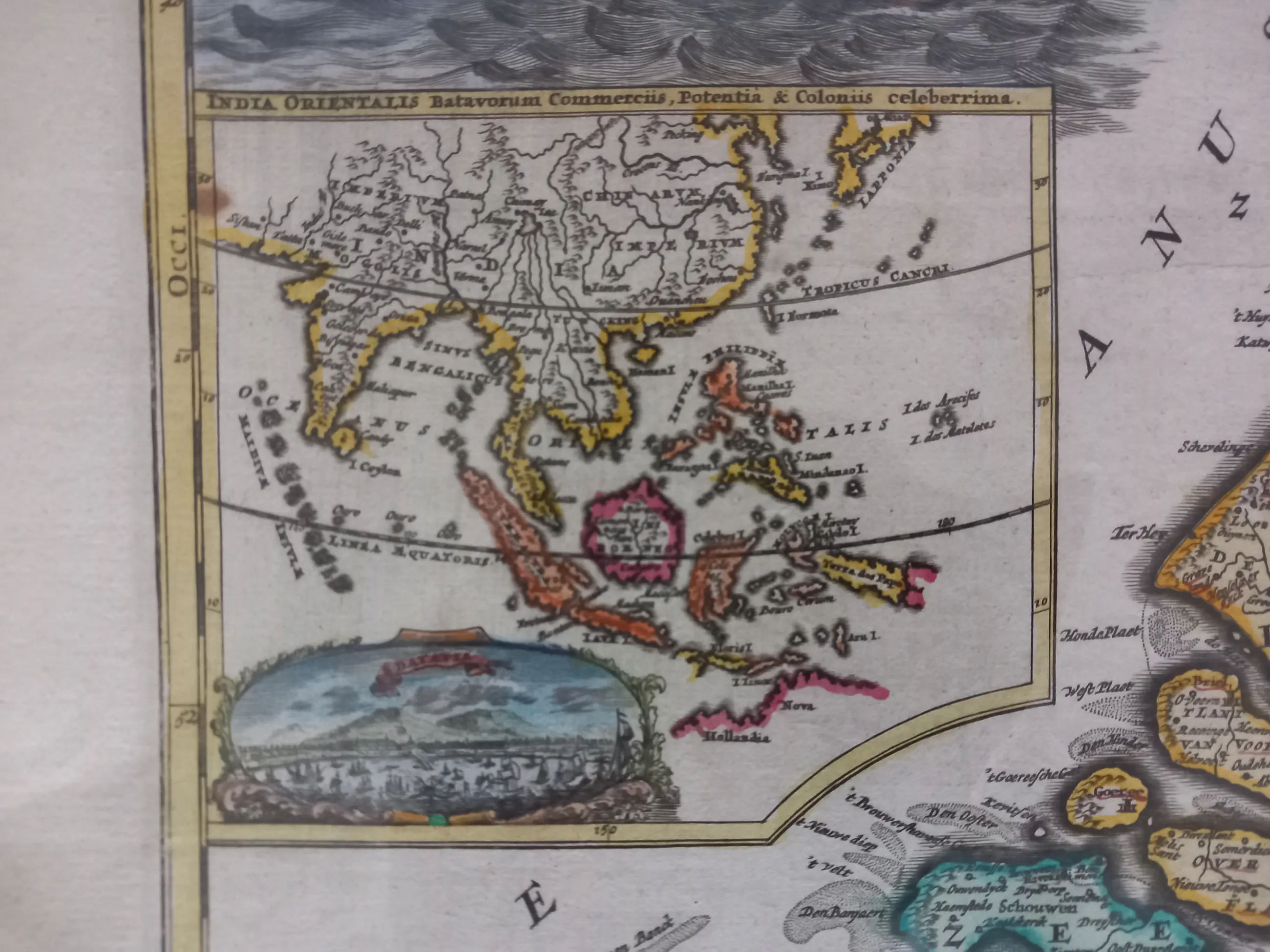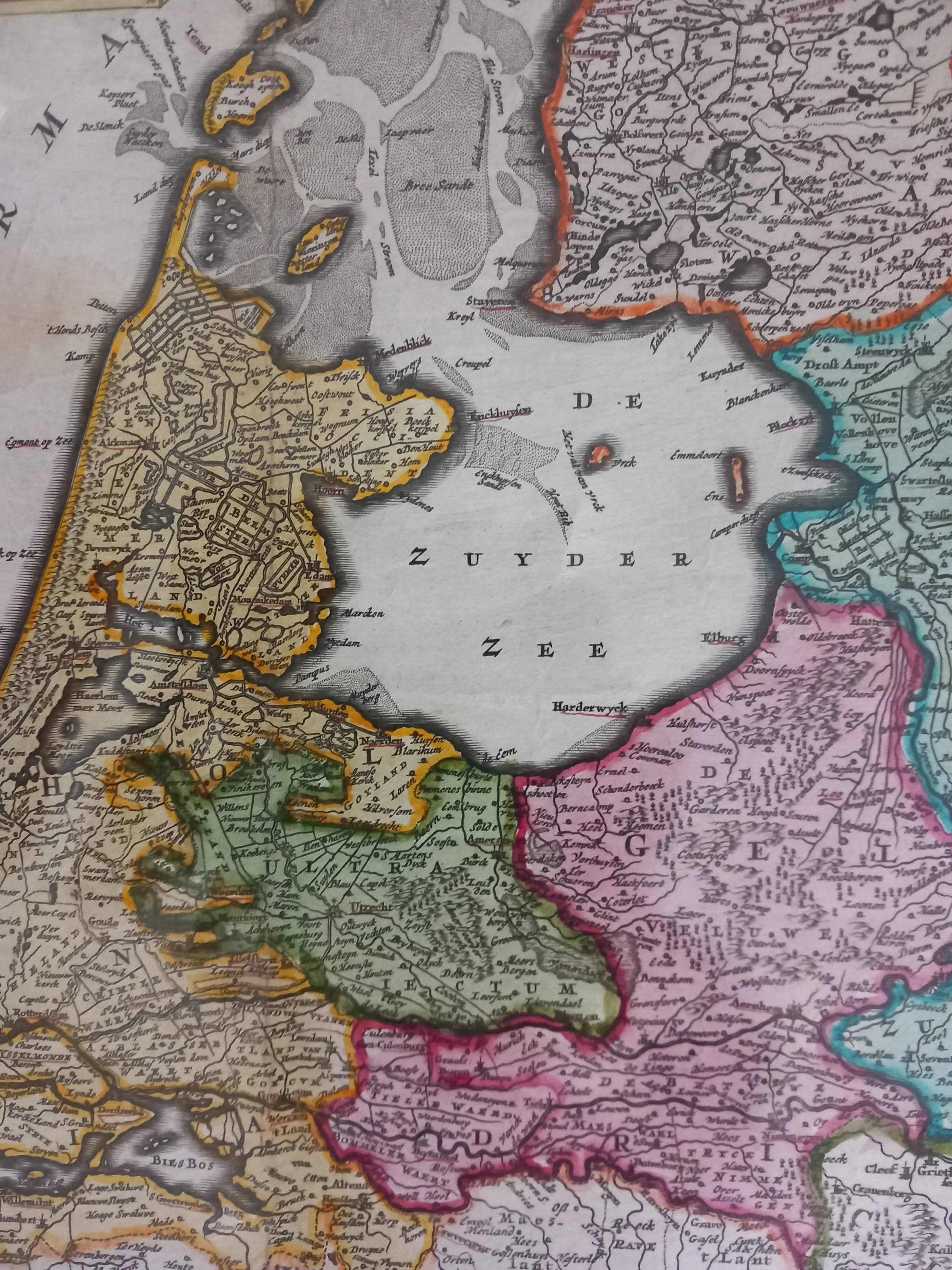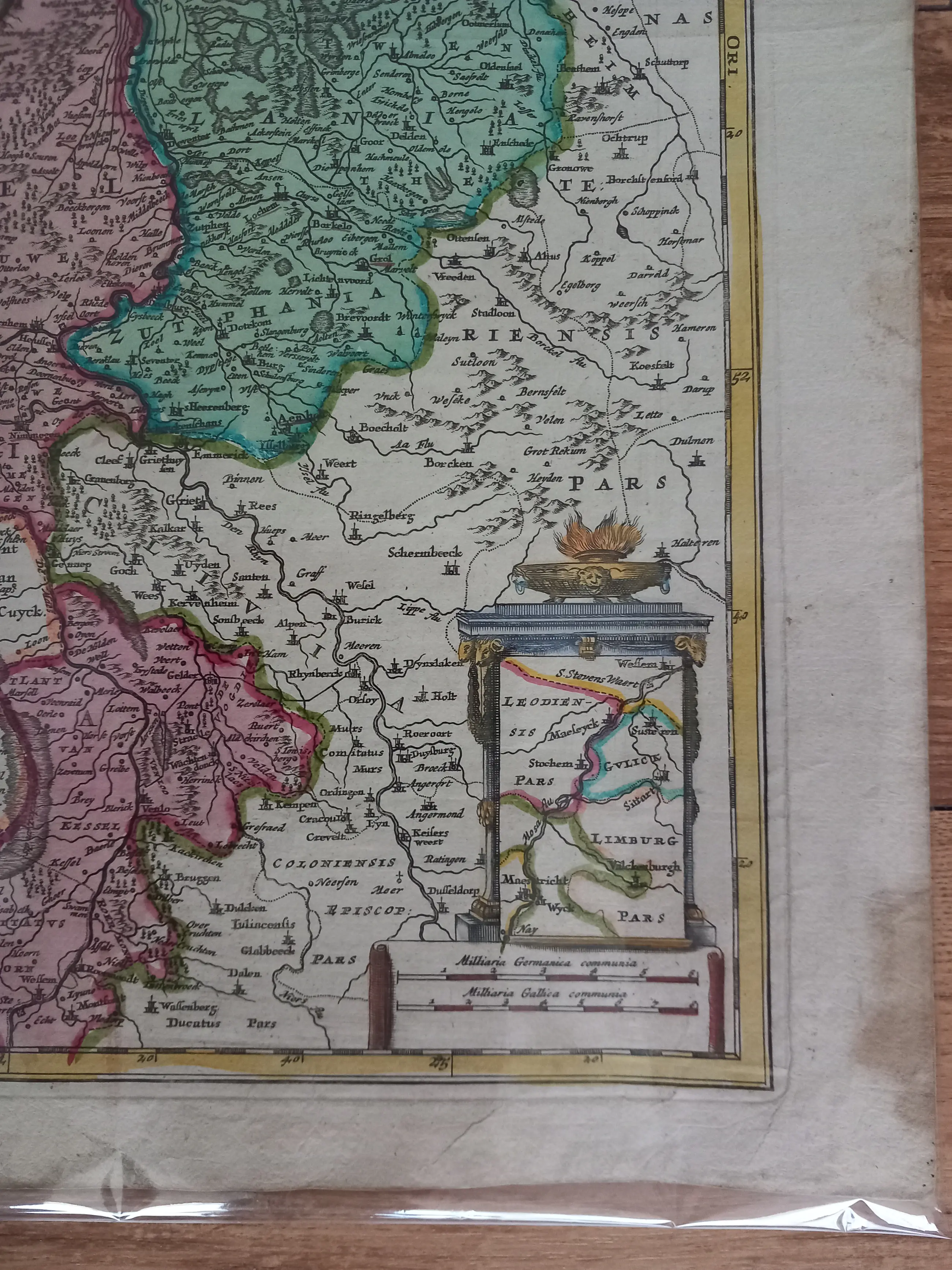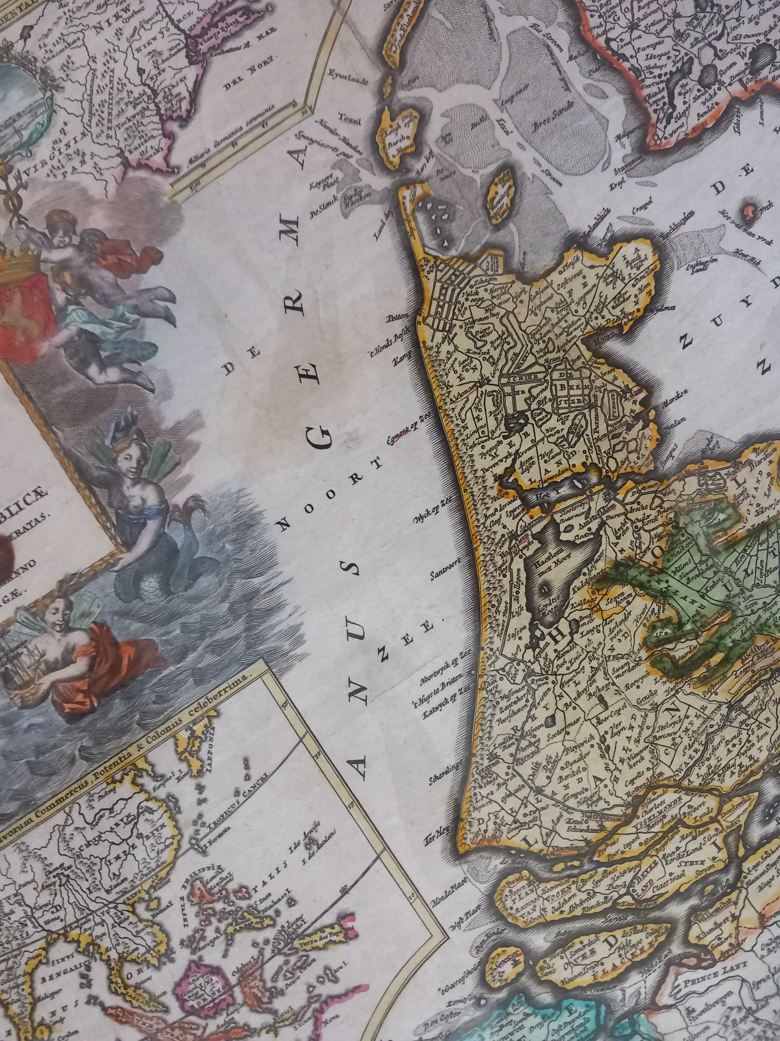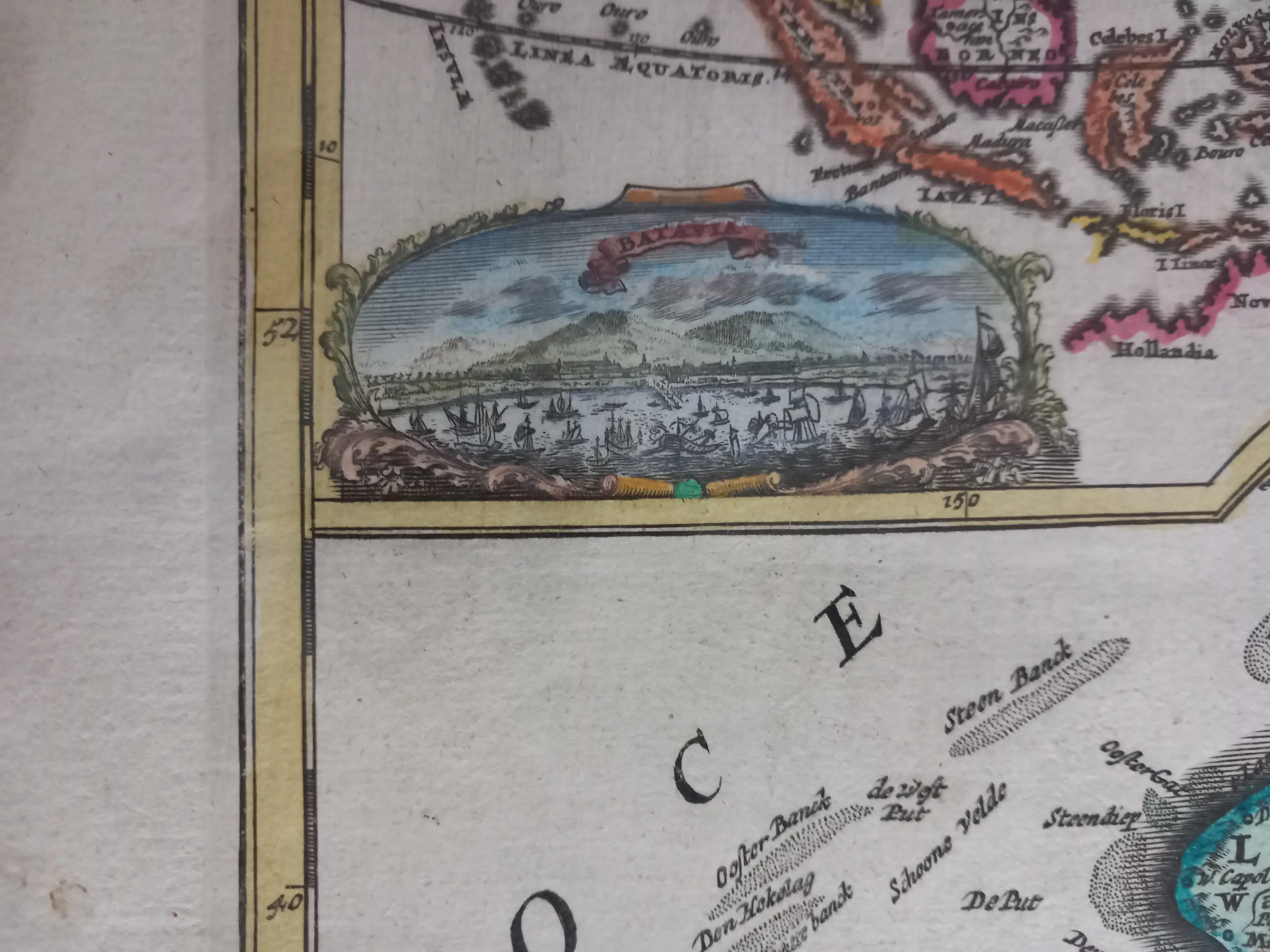 Folio formaat kopergravure van de Zeven Verenigde Nederlanden, met inzetkaartjes van Nieuw Nederland met zicht op Nieuw Amsterdam (New York) en van Zuidoost-Azie met zicht op Batavia (Jakarta). Dit is één van de eerste kaarten van de hand van Homann. Uitgegeven door J.B.Homann te Neurenberg in ca. 1705. Conditie: Goed. Bruine vlek in het titelcartouche en wat lichte vlekken in met name de marges. Heldere druk, stevig papier, frisse kleuring. Verso: blank. Handgekleurd in die tijd. Zeer fraai.