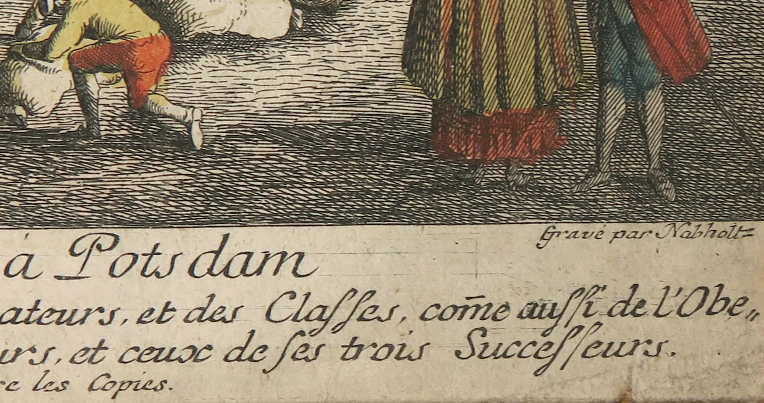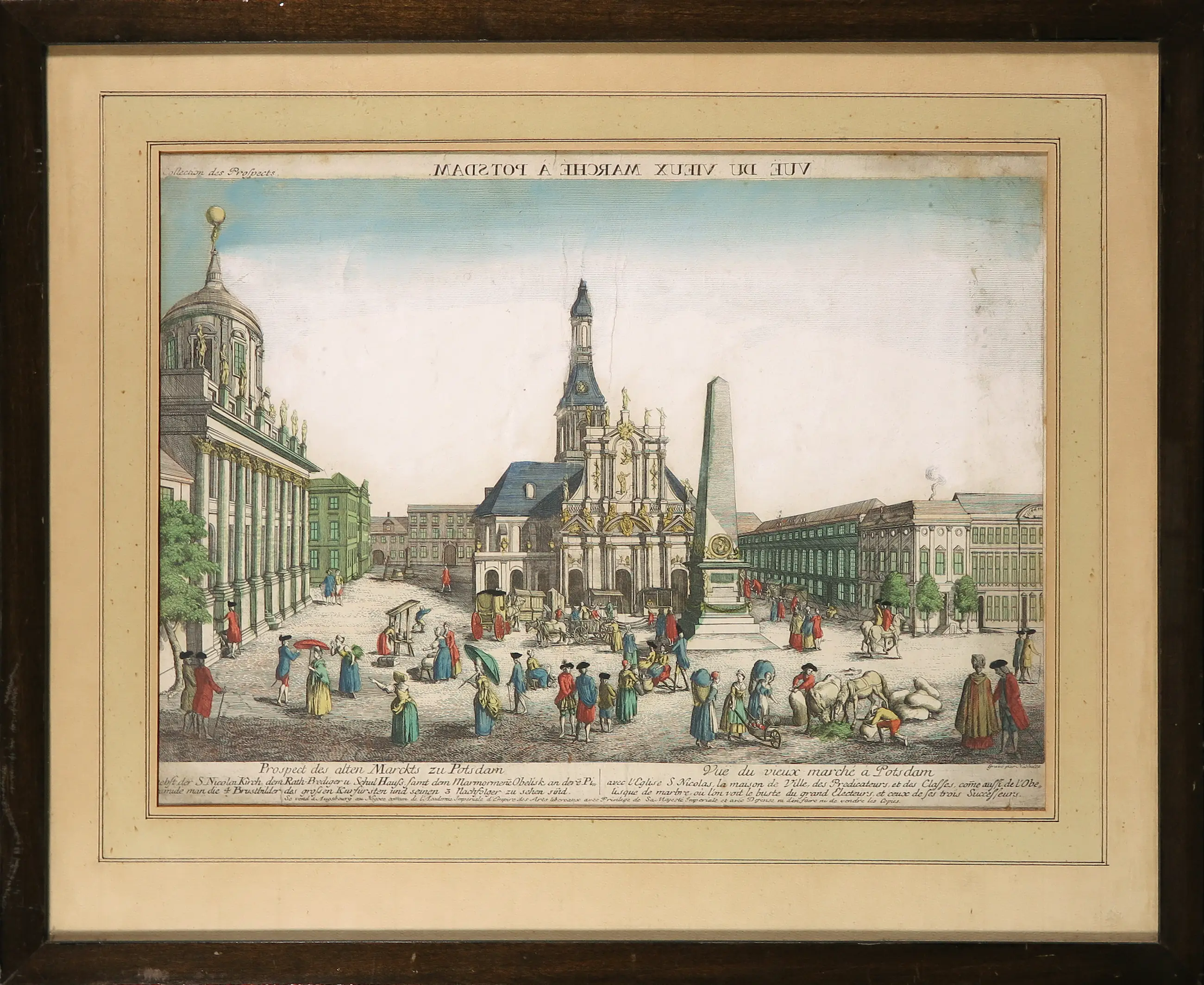 Handgekleurde kopergravure/opticaprent, met zicht op de oude markt te Potsdam. Vervaardigd ca. 1760.