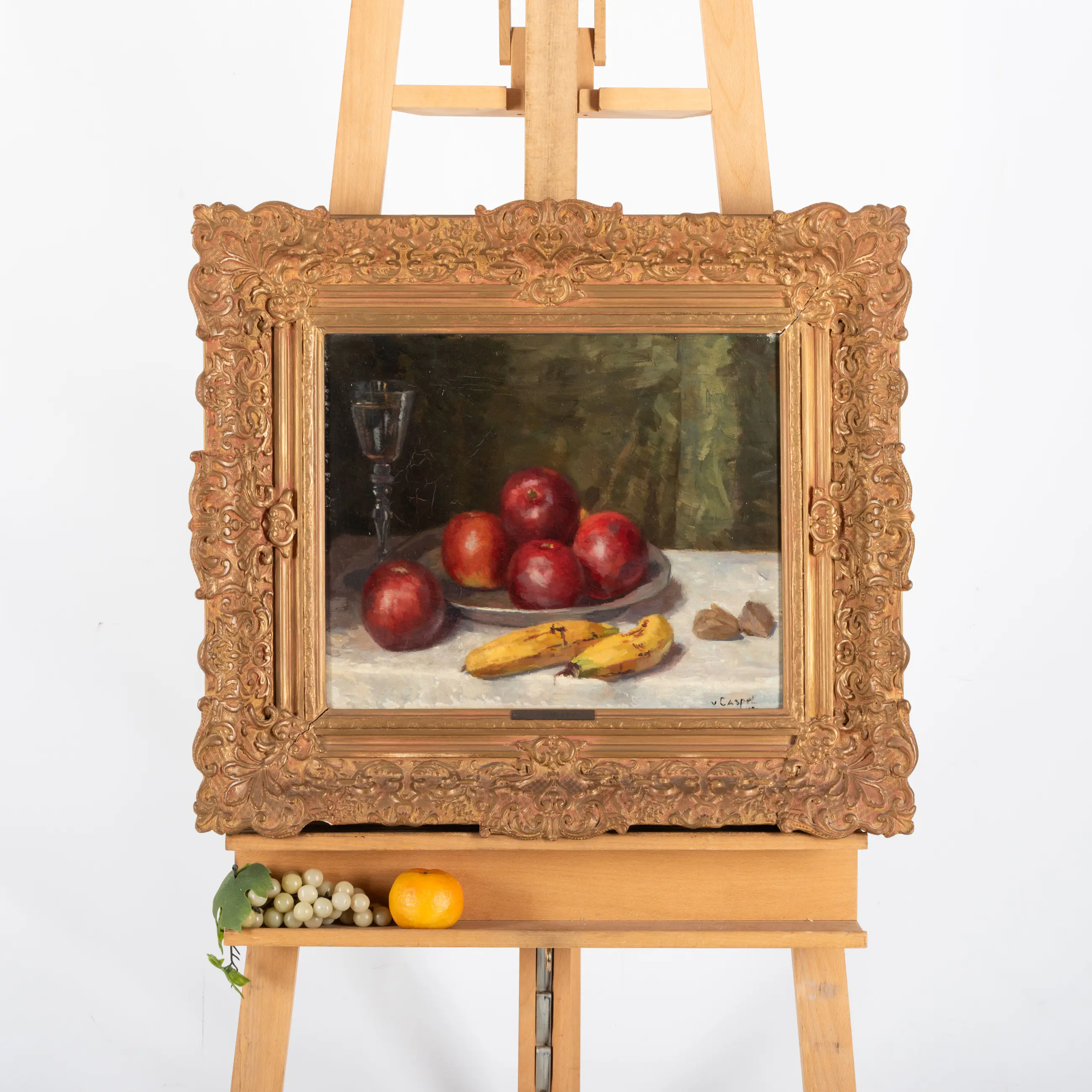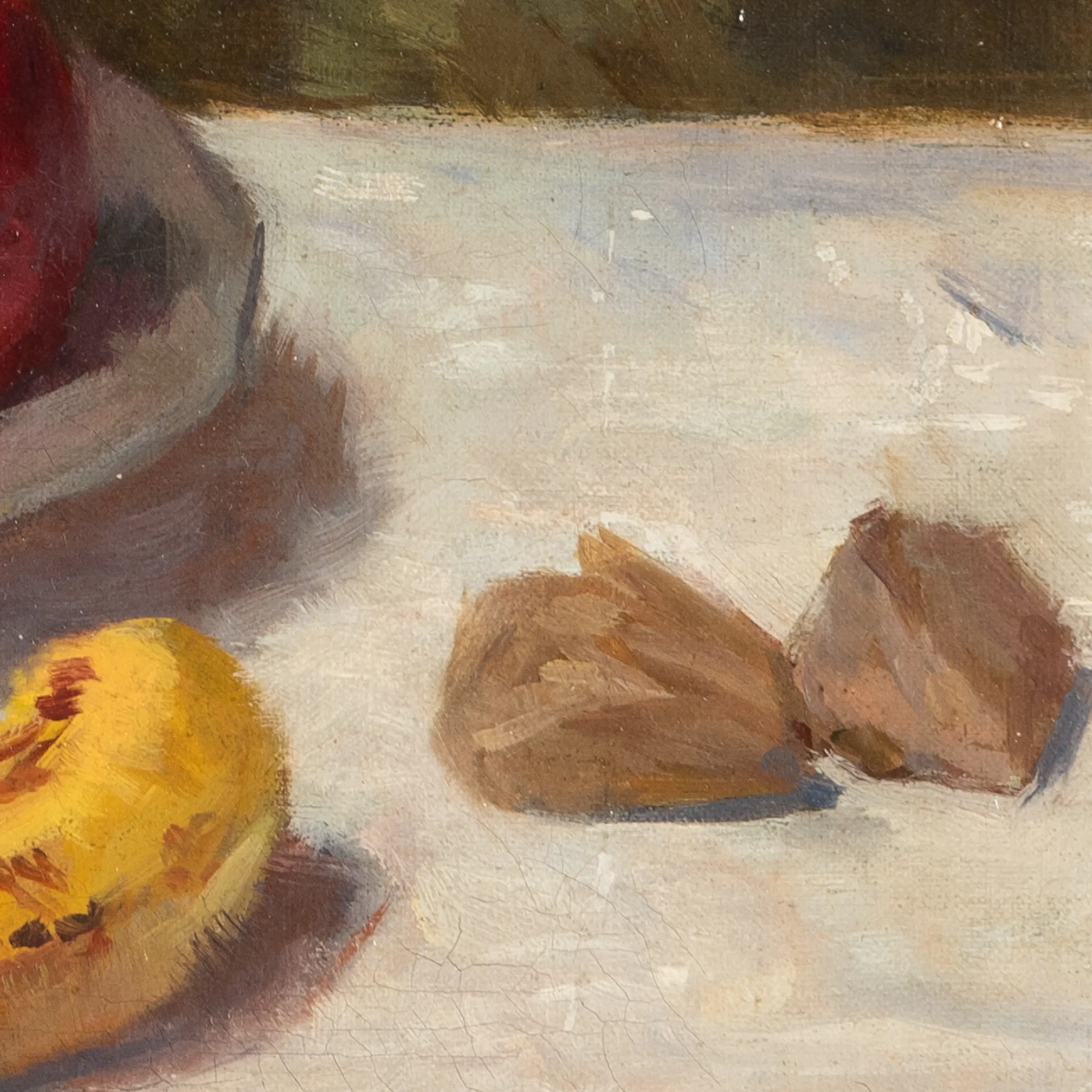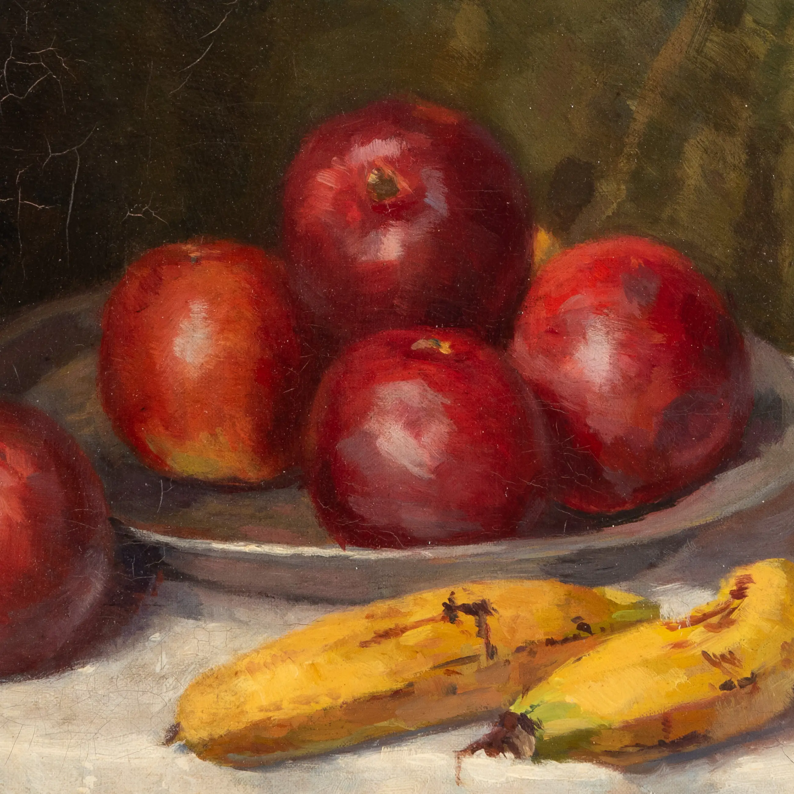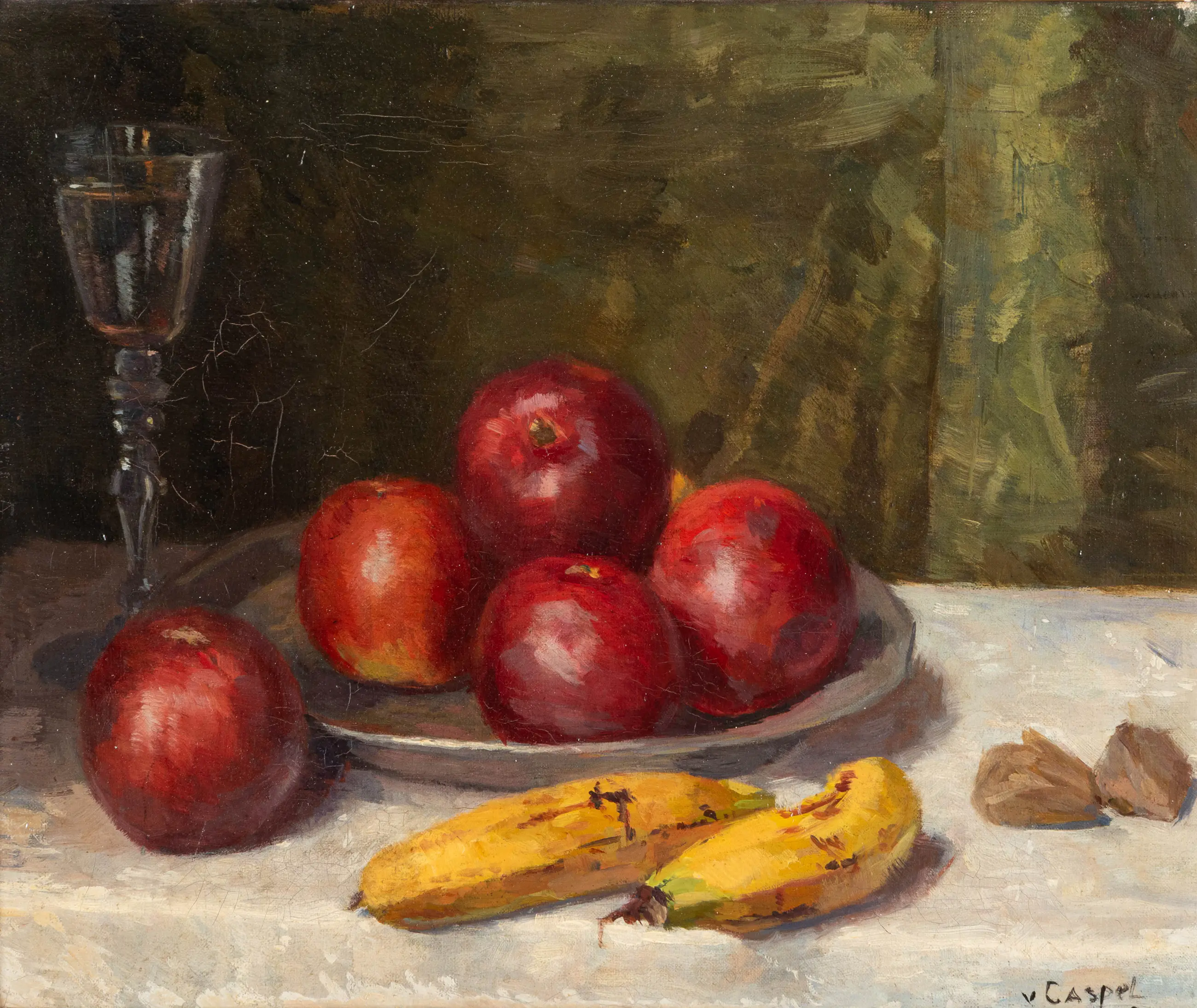 Dit werk toont een knap gecomponeerd stilleven. De appels, bananen en walnoten schitteren in hun primaire kleuren en ogen levensecht, terwijl ze tegelijkertijd met een impressionistische toets op het doek zijn gezet.