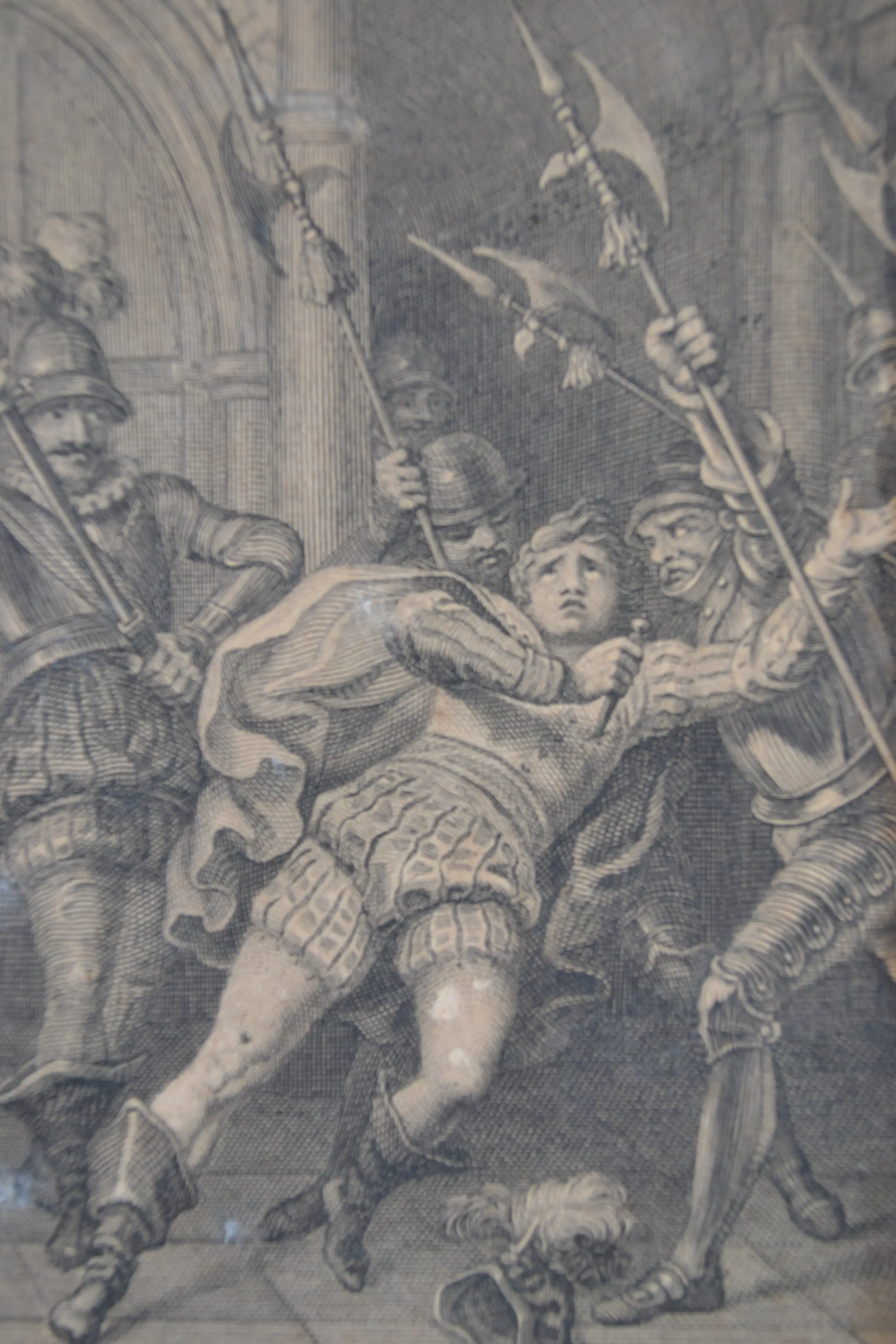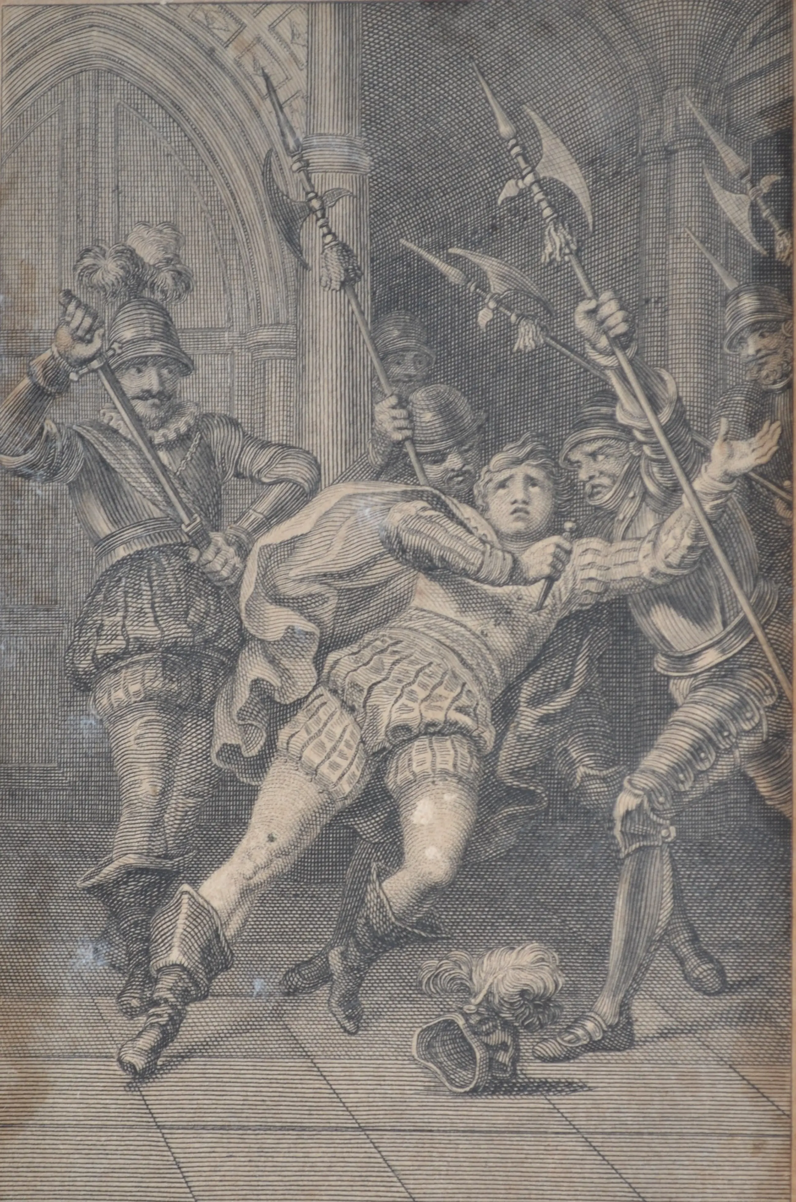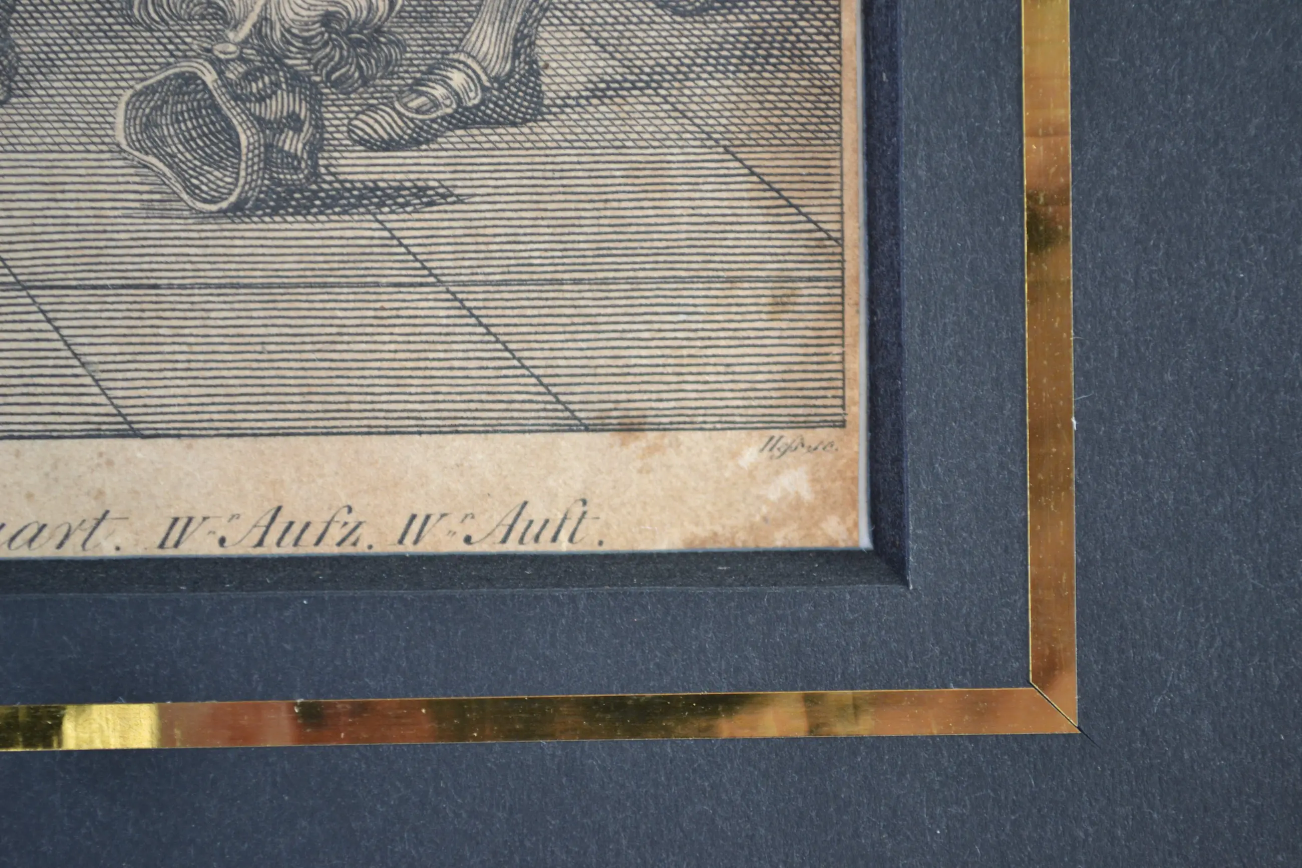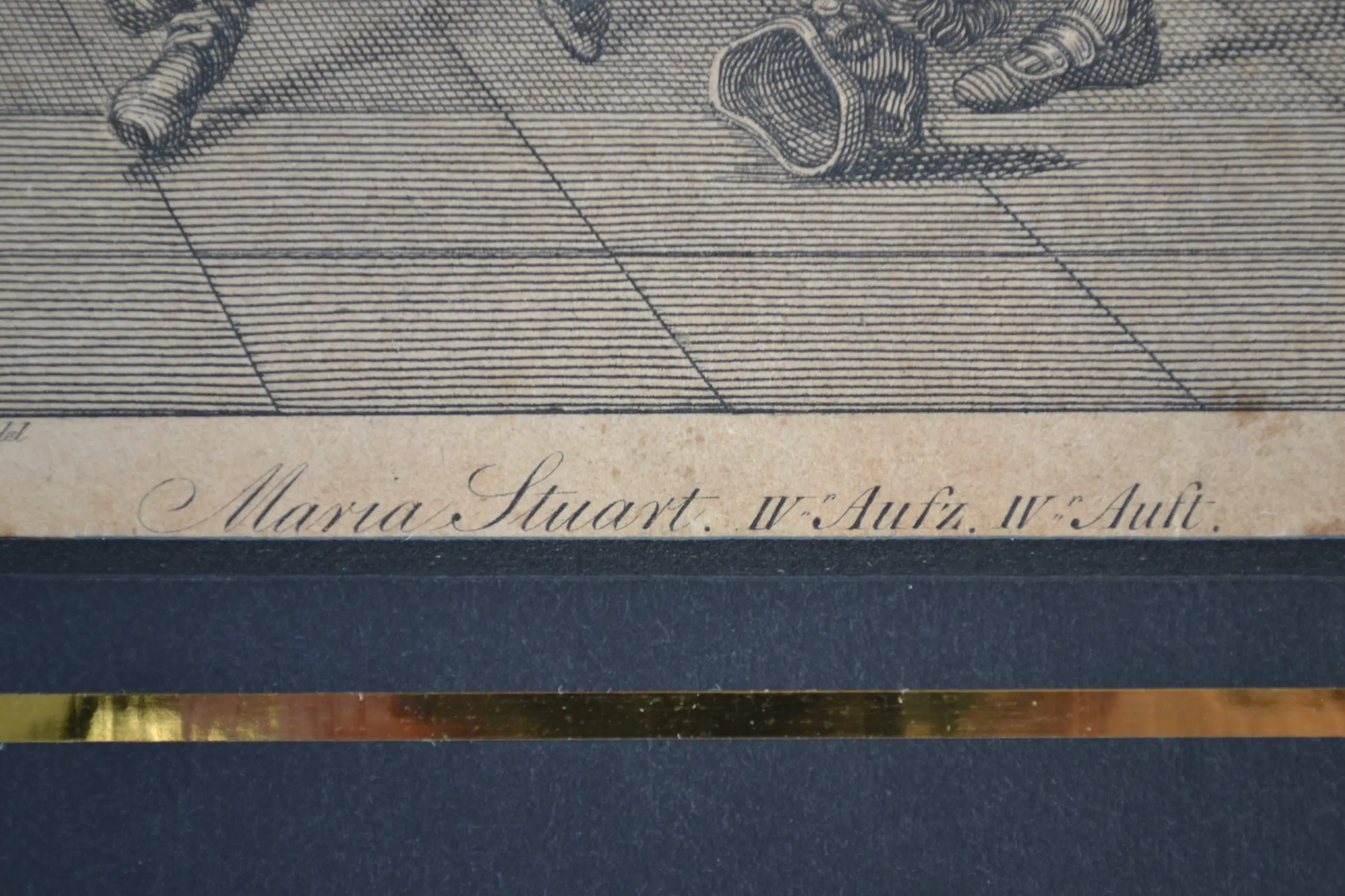 Gravure van Johann Heinrich Ramberg (1763-1840).- Linksonder staat Ramberg del- Middenonder Maria Stuart IV Aufz IV Auft- Rechtsonder helaas niet te lezen Eind 18de / begin 19de eeuw. Voorstelling betreft de zelfmoord van Mortimer in het stuk Maria Stuart van Friedlich Schiller (Maria Stuart – 4. Aufzug, 4. Auftritt). Het stuk werd voor het eerst opgevoerd in 1800 in het Hoftheater van Weimarer. Is ietwat verkleurd maar in prima conditie. Voorzien van nette zwart pass-partout. Afmeting gravure: 8x13cmAfmeting totaal: 20x27cm Wordt goed verpakt en aangetekend verstuurd.
