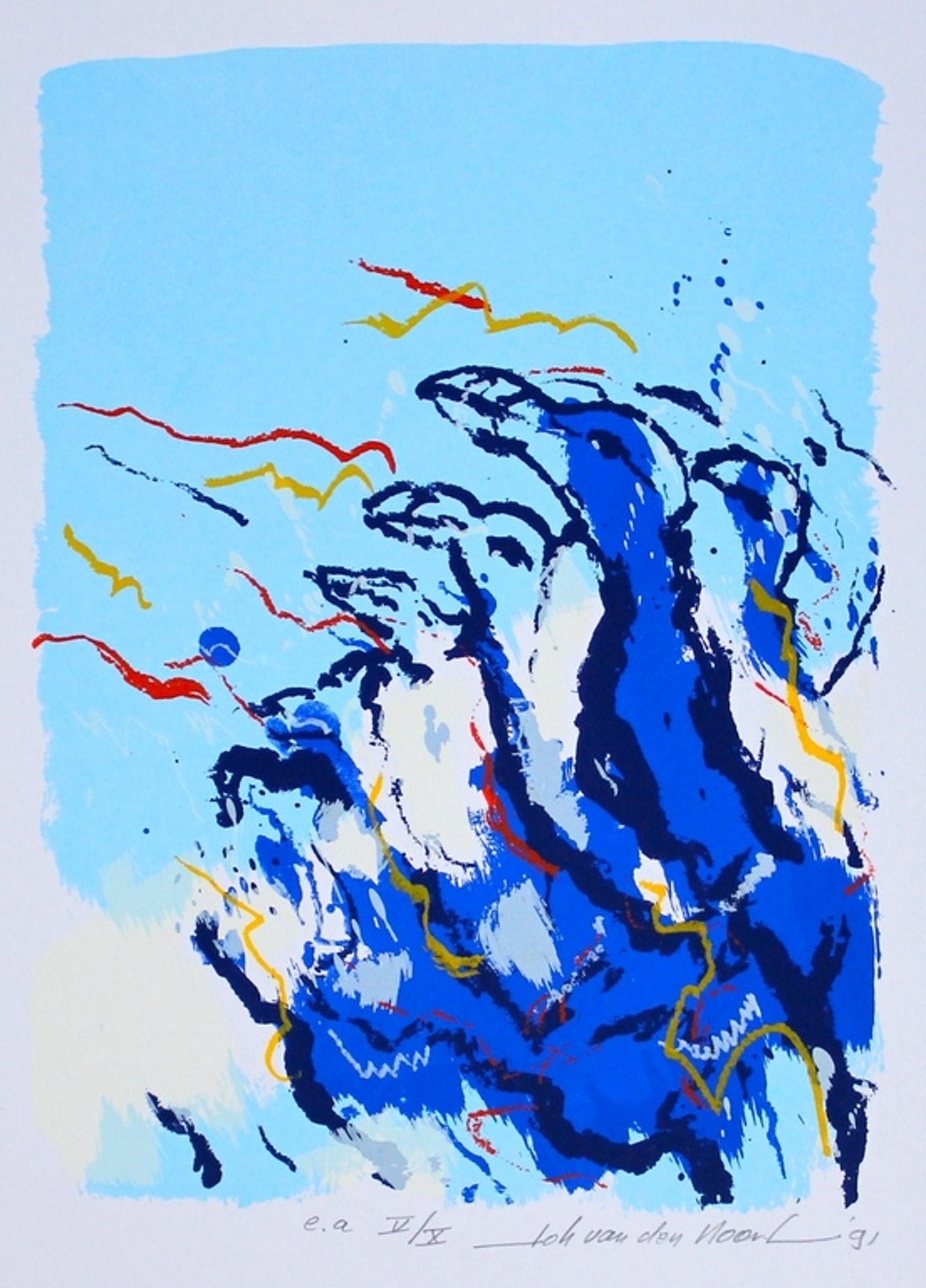 JOHANN VAN DEN NOORT originele zeefdruk. Eigen druk in 8 kleuren drukgang in een beperkte oplage van 125 stuks. Gedrukt op 200 gr. eerste kwaliteit houtvrij papier. Hand gesigneerd en genummerd door kunstenaar. Beeldformaat 28 x 20 cm.