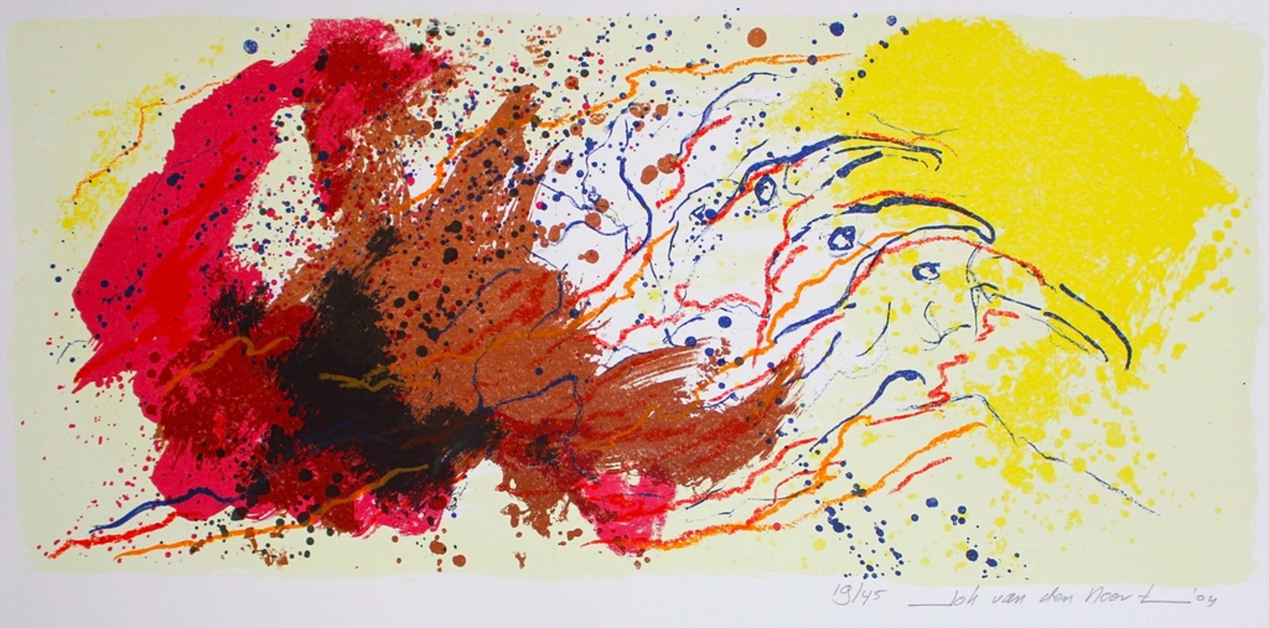 JOHANN VAN DEN NOORT originele zeefdruk. Eigen druk in 6 kleuren drukgang in een beperkte oplage van 45 stuks. Gedrukt op 200 gr. eerste kwaliteit houtvrij papier. Hand gesigneerd en genummerd door kunstenaar. Beeldformaat 25 x 58 cm. Het werk is niet ingelijst en in nieuw staat.