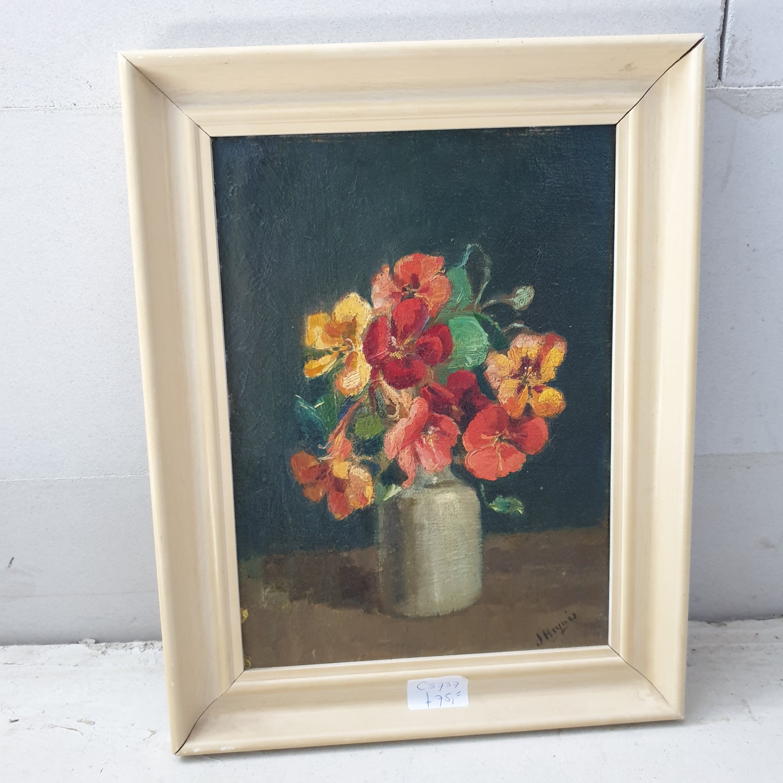 Doek bevat oppervlaktevuil en verkleurde vernis door de tijd, verfverlies linksonder, craquelures, randschade door lijst. | |