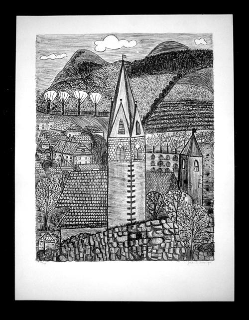 Johanna Ruisinger - Stadtlandschaft (Bayern). Naive Kunst. Lithographie, um 1970.