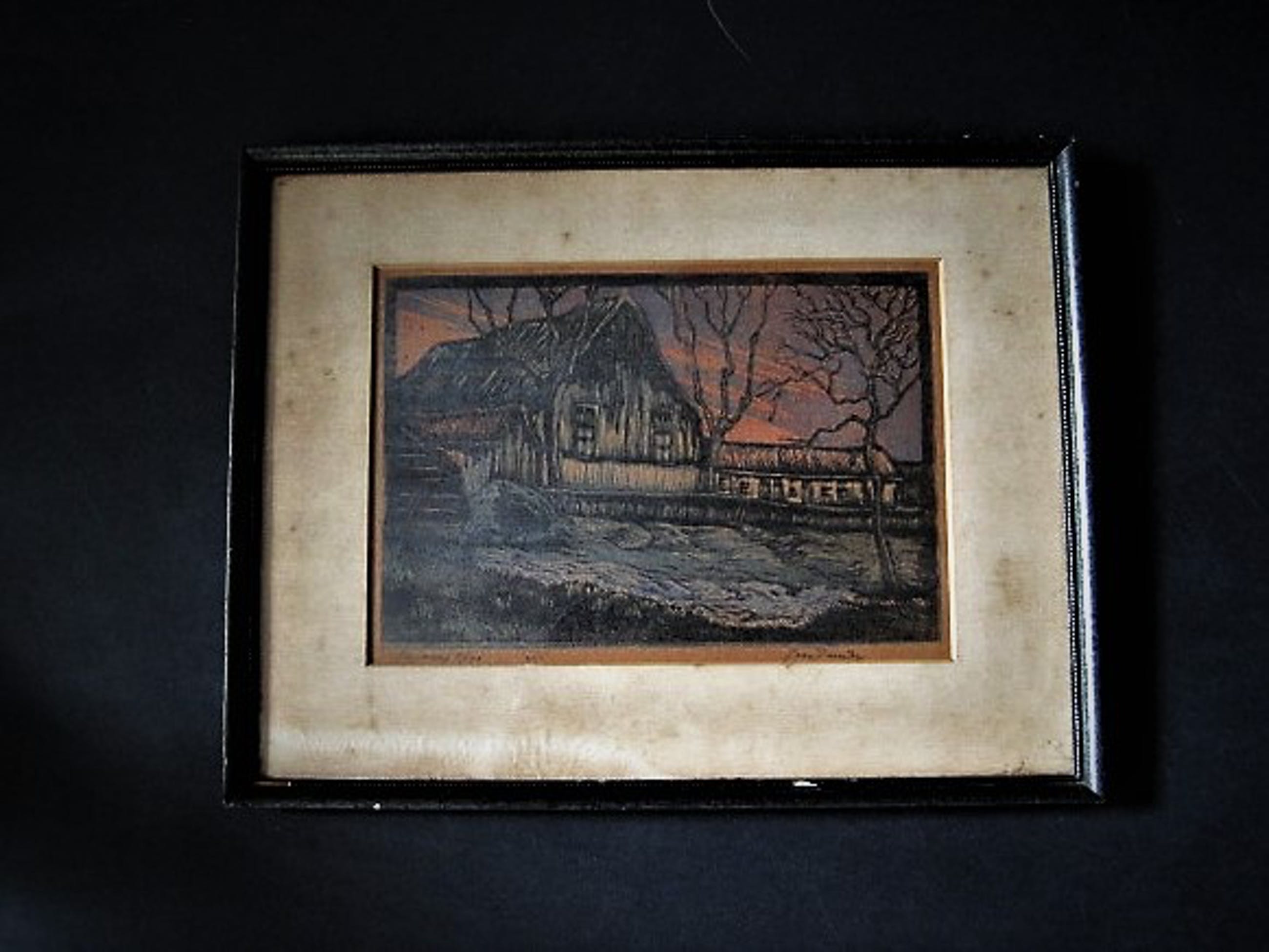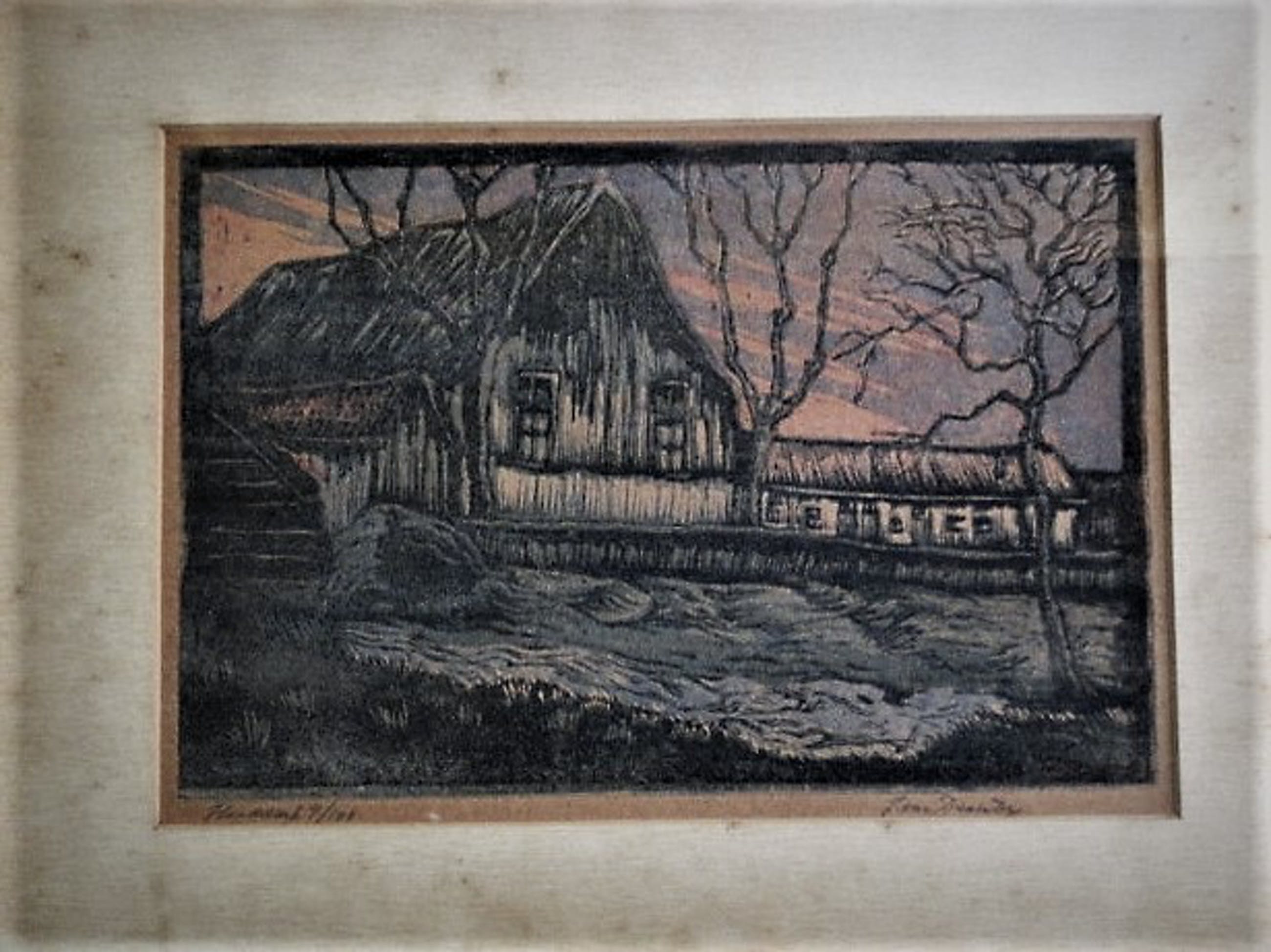 Gezicht op boerderij bij avondschemer, Houtsnede op papier 19,2 x 27,1 cm, gesigneerd r.o.