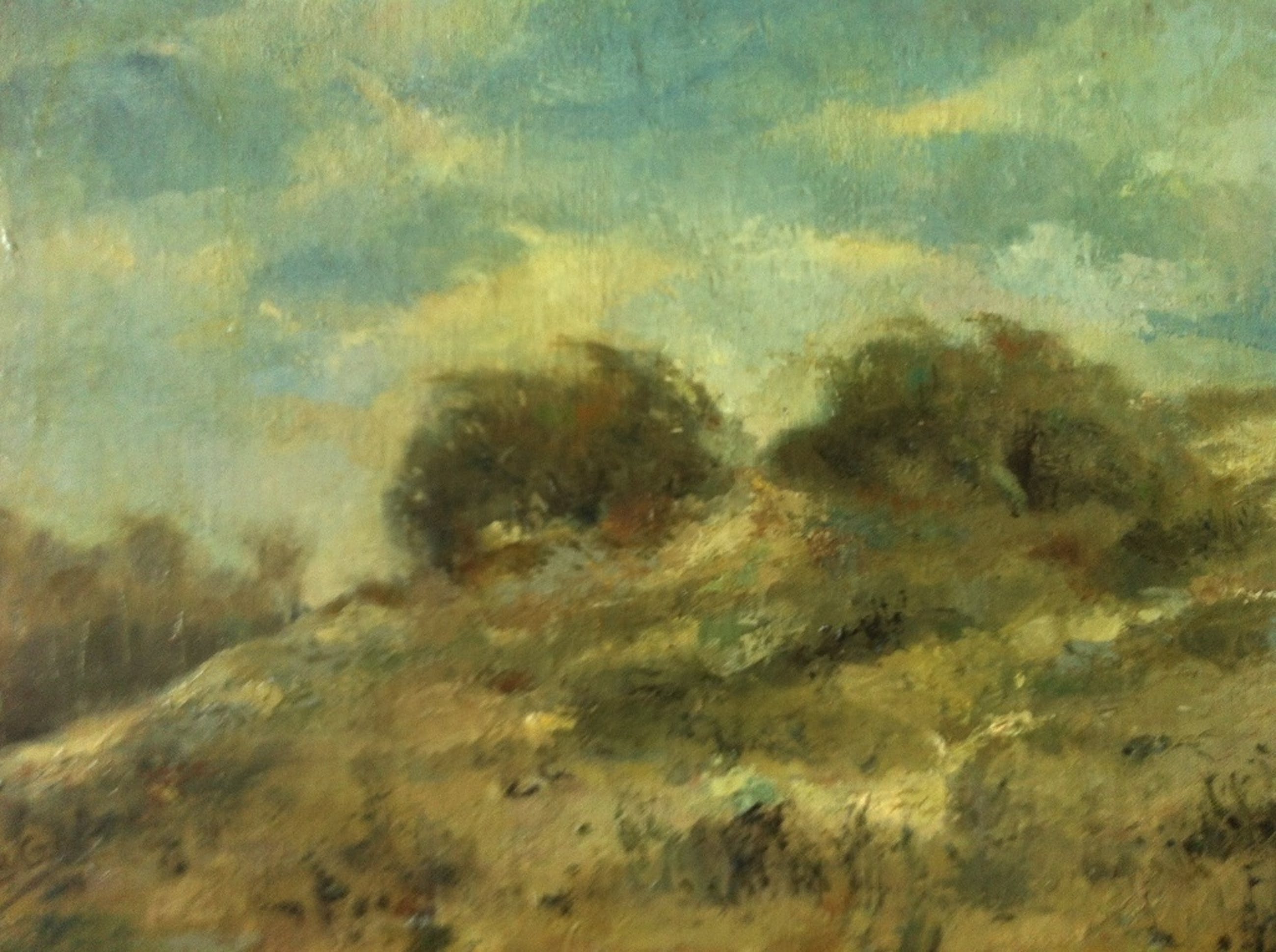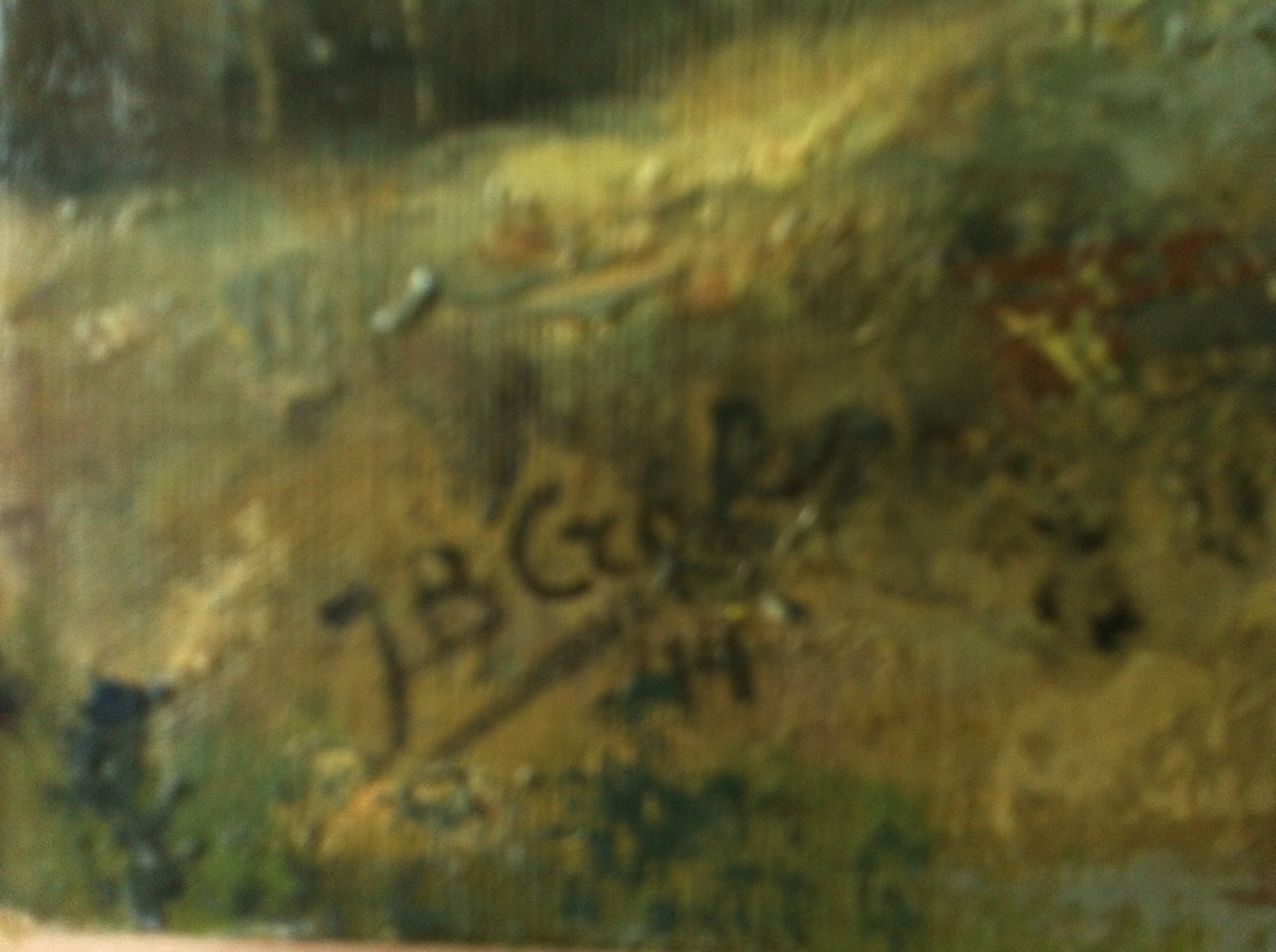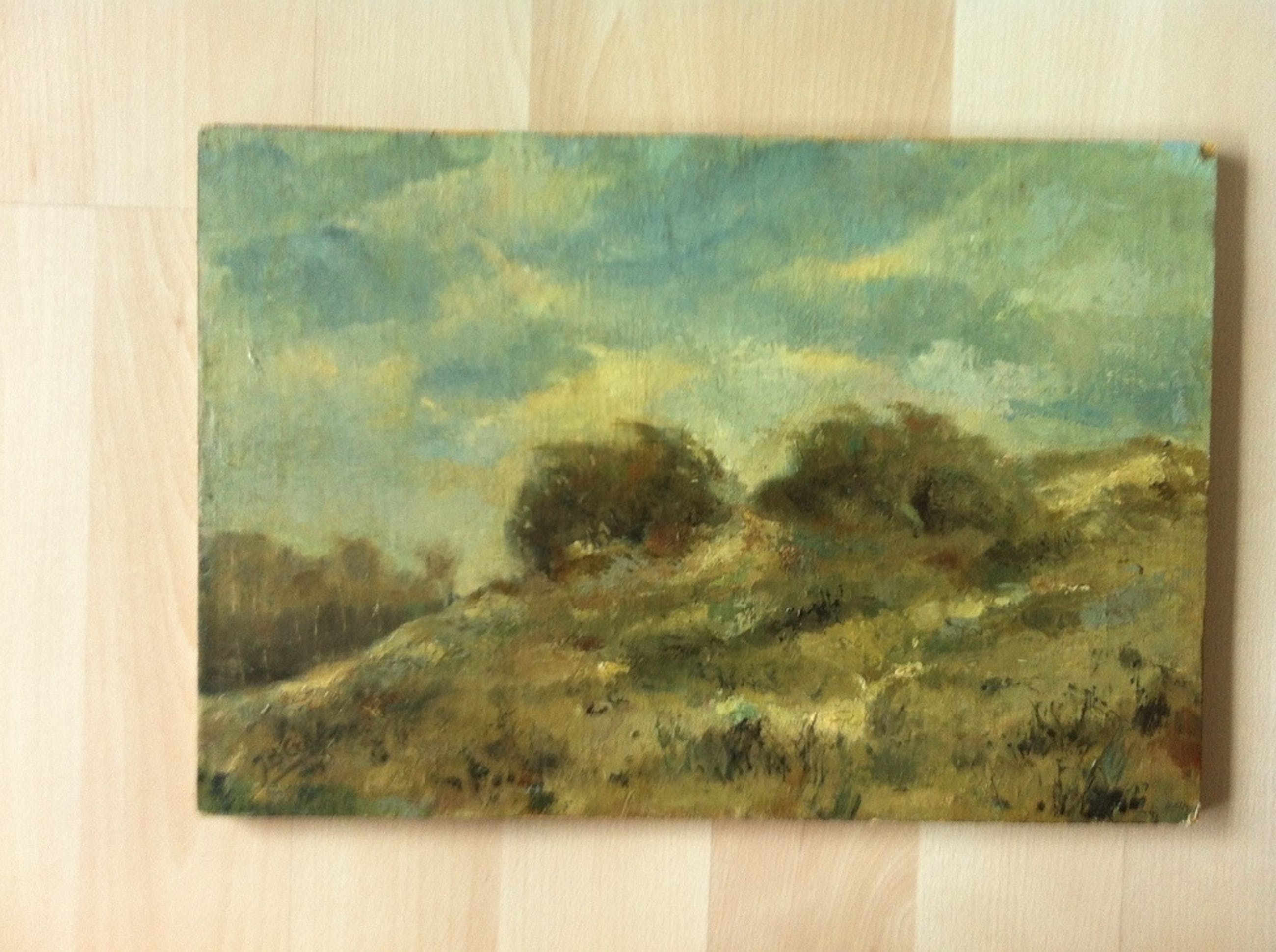 Marouflé: olieverf op doek op board. Zoals op de 2e foto te zien is, zijn de hoekjes wat afgesleten; dit valt bij nette lijsting weg.