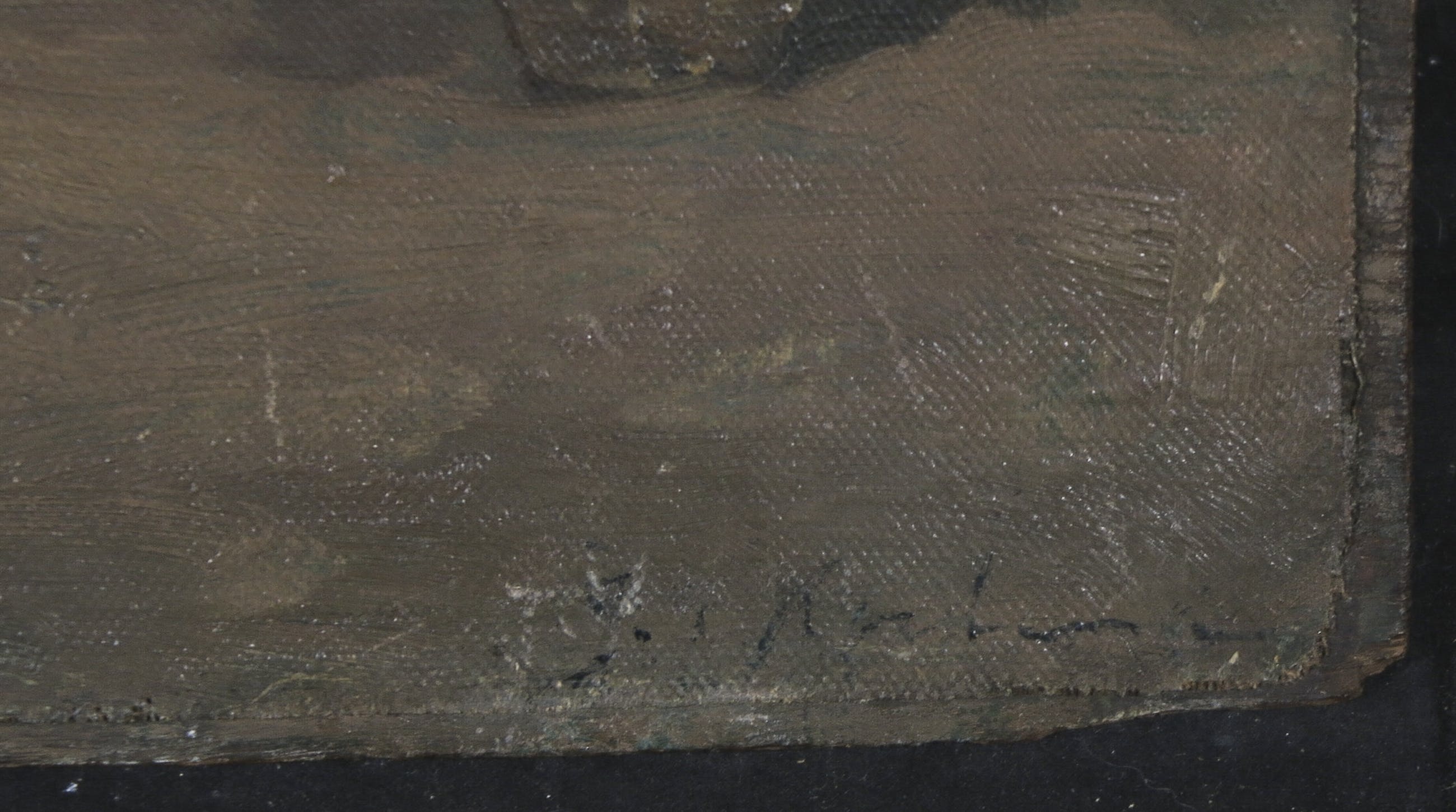 | Wat krasjes en beschadigingen van het doek en de verflaag. Deformatie in het midden van het paneel (opbollende stukjes canvas). Het werk is vervaardigd op doek en verlijmd op paneel. Zie ook foto's. | |||||