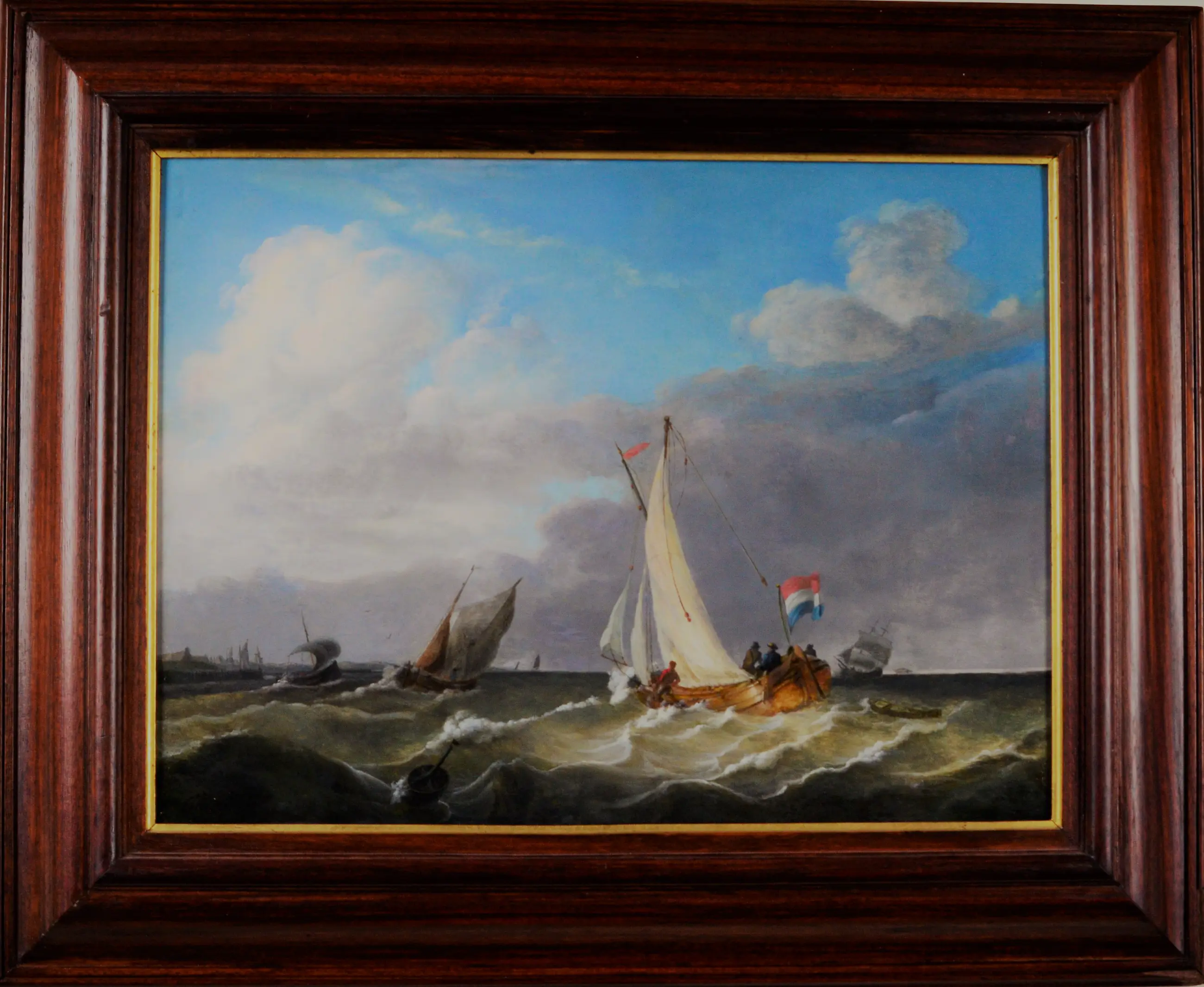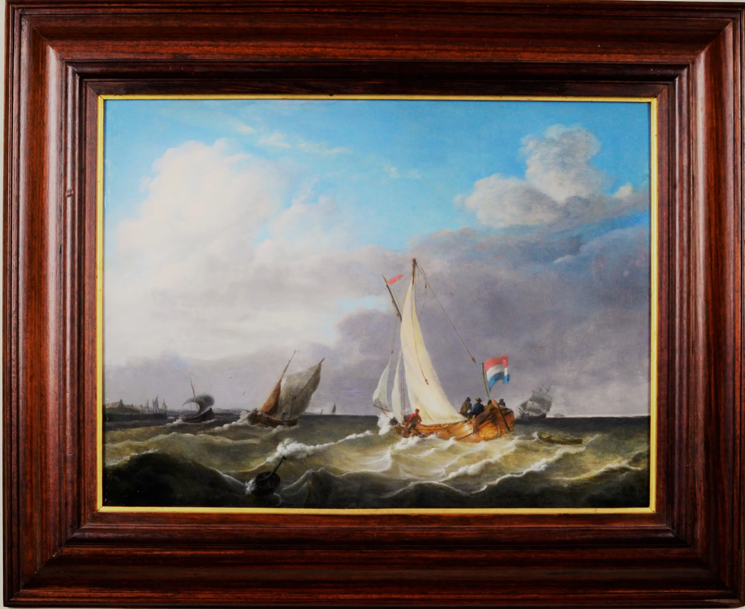 Fraai werk van de bekende Nederlandse zeeschilder Johannes Christiaan Schotel, geboren in Dordrecht. Zijn specialiteit is het uitbeelden van schepen met tuigage en mensen aan boord tegen een vaak dreigende achtergrond van lucht en water. Schotel was waarschijnlijk de belangrijkste zeeschilder van de negentiende eeuw. Zijn werk is een voortzetting van de traditie van Nederlandse zeventiende-eeuwse zeeschilders als Willem van de Velde de Oude en Ludolf Backhuizen. Wellicht gaat het hier een vroeg werk van Schotel. Verzending is mogelijk na overleg.