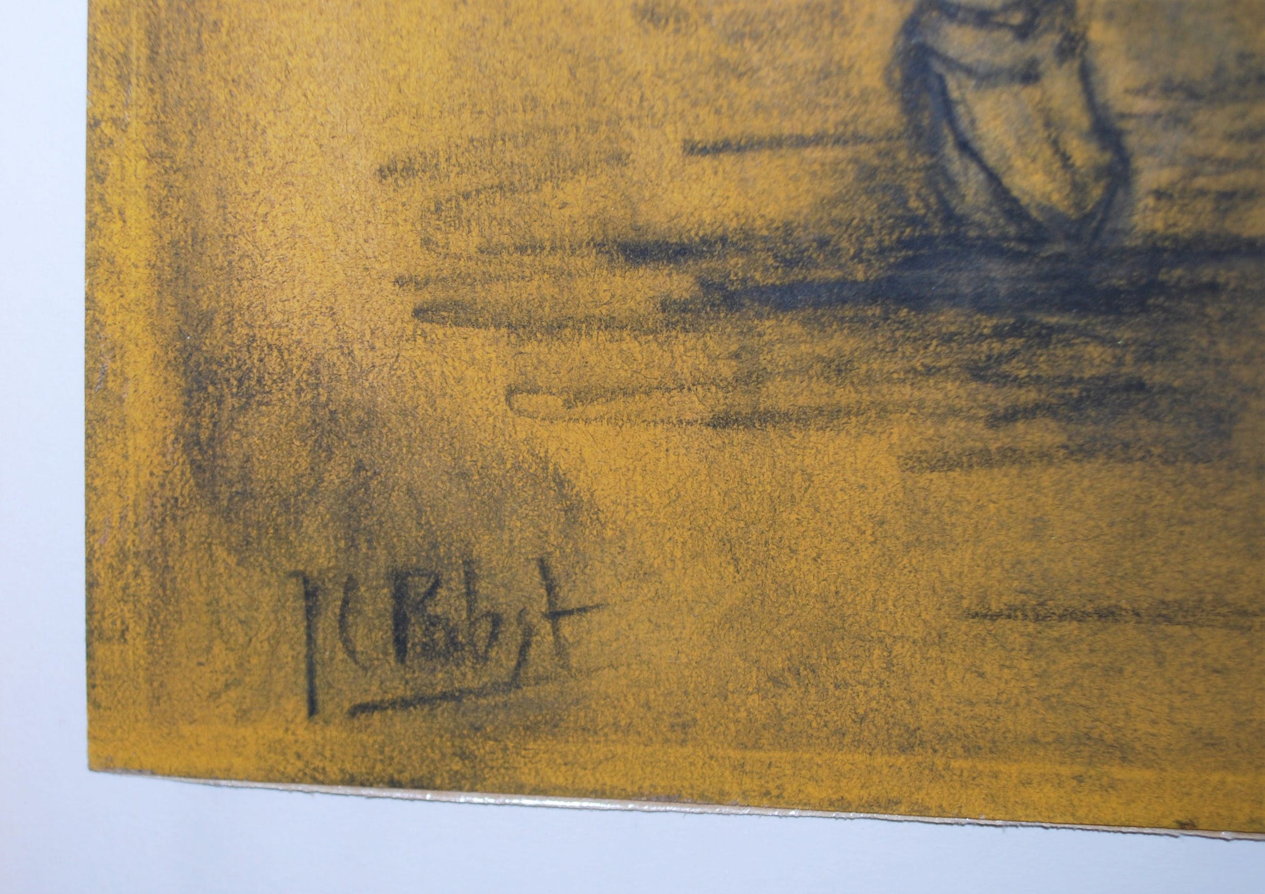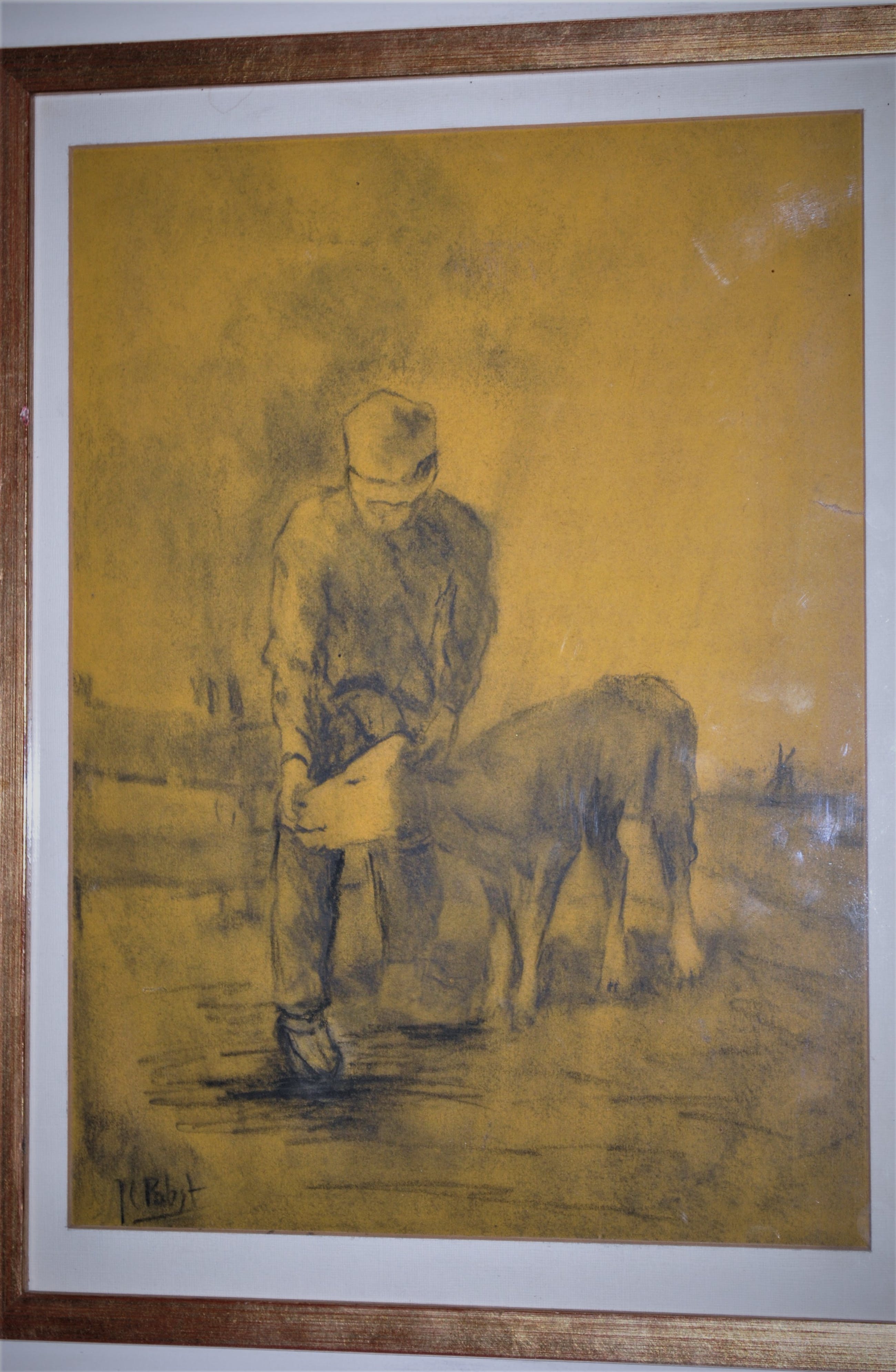 Bladmaat ca 37x28 cm. Met potlood gesigneerd linksonder. Achter passepartout en glas. In een fraaie, gave houten Heijdenrijk lijst, met lichte schade.
