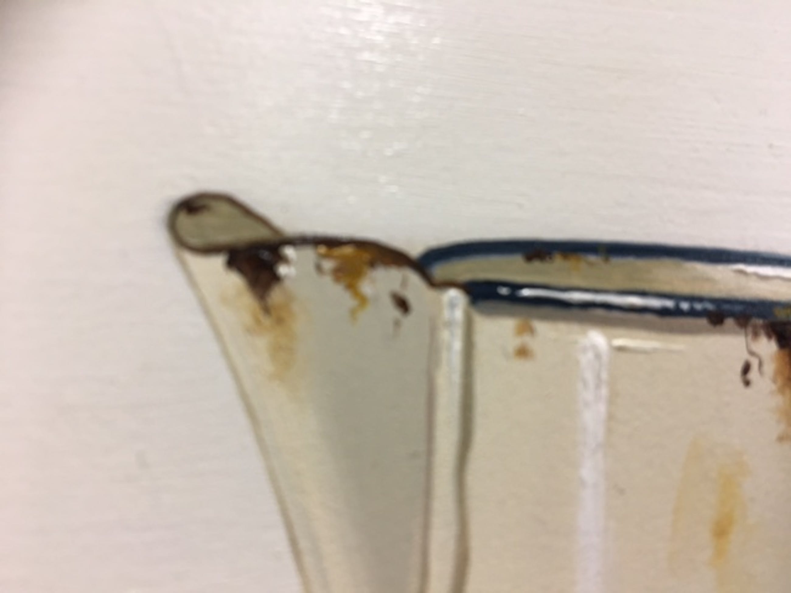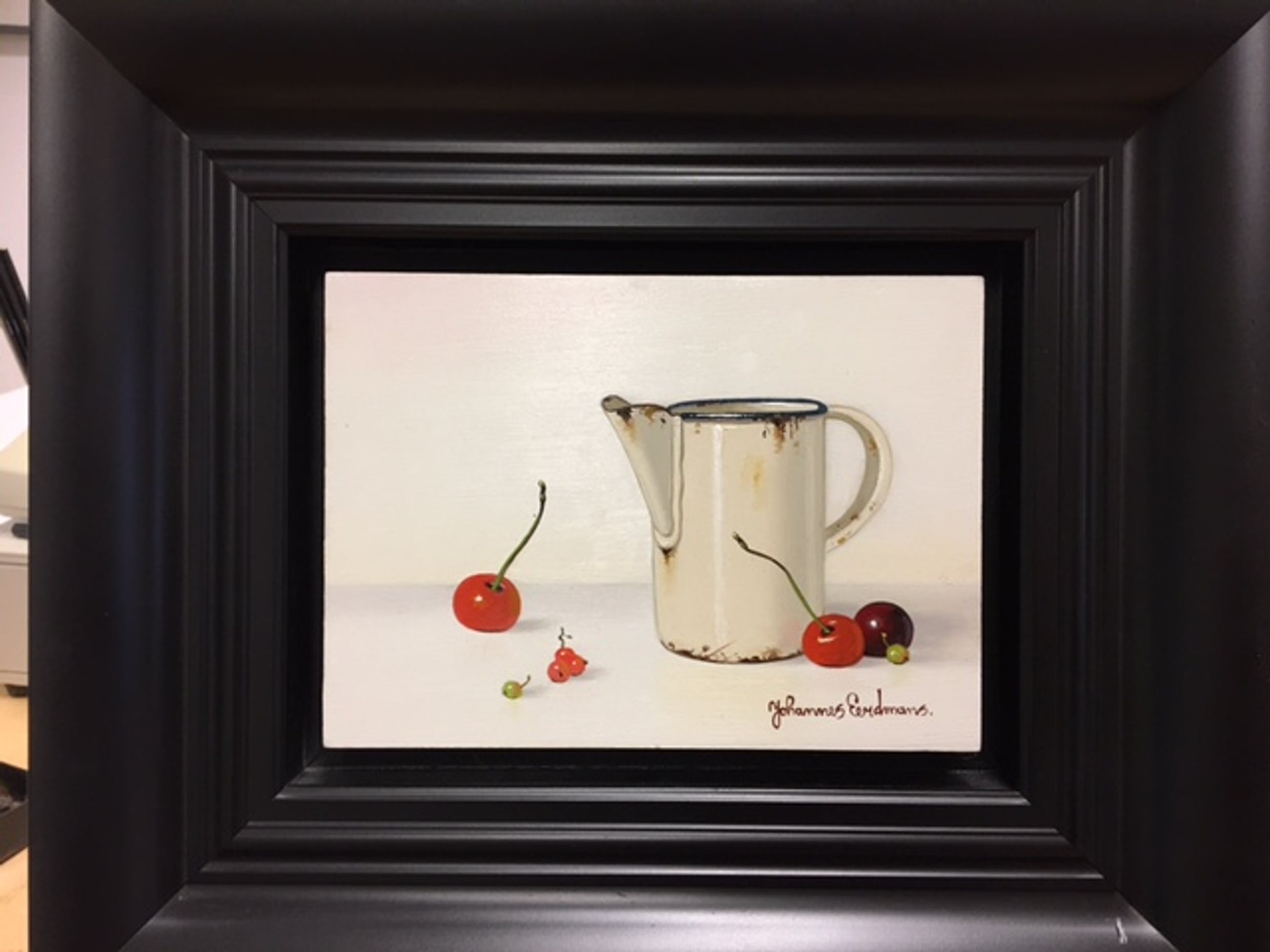 Dit paneeltje vertoont een prachtig gedetailleerd stilleven van een ouderwets emaille kannetje. Het is ingelijst in een fraaie dubbele mat zwarte (bak)lijst en voorzien van een deugdelijke stalen ophanging.