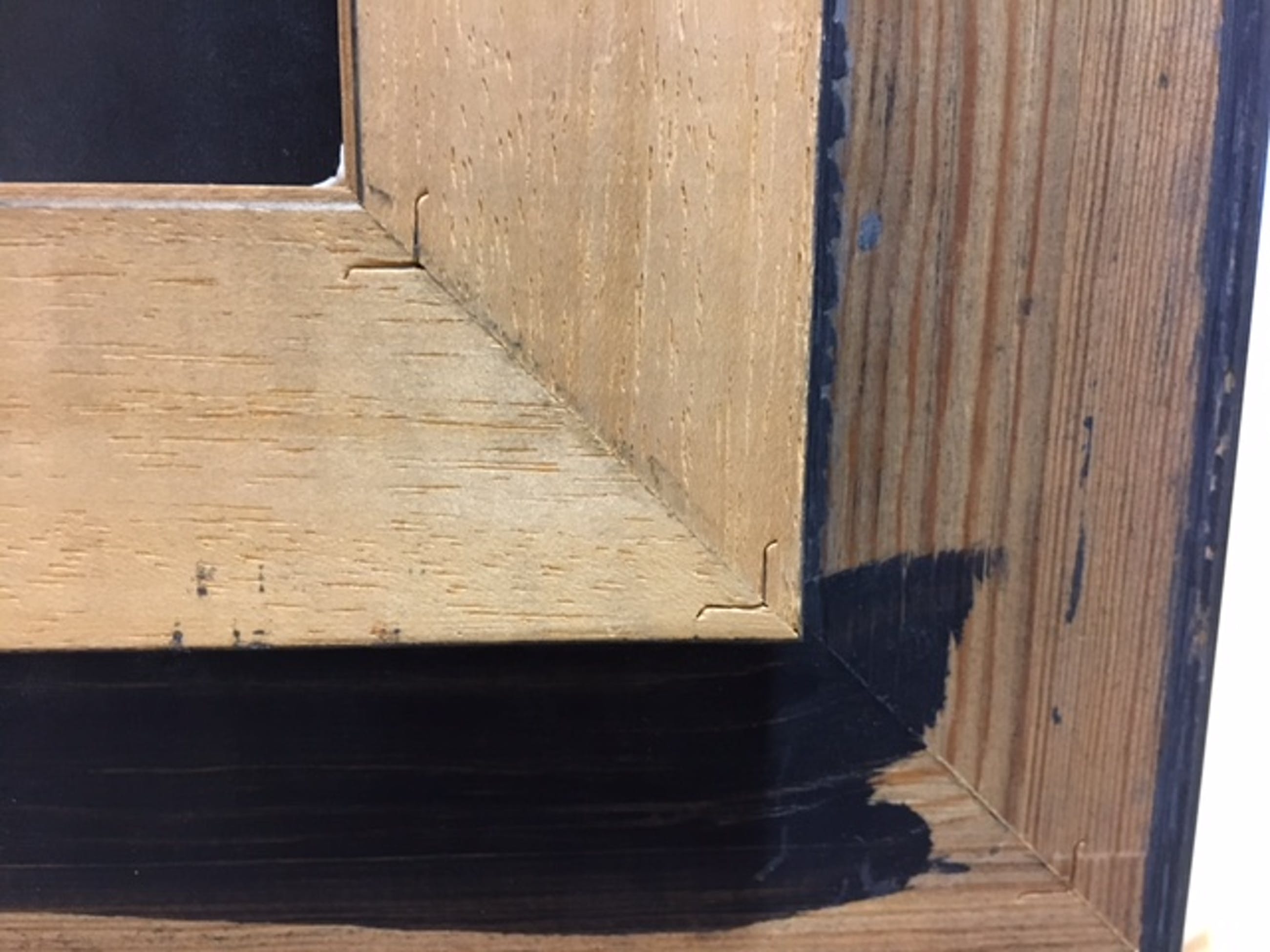 Alleen rechtsonder vertoont de lijst een kleine beschadiging in de mat zwarte lak.