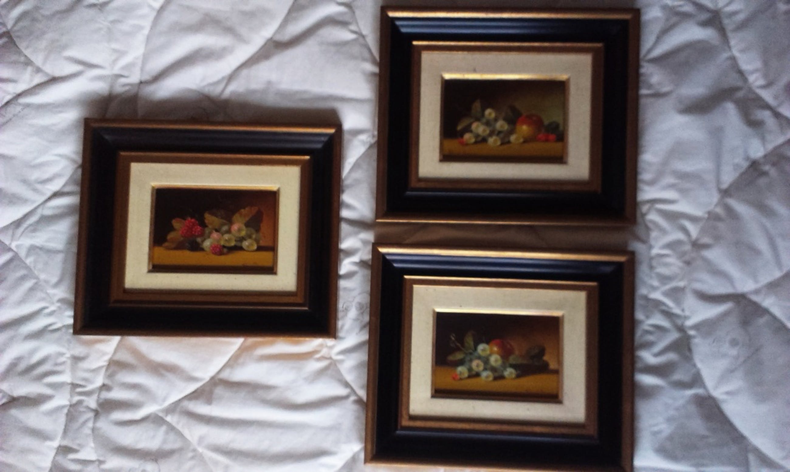 Drie prachtige stillevens, inclusief lijst. Prijs is setprijs. Afm. paneeltjes (dus zonder lijst) ongeveer 9 x 13 cm. Foto's zeggen genoeg.
