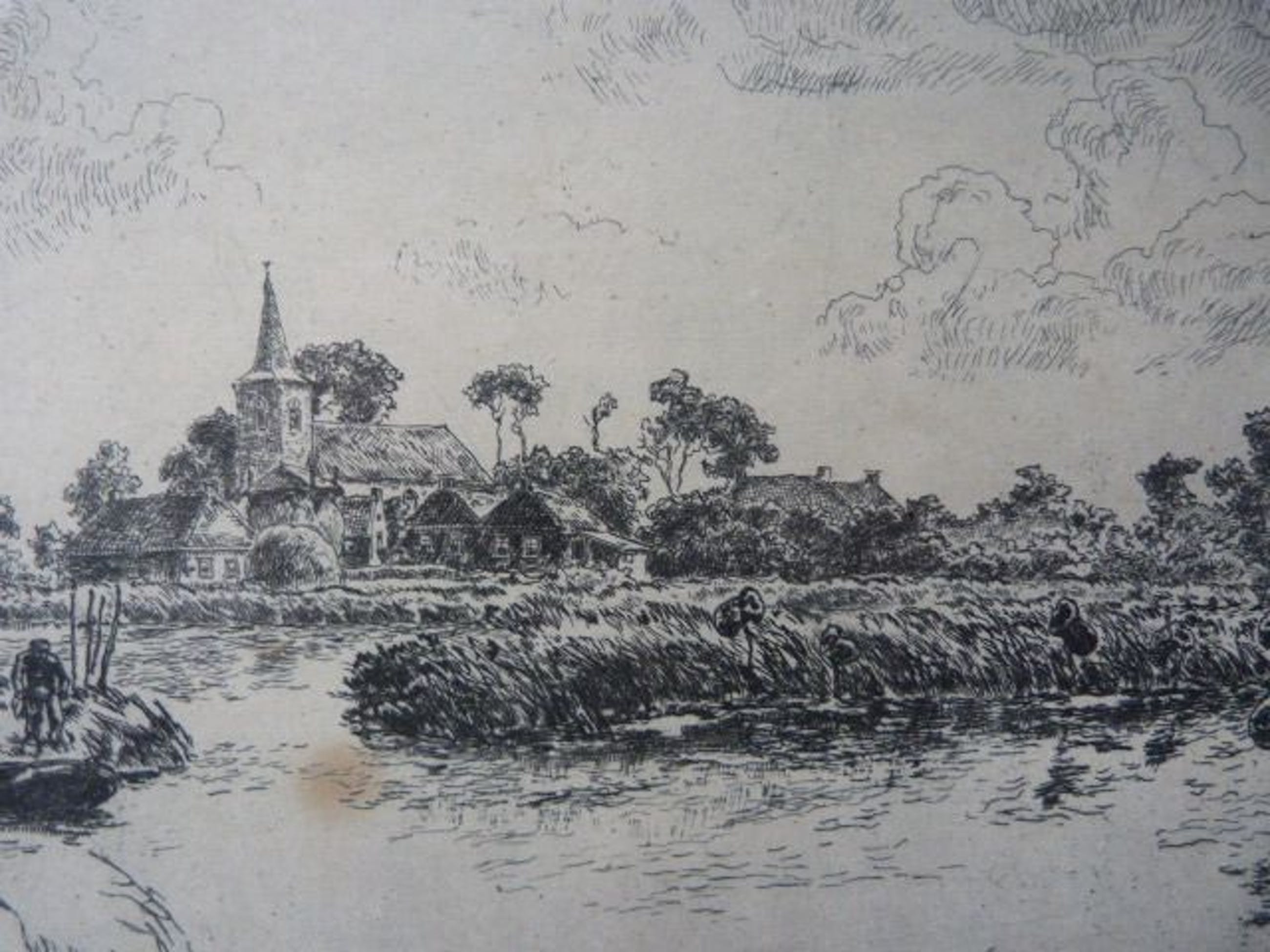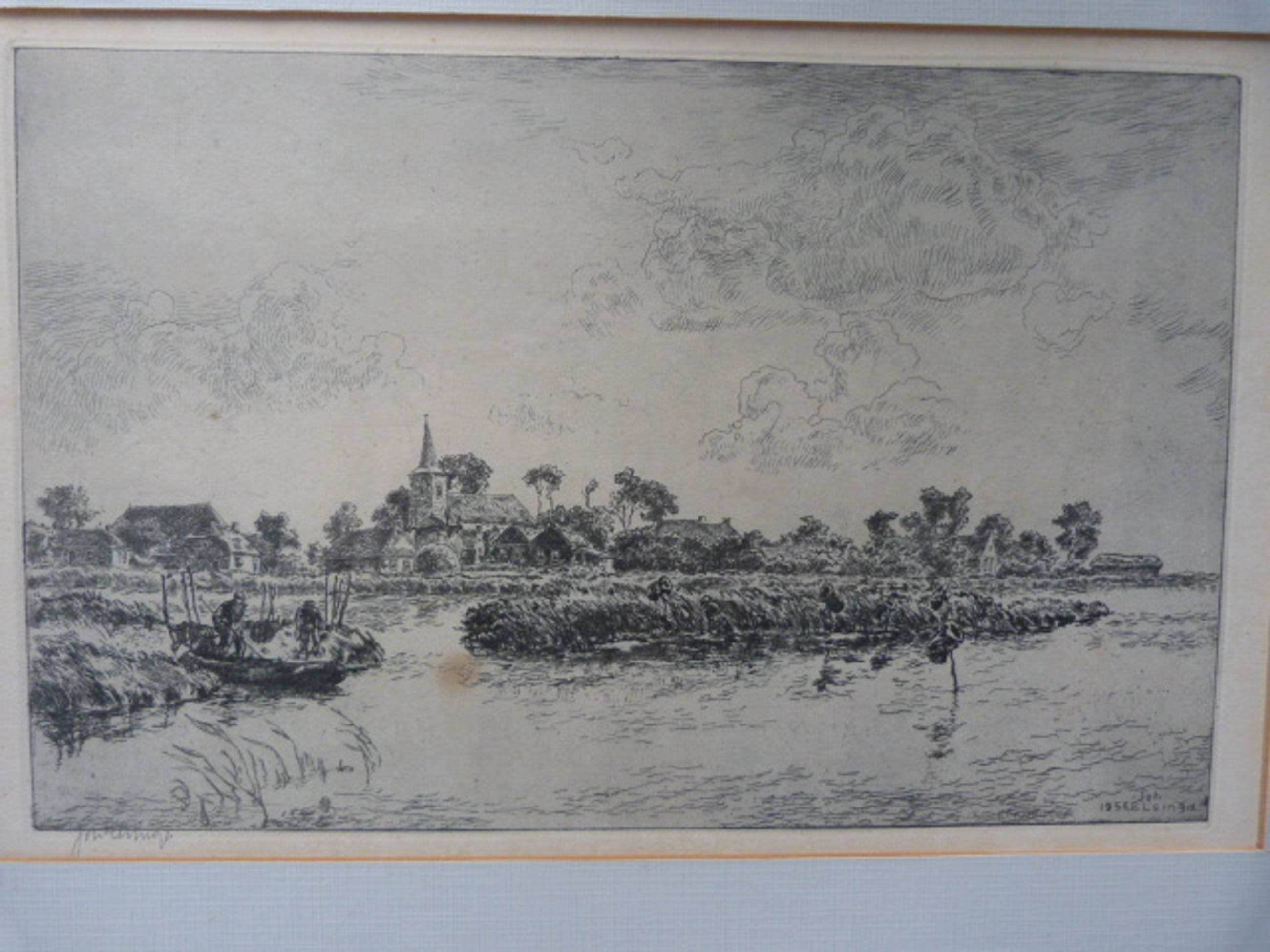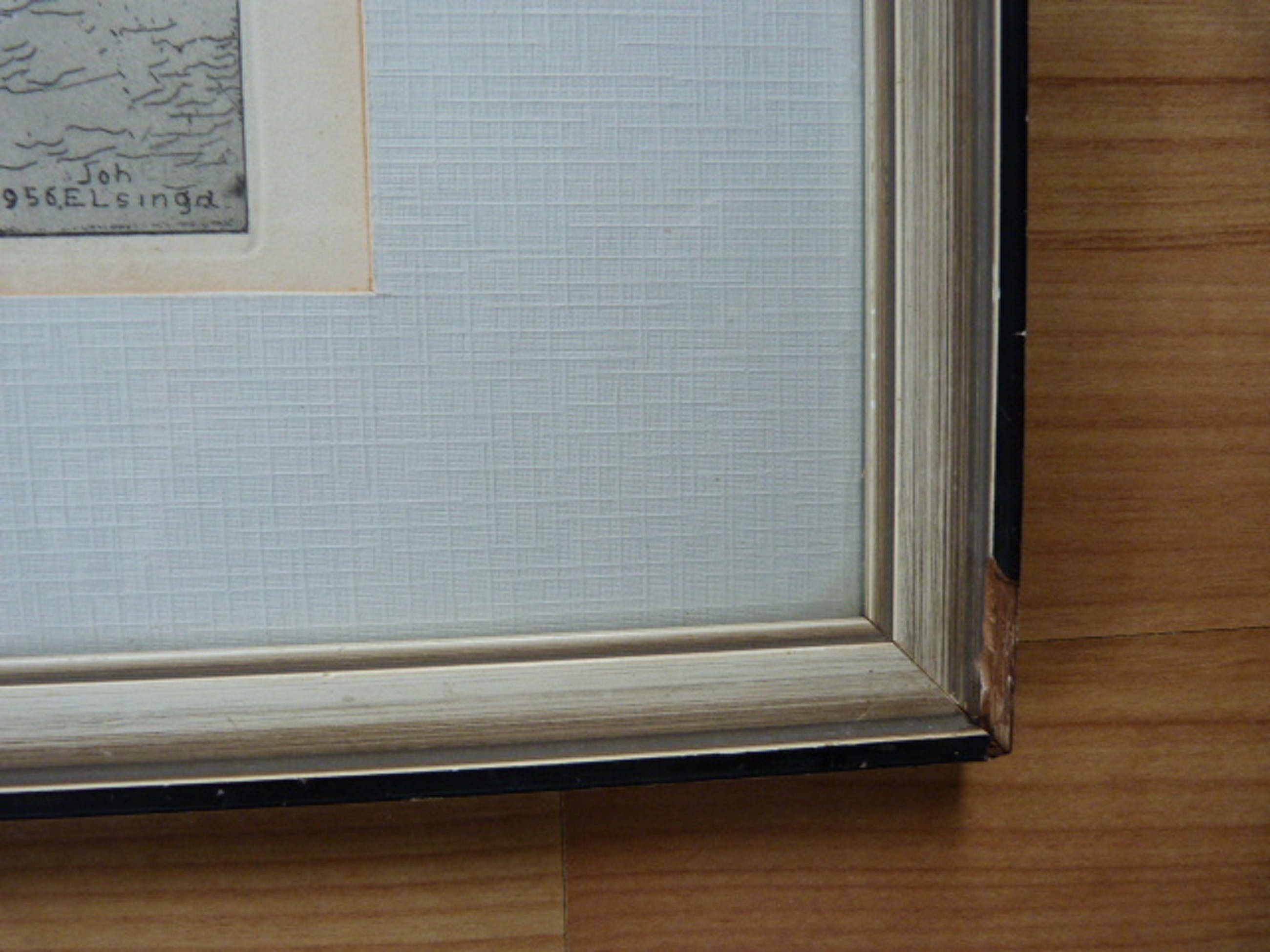 Ets is ingelijst met passe-partout en de originele lijst in licht / creme kleur van 2 cm.