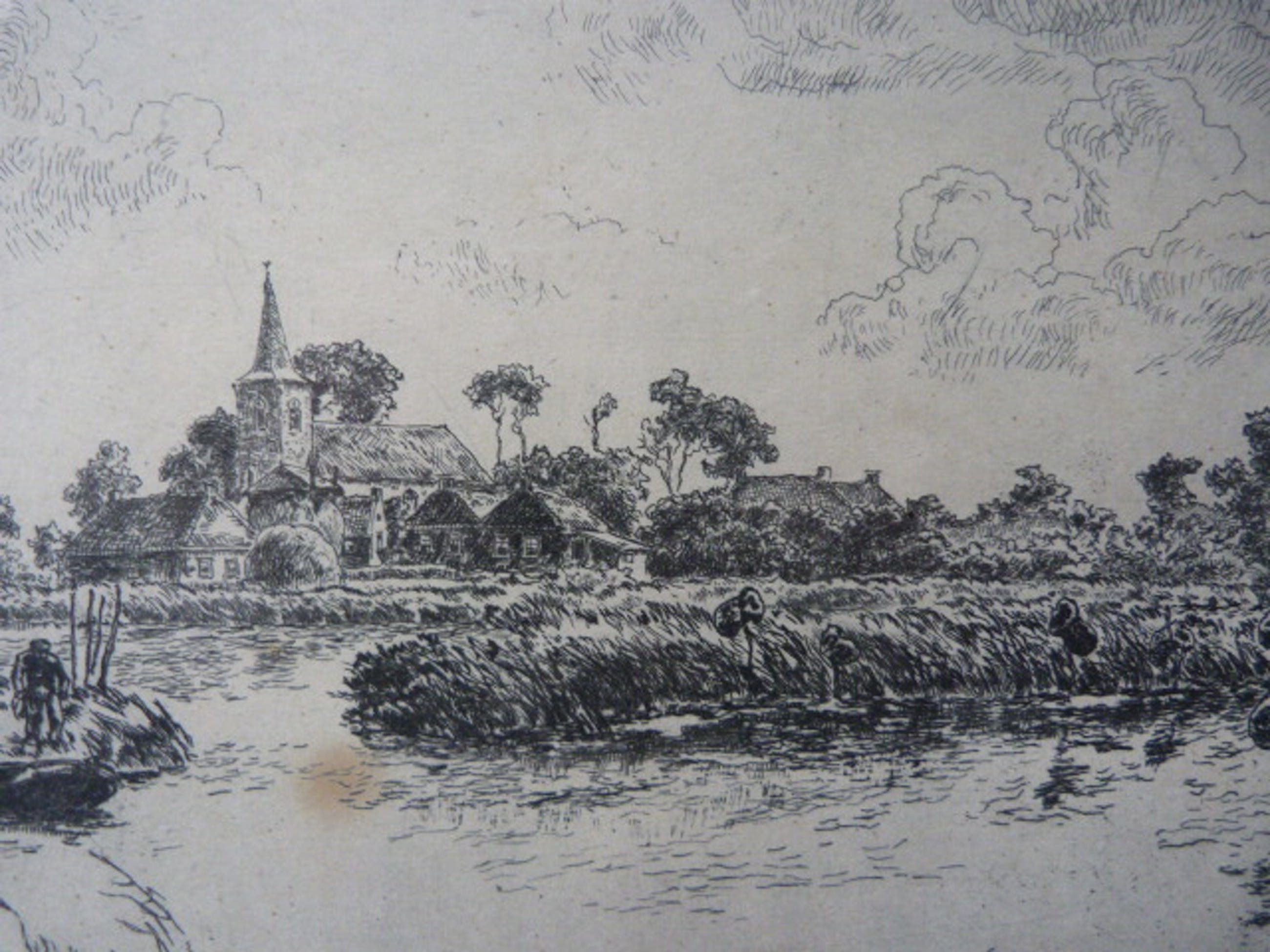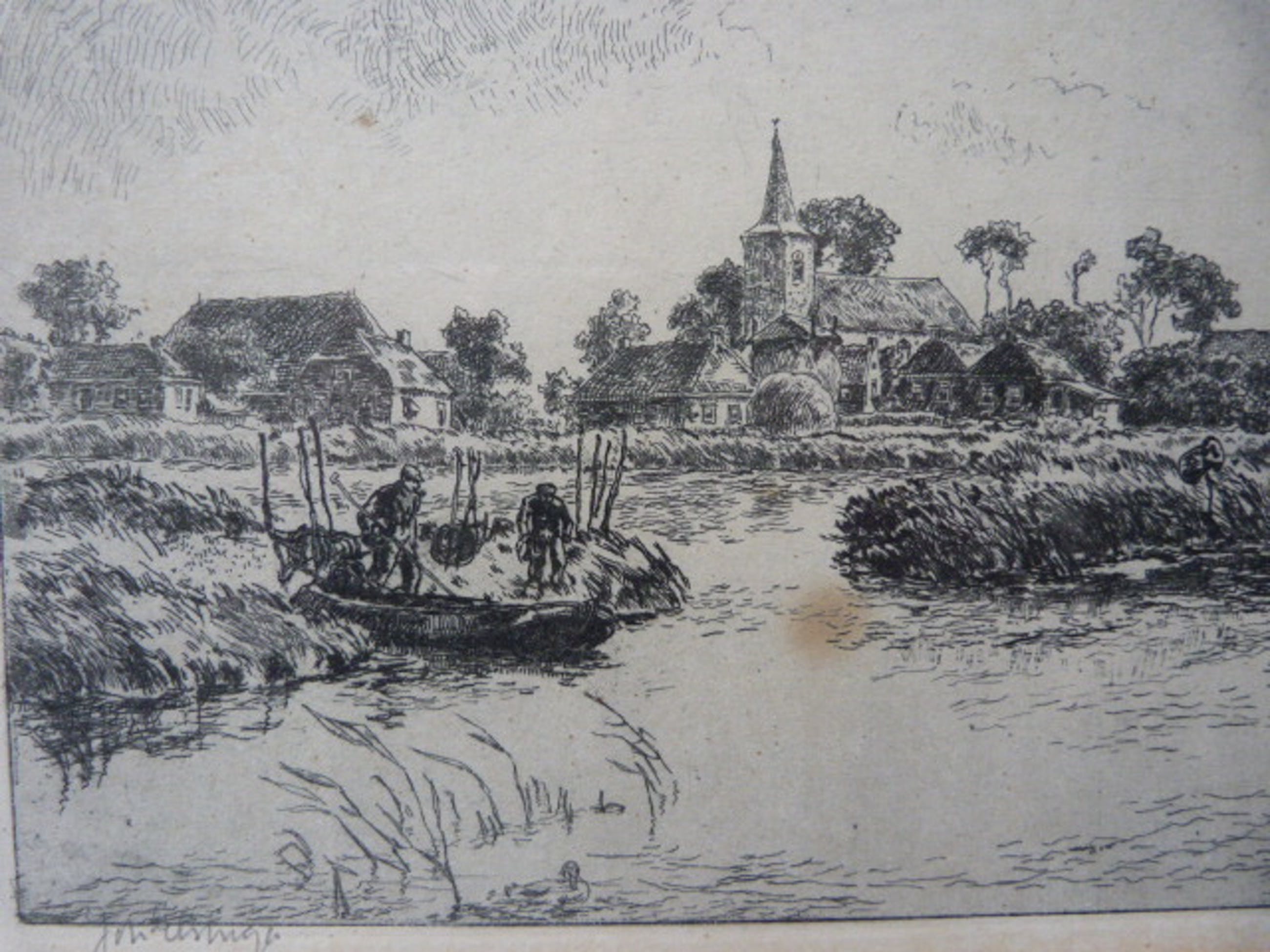 Ets van een fraai meertje met vissers in een boot bij een dorp, waarschijnlijk