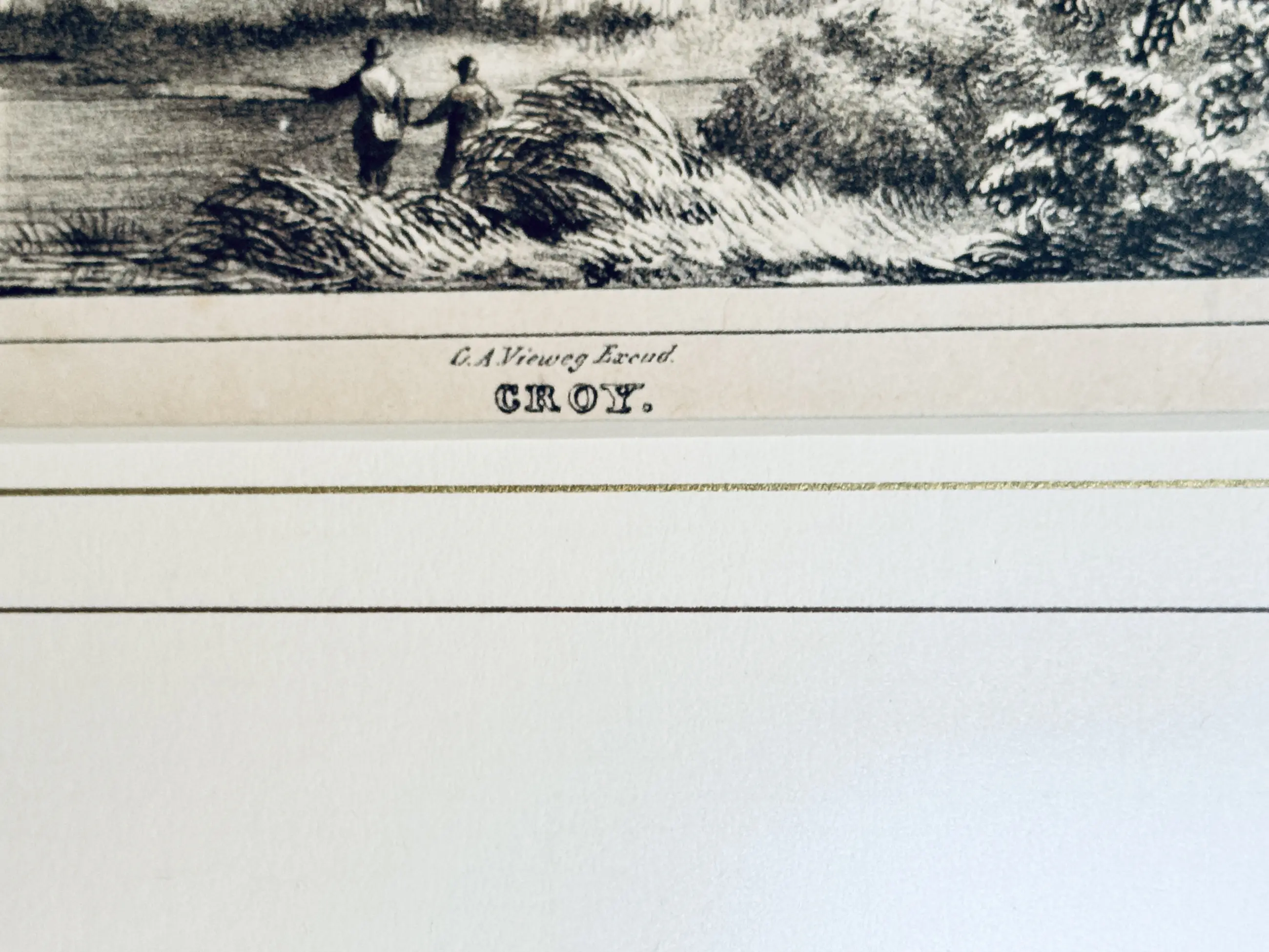 De voorstelling toont Kasteel Croy in romantische landschappelijke setting met waterpartij op de voorgrond en kleine figuren die schaal en levendigheid toevoegen. De architectuur is natuurgetrouw weergegeven maar licht geromantiseerd, typerend voor de romantische topografie rond 1840.