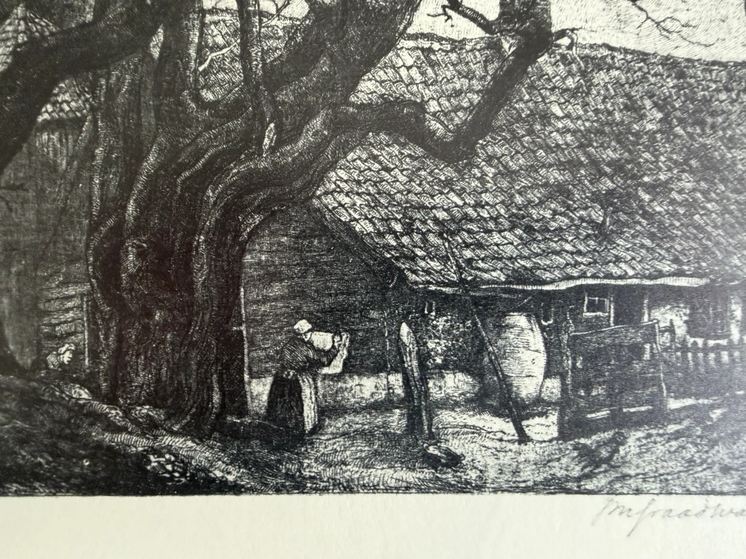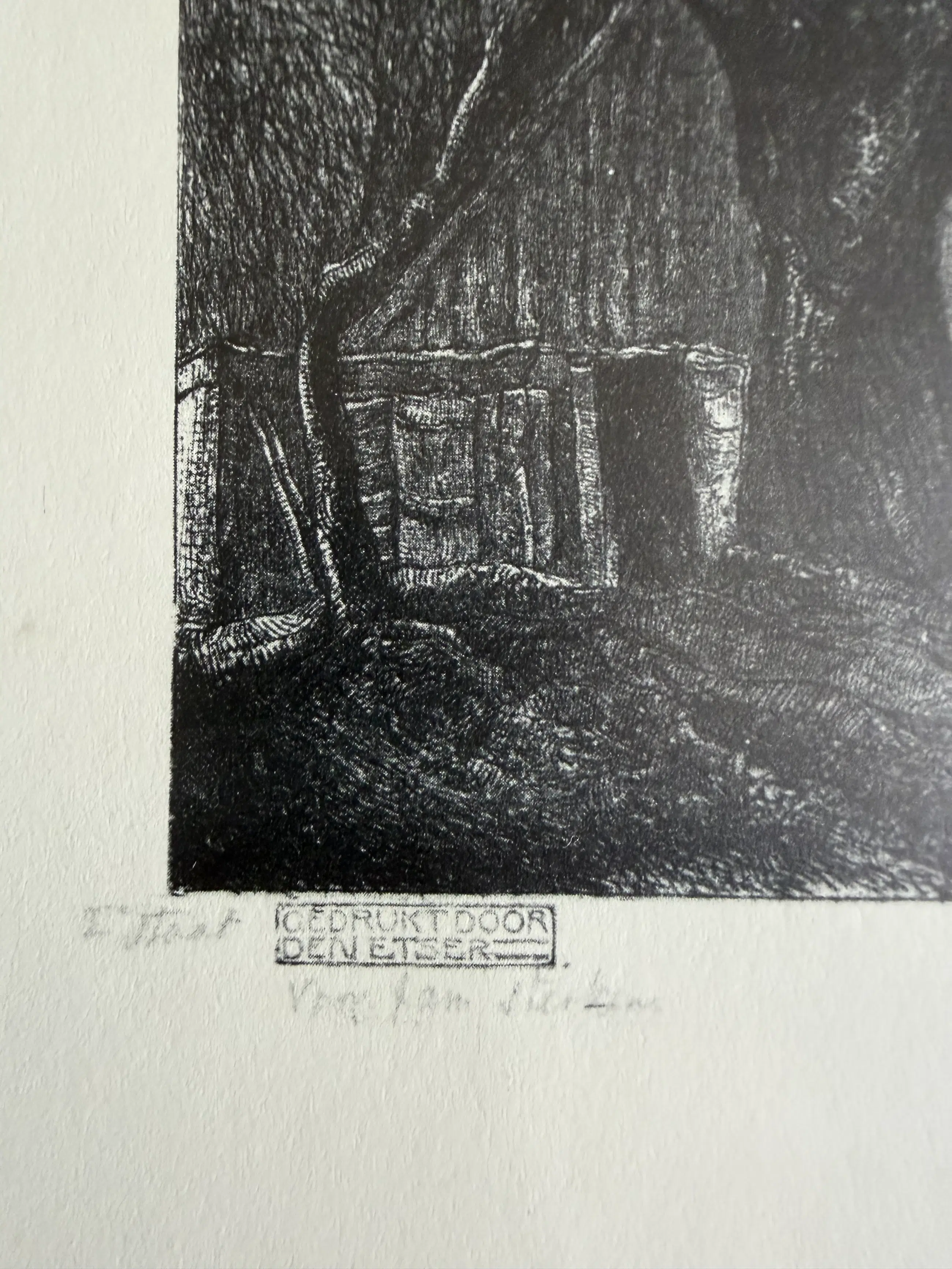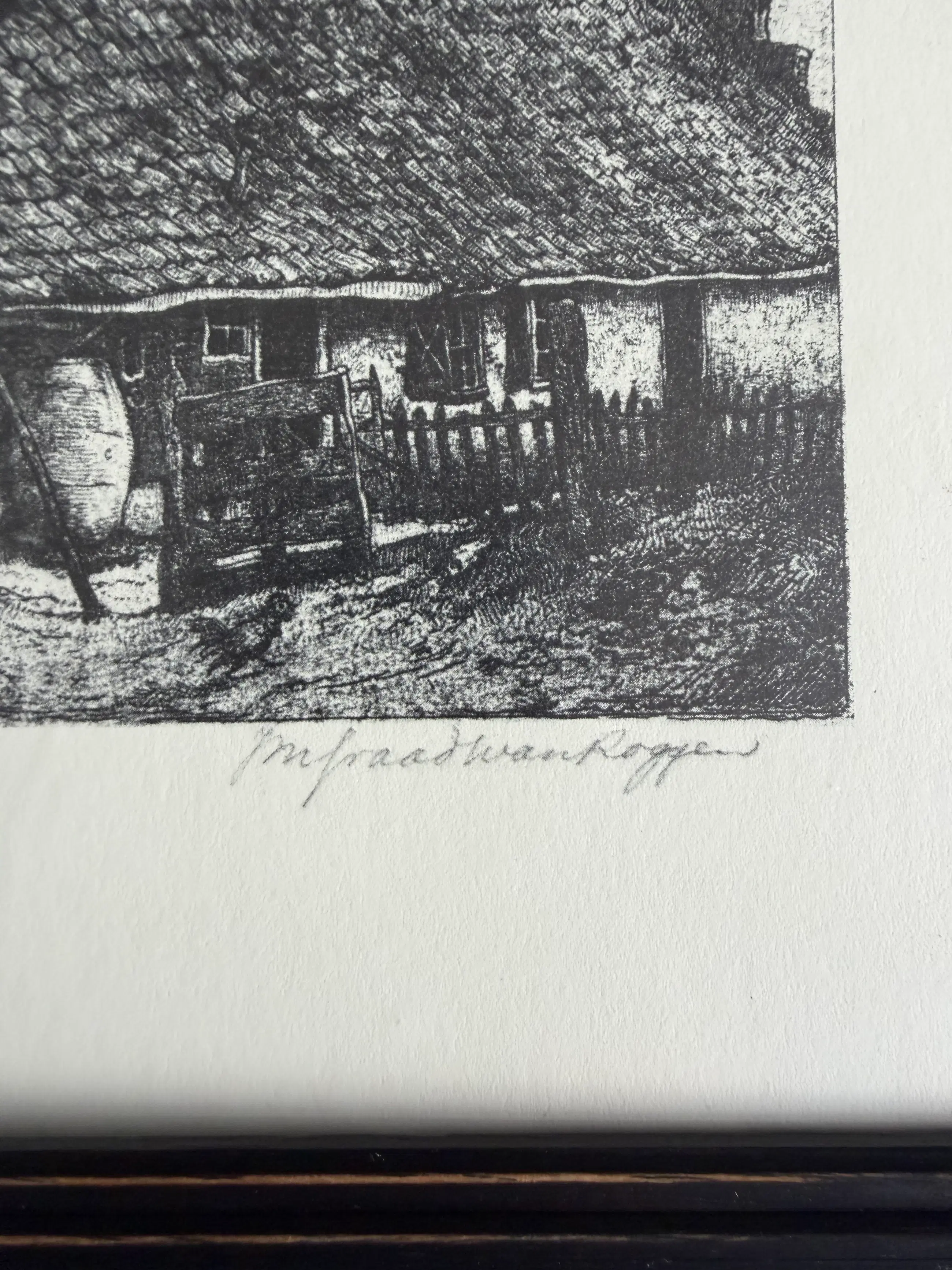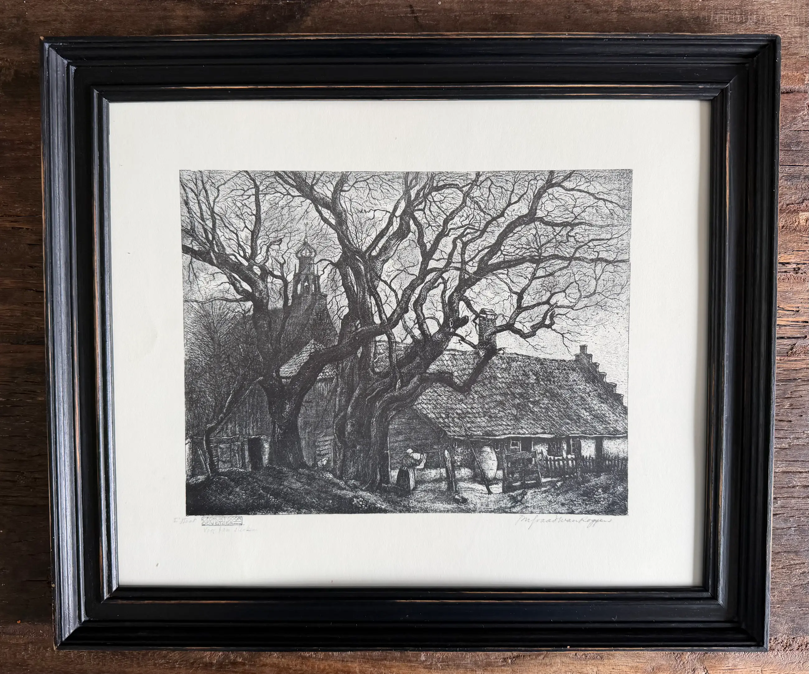 Mooie ets van Graadt van Roggen. Een boerderij in Bergen met op de achtergrond de ruïnekerk. Gedrukt door de etser. 2e staat. Voor fam ? (zie foto’s.) In mooi, bijpassend lijstje.