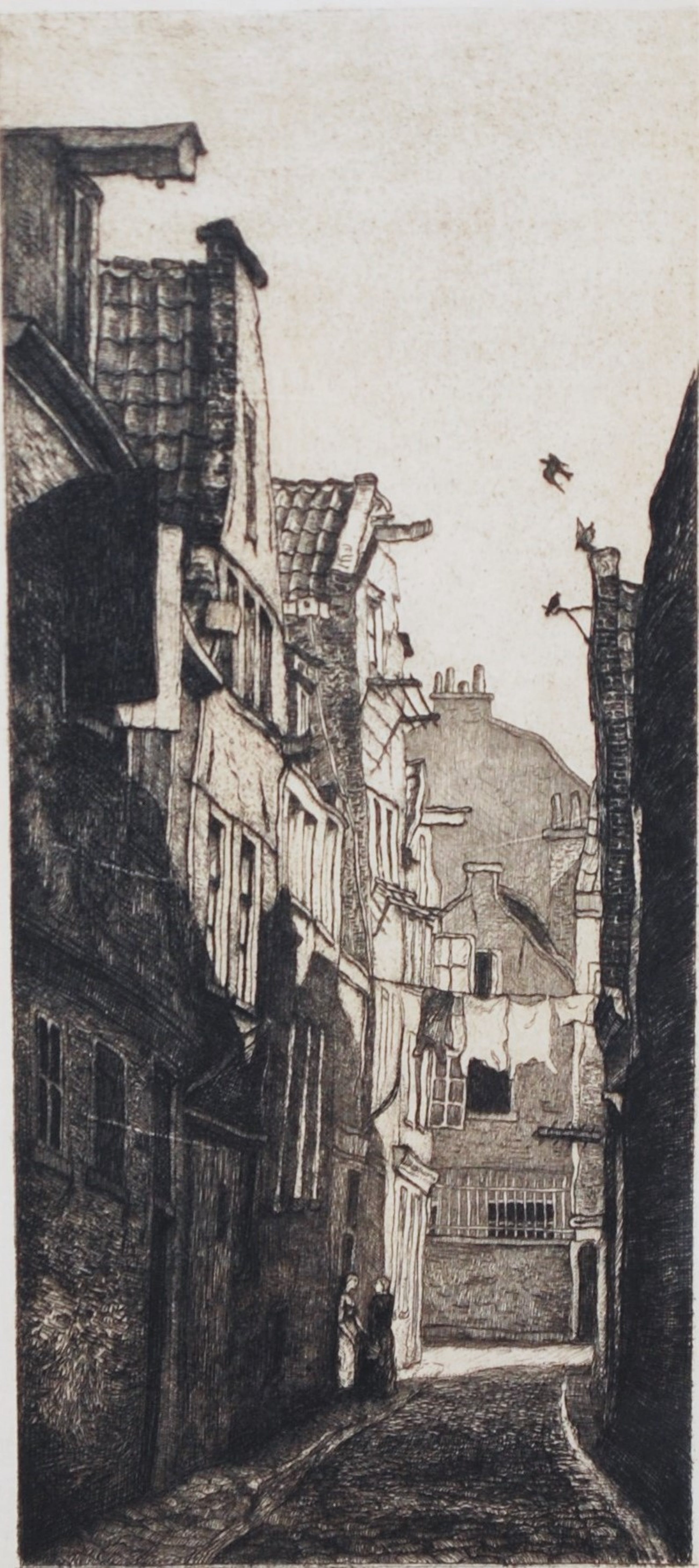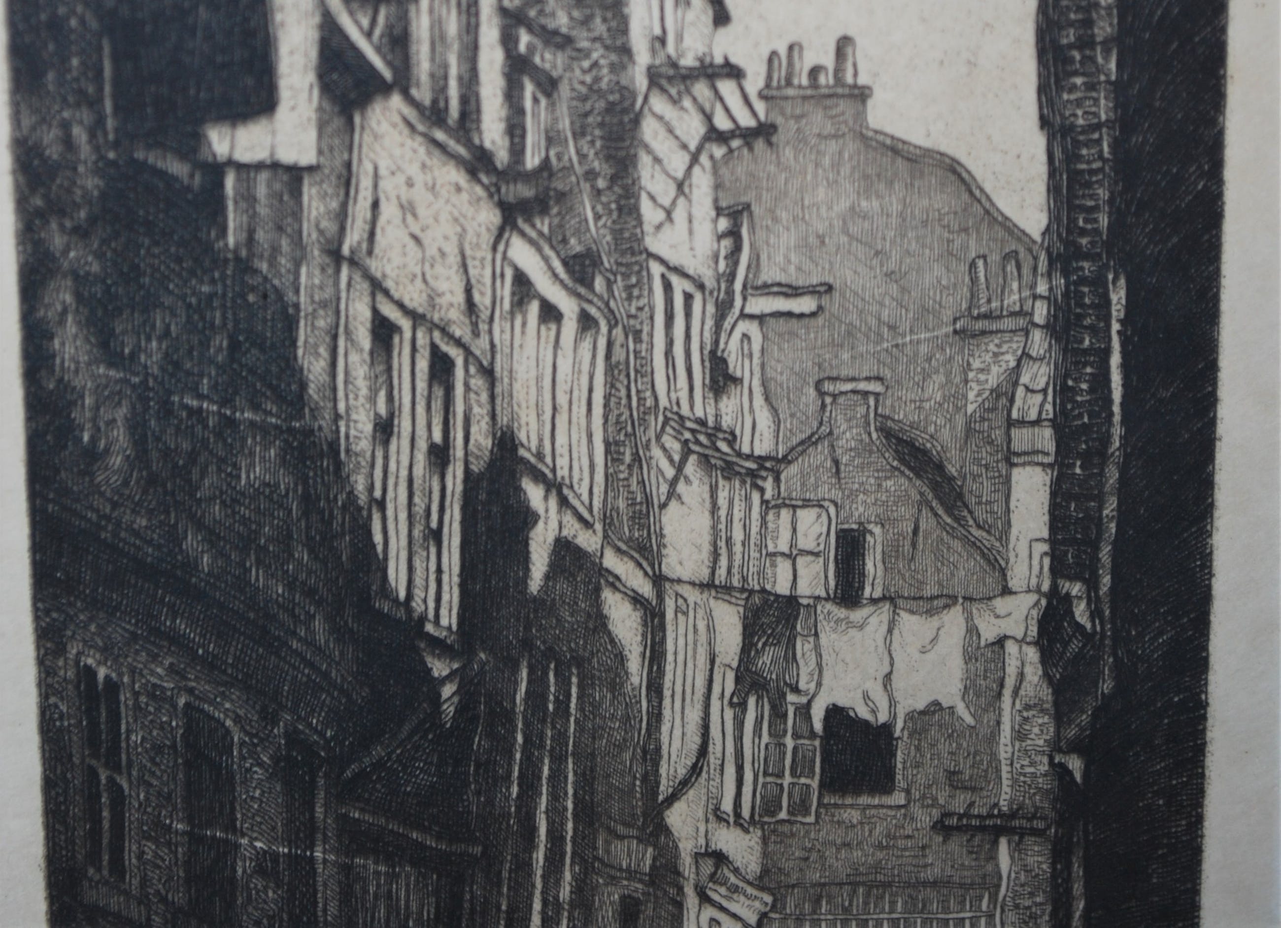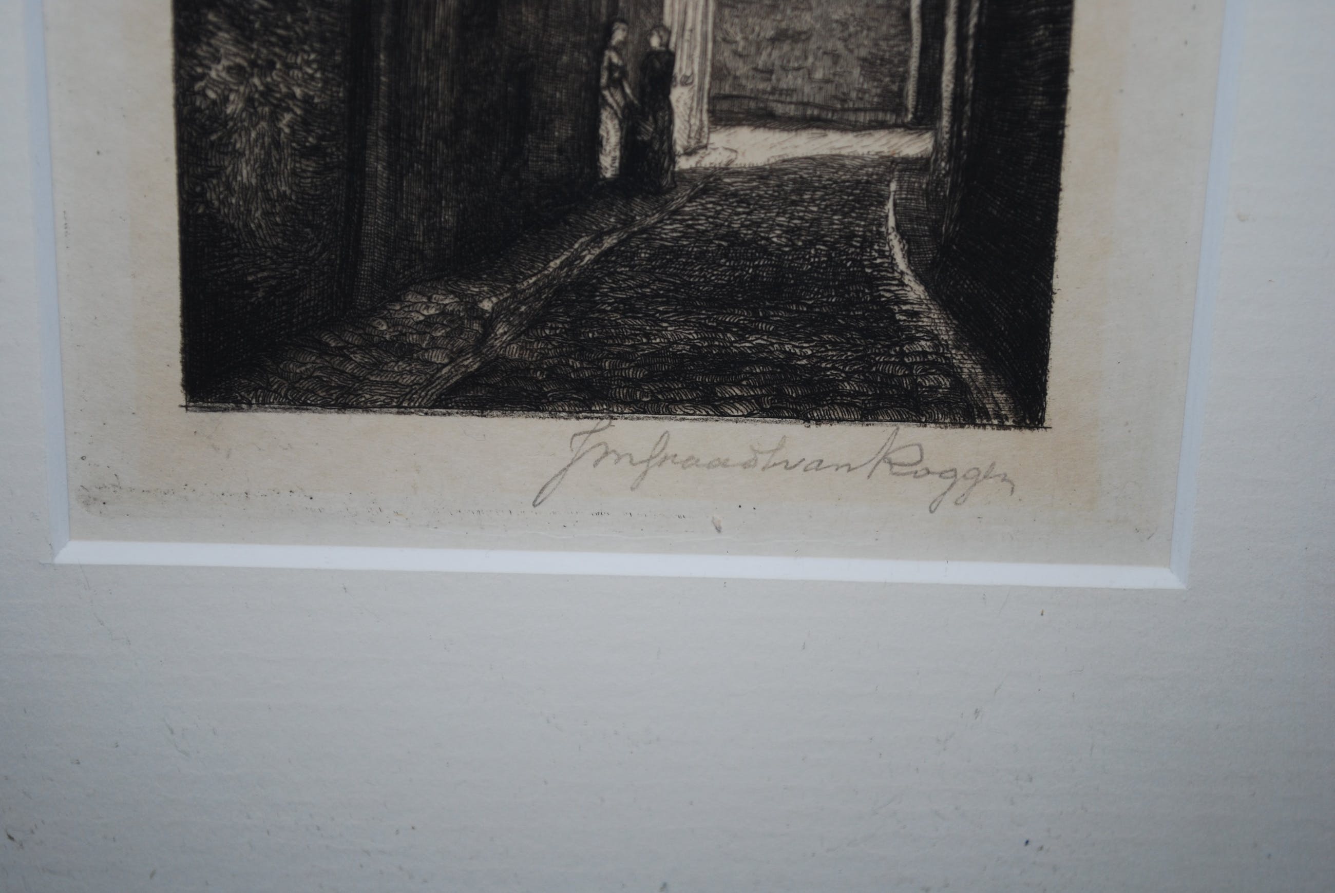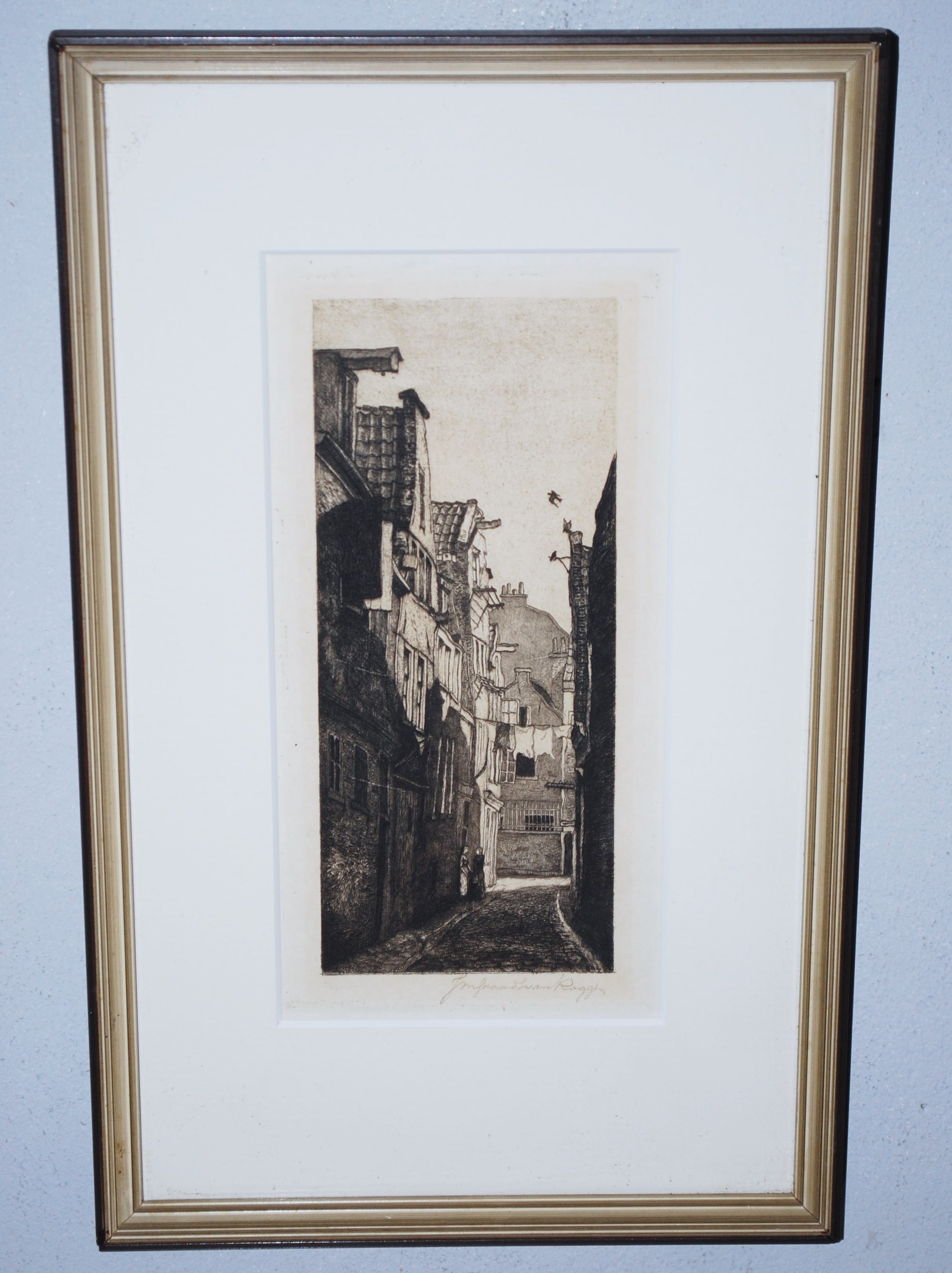 Achter passepartout en glas ingelijst. De lijst heeft enige hoekschades.